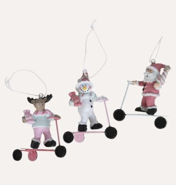 Este encantador colgante de patinete rosa para árbol, con medidas de 6,5 x 3 x 80 cm, es el adorno perfecto para darle un toque festivo a tu hogar. Disponible en tres modelos: un reno, un muñeco de nieve y Santa, cada personaje navideño en patinete aportará un toque de alegría y diversión a tu decoración navideña.