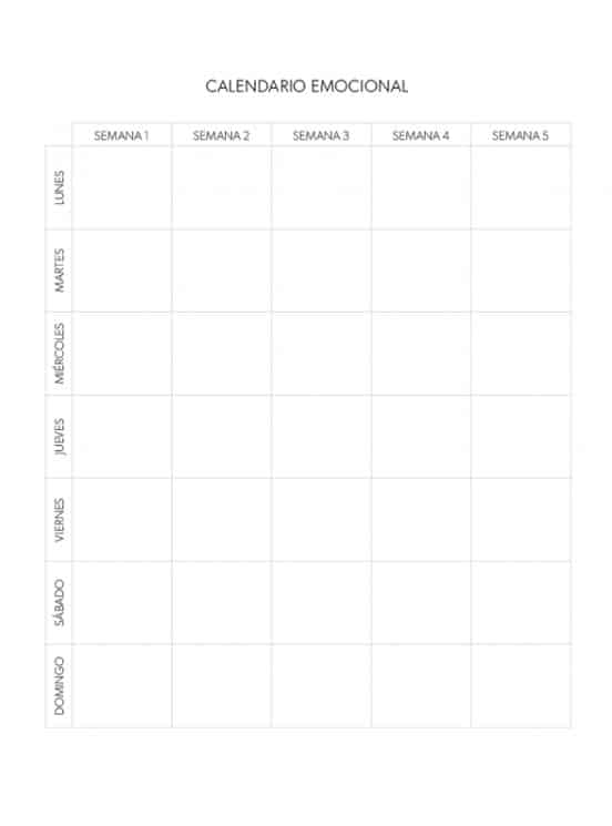 * Un calendario emocional donde registrar cómo te has sentido durante el día. Rellenarlo te ayudará a tener una visión general de cómo ha sido tu estado de ánimo durante cada mes. De esta manera, podrás tener una perspectiva de cómo estás a nivel emocional y detectar aspectos a mejorar.
