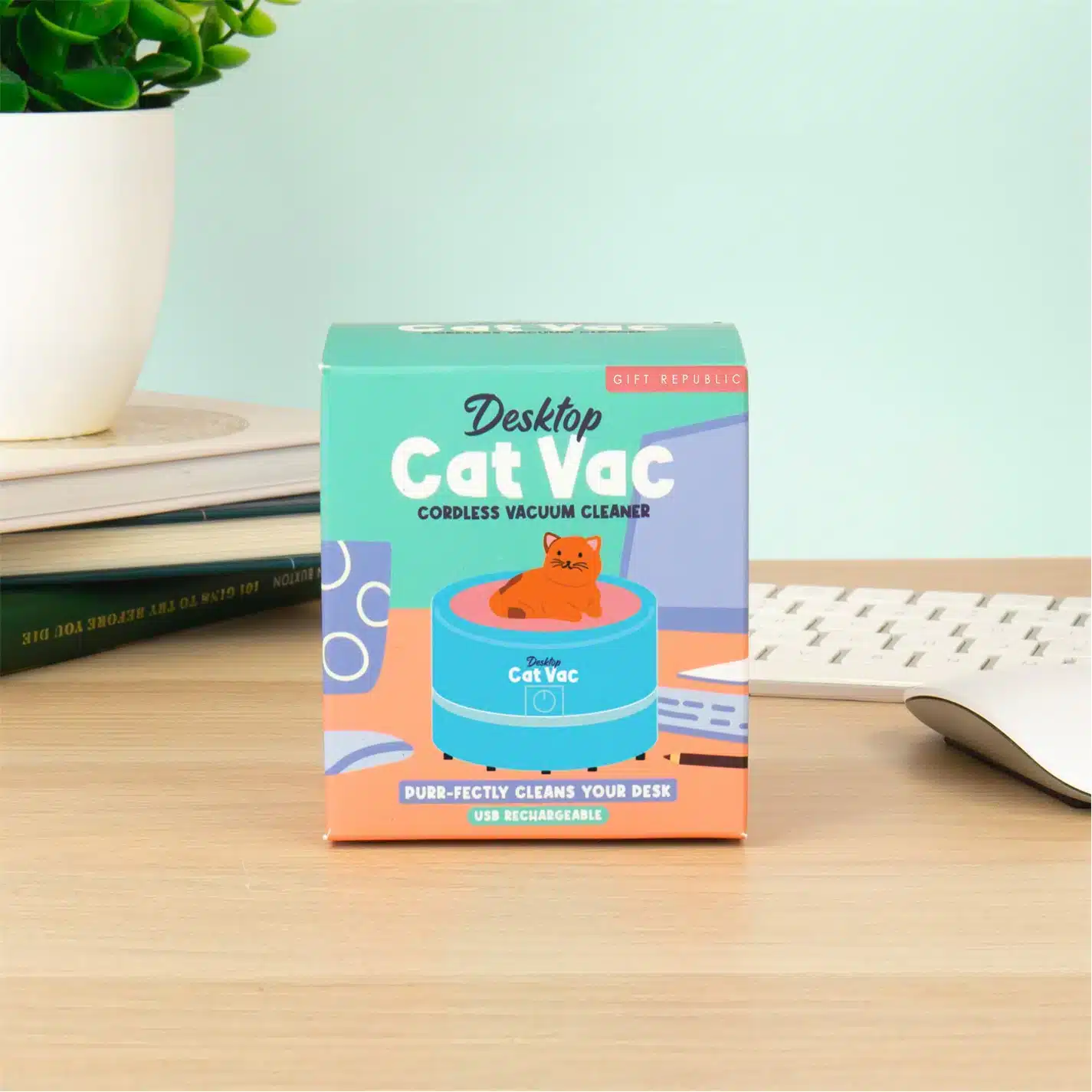 La Cat Vac es una mini aspiradora de escritorio con forma de gatito que combina funcionalidad y diversión. Compacta, ligera y fácil de usar, elimina migas, polvo y pequeños restos en segundos. Perfecta para escritorios, teclados o cualquier rincón donde se acumule suciedad.