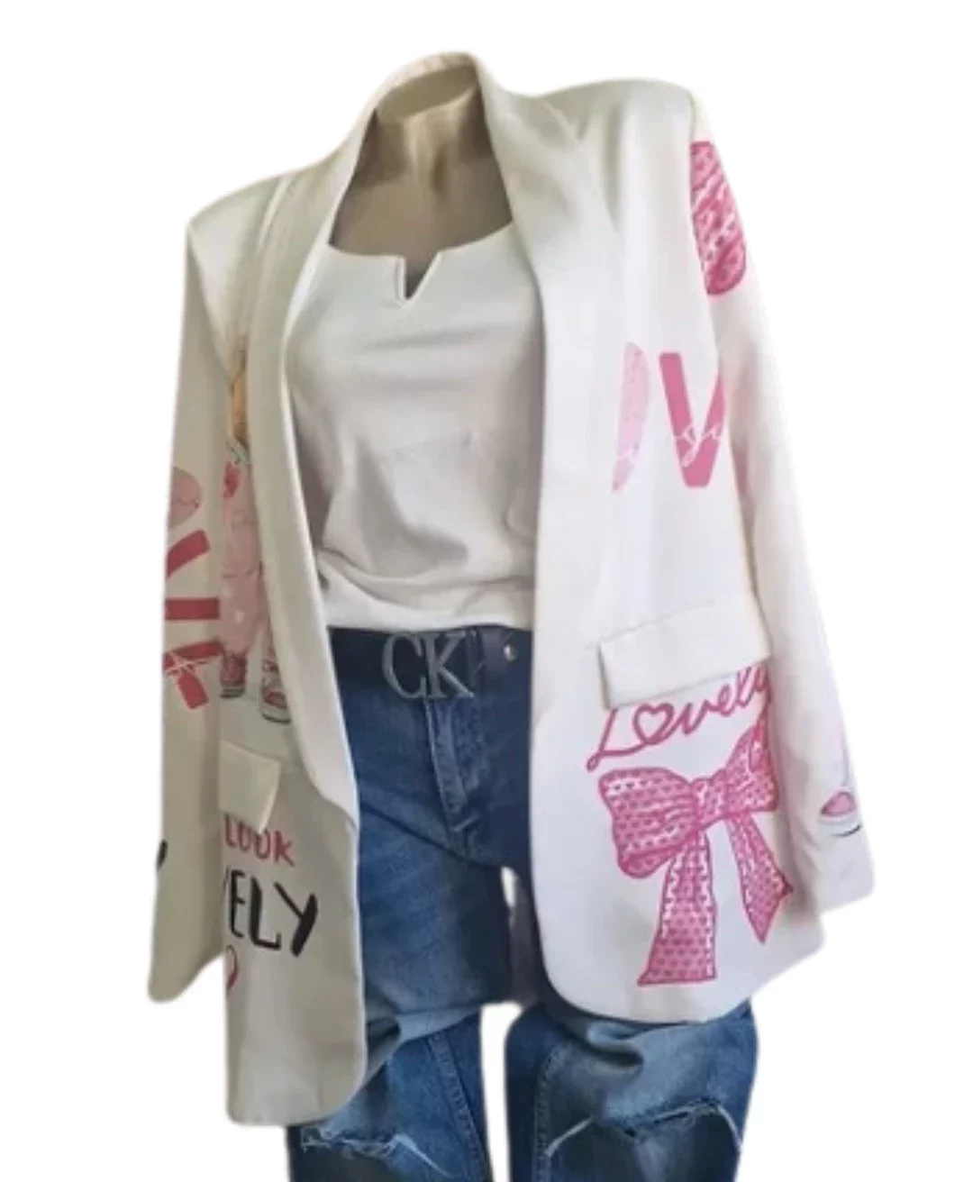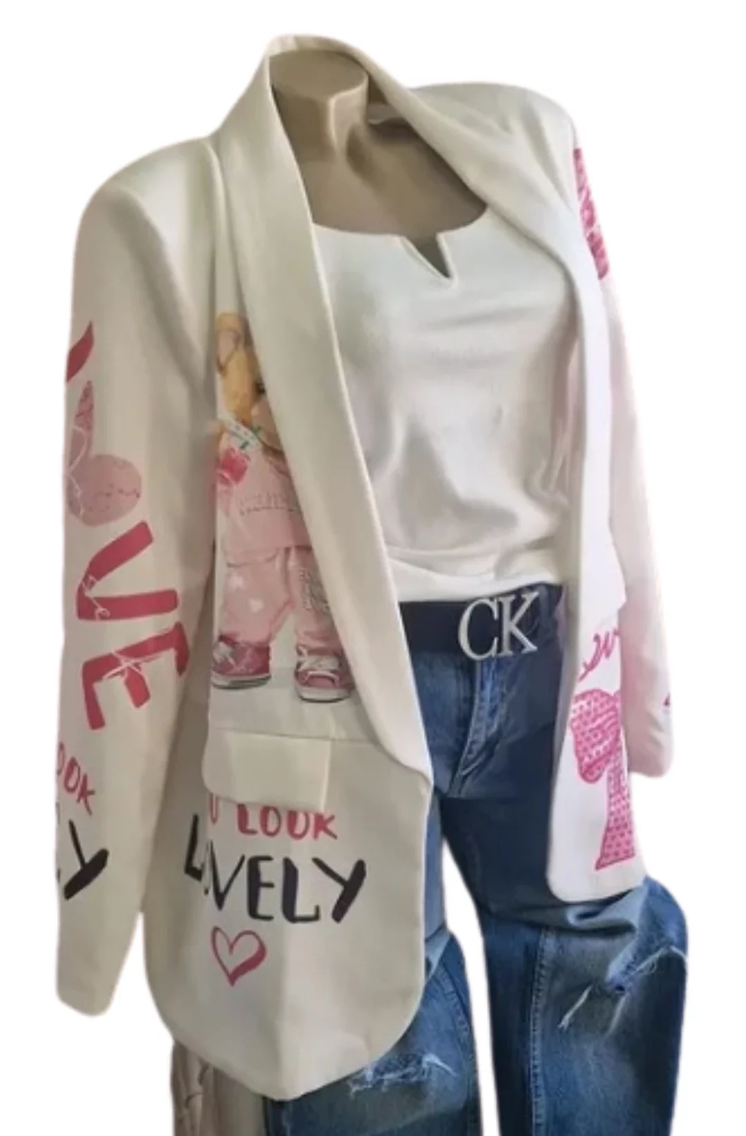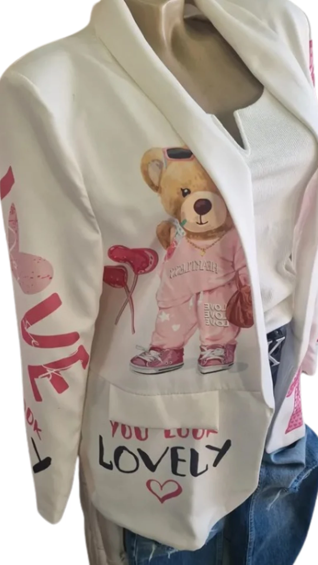 Esta blazer blanca es una prenda única y moderna, perfecta para quienes buscan un estilo casual pero con un toque divertido y original. Su diseño destaca por una ilustración de un tierno oso de peluche vestido con ropa deportiva en tonos rosas, acompañado de detalles en rojo y negro que realzan su encanto. Además, cuenta con frases como «You look lovely», que le dan un aire juvenil y positivo.
