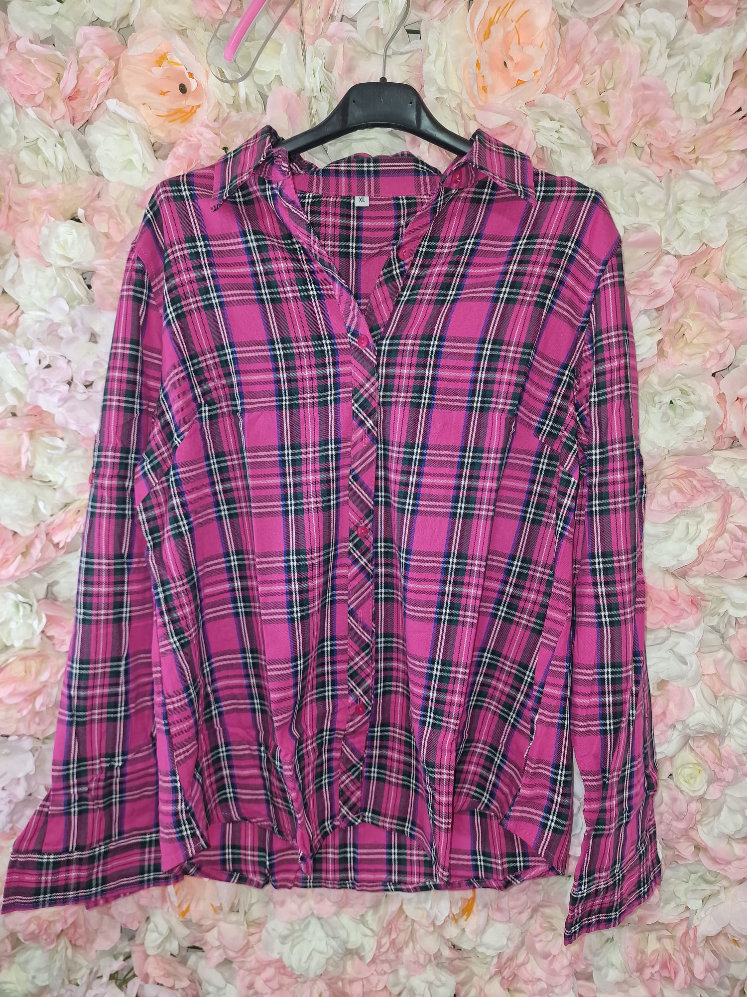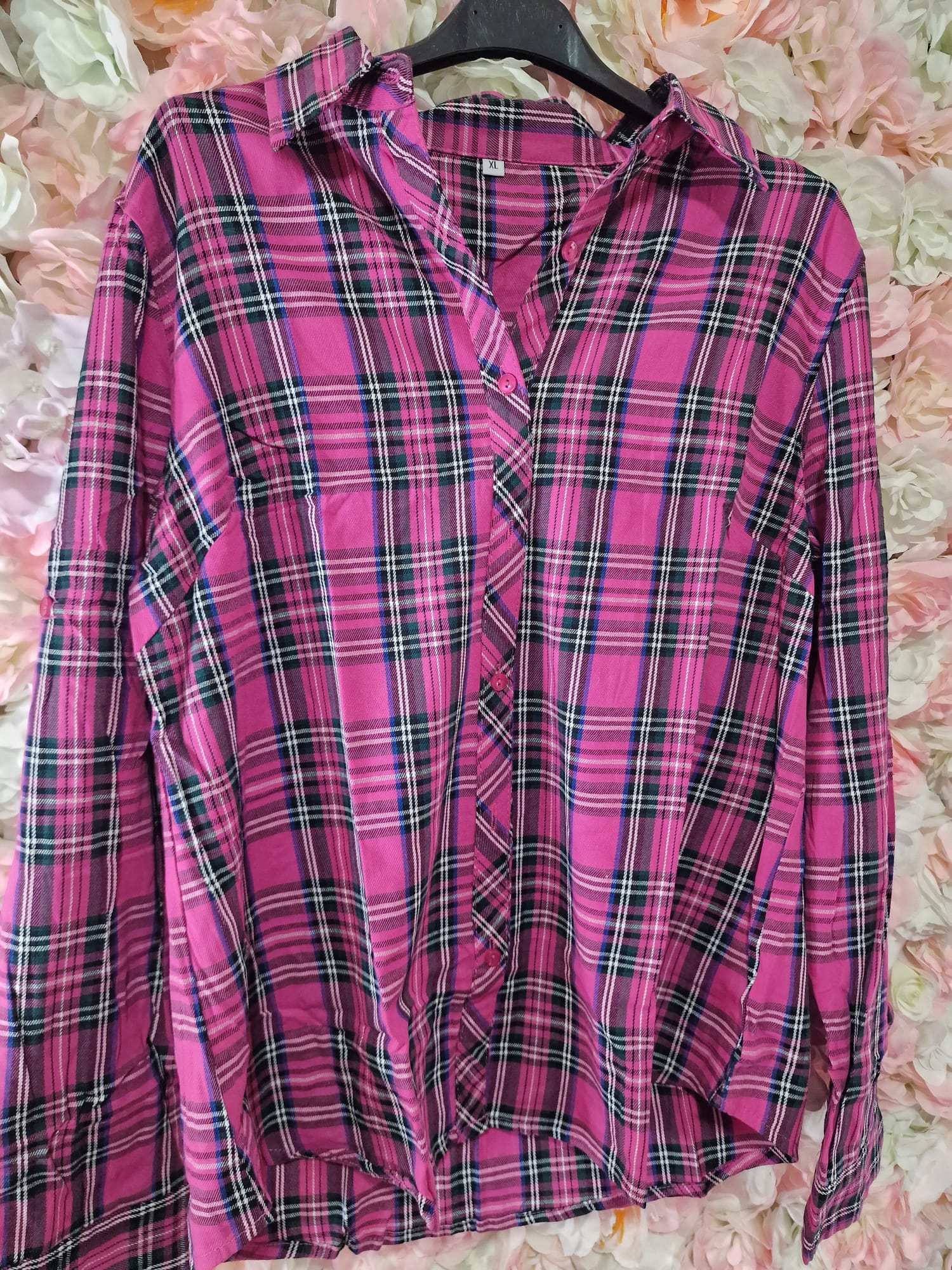 Hermosa camisa ideal para uso diario, con estampado de cuadros de vichy en tonos fucsias y oscuros. Abotonada. Ideal para las tardes de otoño – invierno.