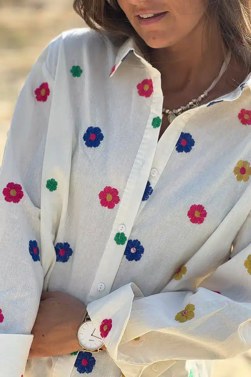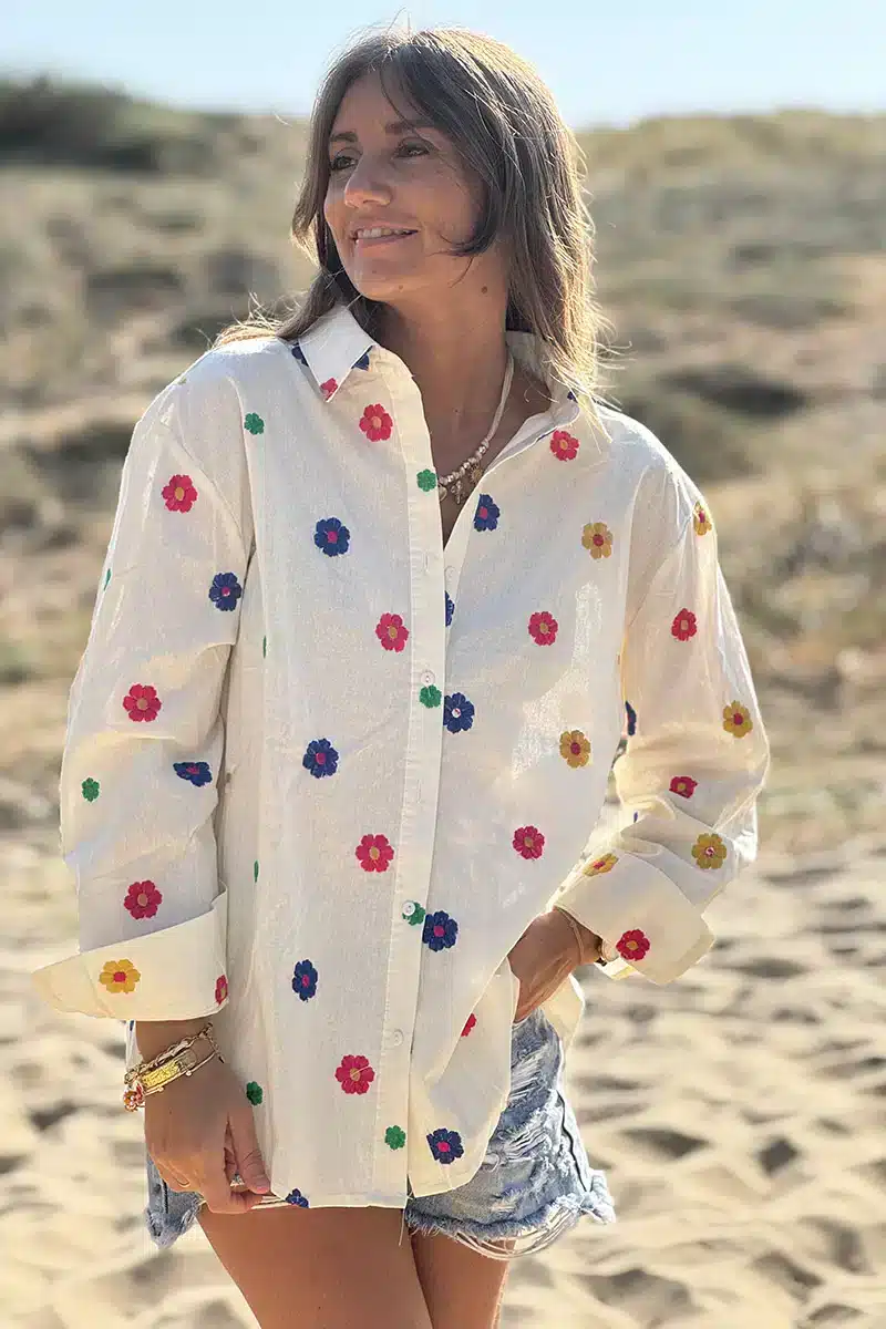 Dale un toque fresco y alegre a tu look con nuestra camisa de algodón color crudo adornada con bordados de pequeñas flores multicolor. Su diseño oversize y ligero la convierte en una prenda comodísima, perfecta para llevar tanto cerrada como sobre una camiseta o vestido.