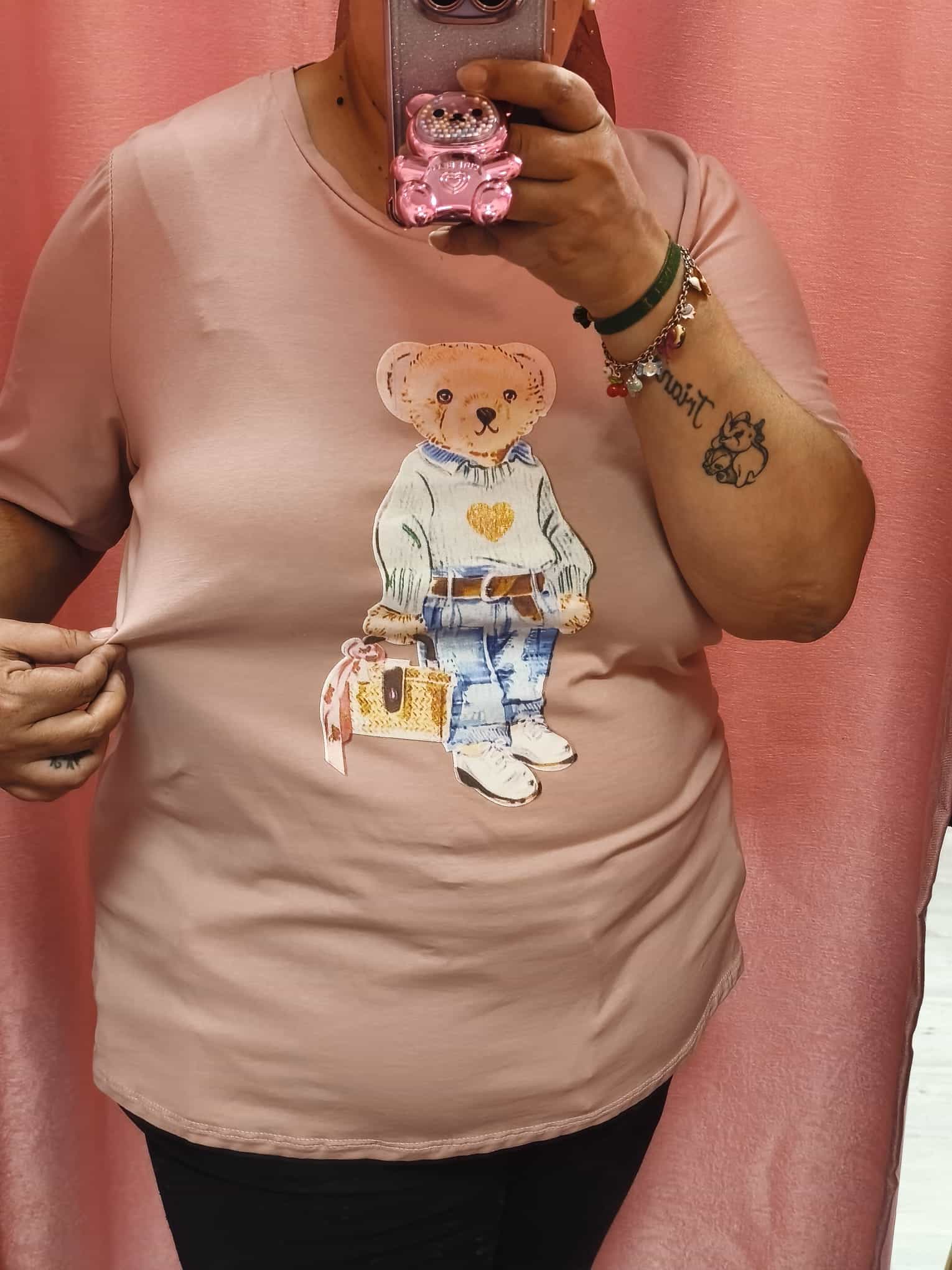 Su color rosa nude es súper favorecedor y combina perfecto con jeans, leggins o shorts. El estampado central de osito con detalles en dorado le da un aire dulce, moderno y original que te hará destacar. ?