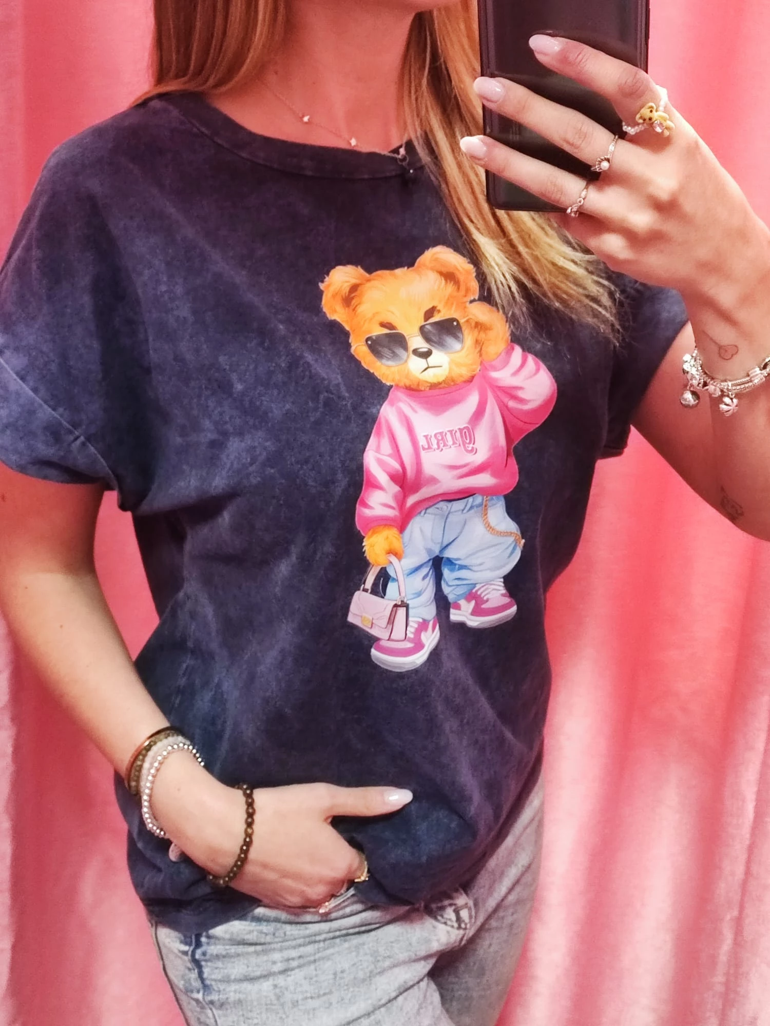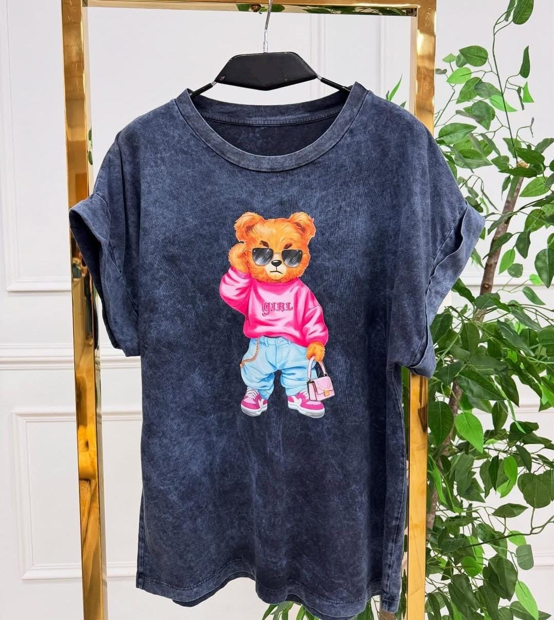 Está confeccionada en un tejido de algodón suave con efecto desgastado en tono negro, lo que le da un aire vintage y moderno a la vez. Su diseño principal es una ilustración vibrante de un tierno oso con un look streetwear: sudadera rosa con la palabra «GIRL», jeans holgados, zapatillas deportivas y accesorios como gafas de sol y bolso, reflejando una actitud cool y desenfadada.
