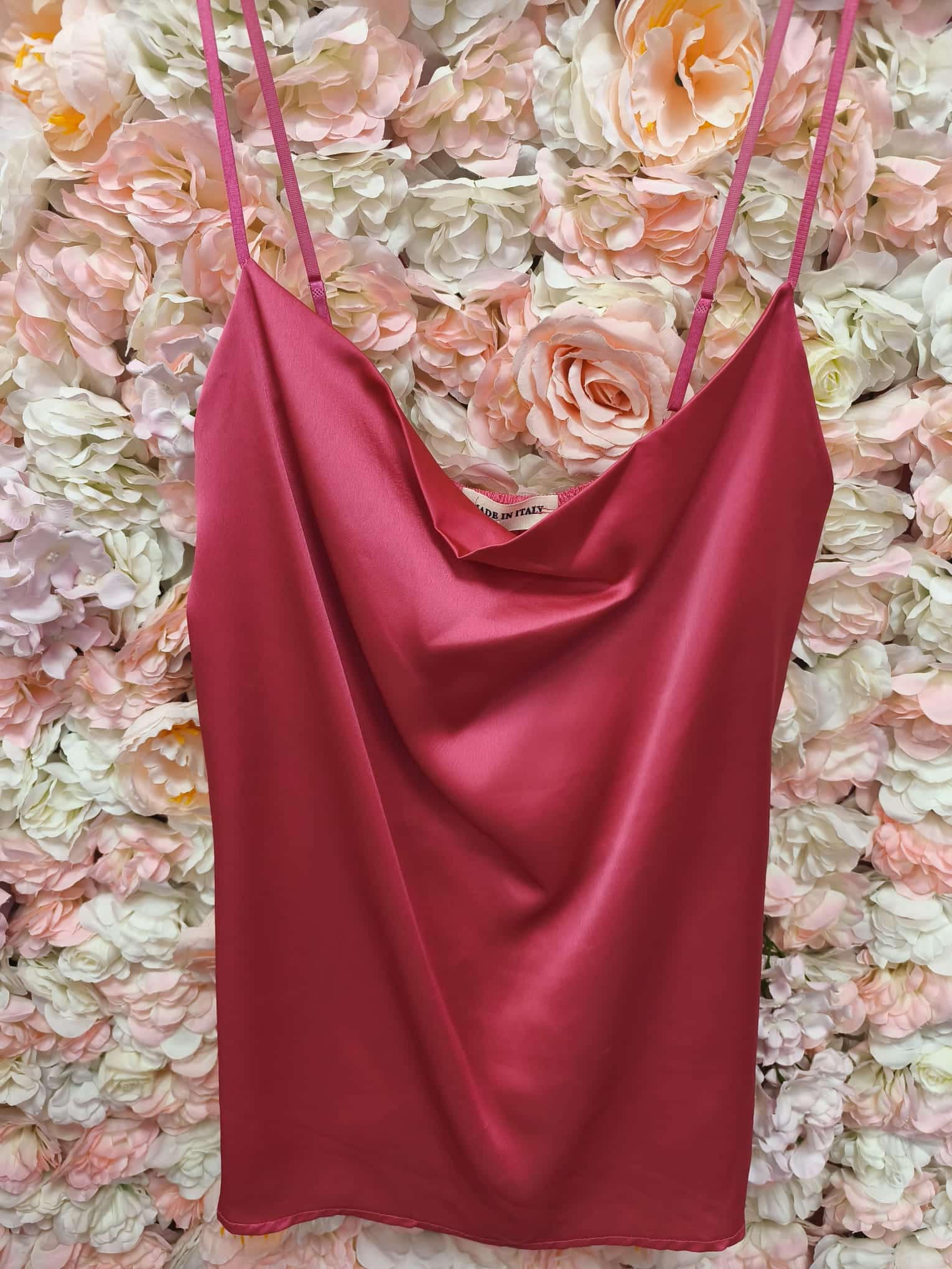 Esta camiseta tipo satén en tono fucsia es perfecta para realzar tu figura con un toque sofisticado y femenino. Su diseño con efecto caído en el pecho aporta movimiento y elegancia, mientras que los tirantes delgados y ajustables te permiten adaptarla a tu medida para mayor comodidad.