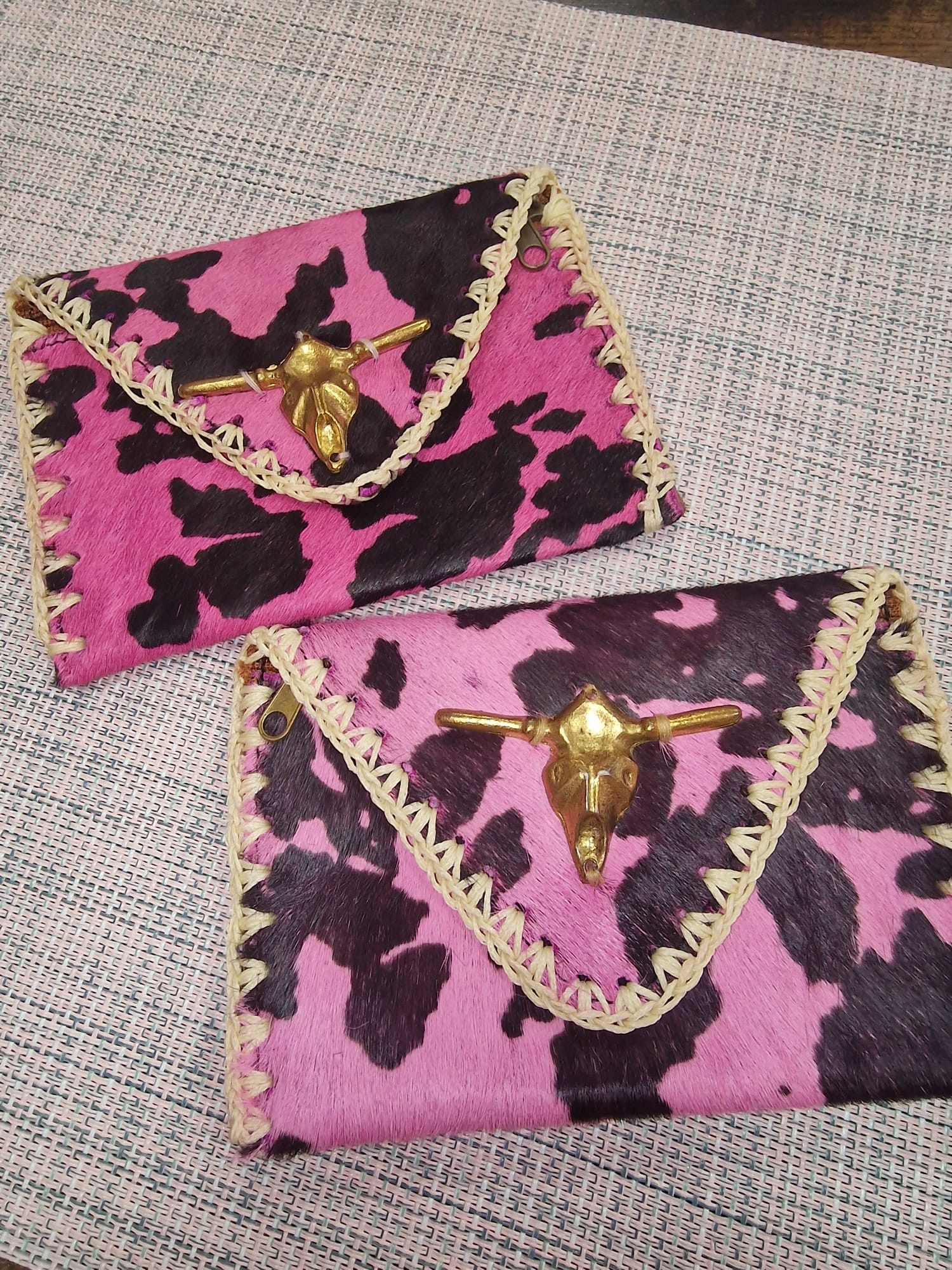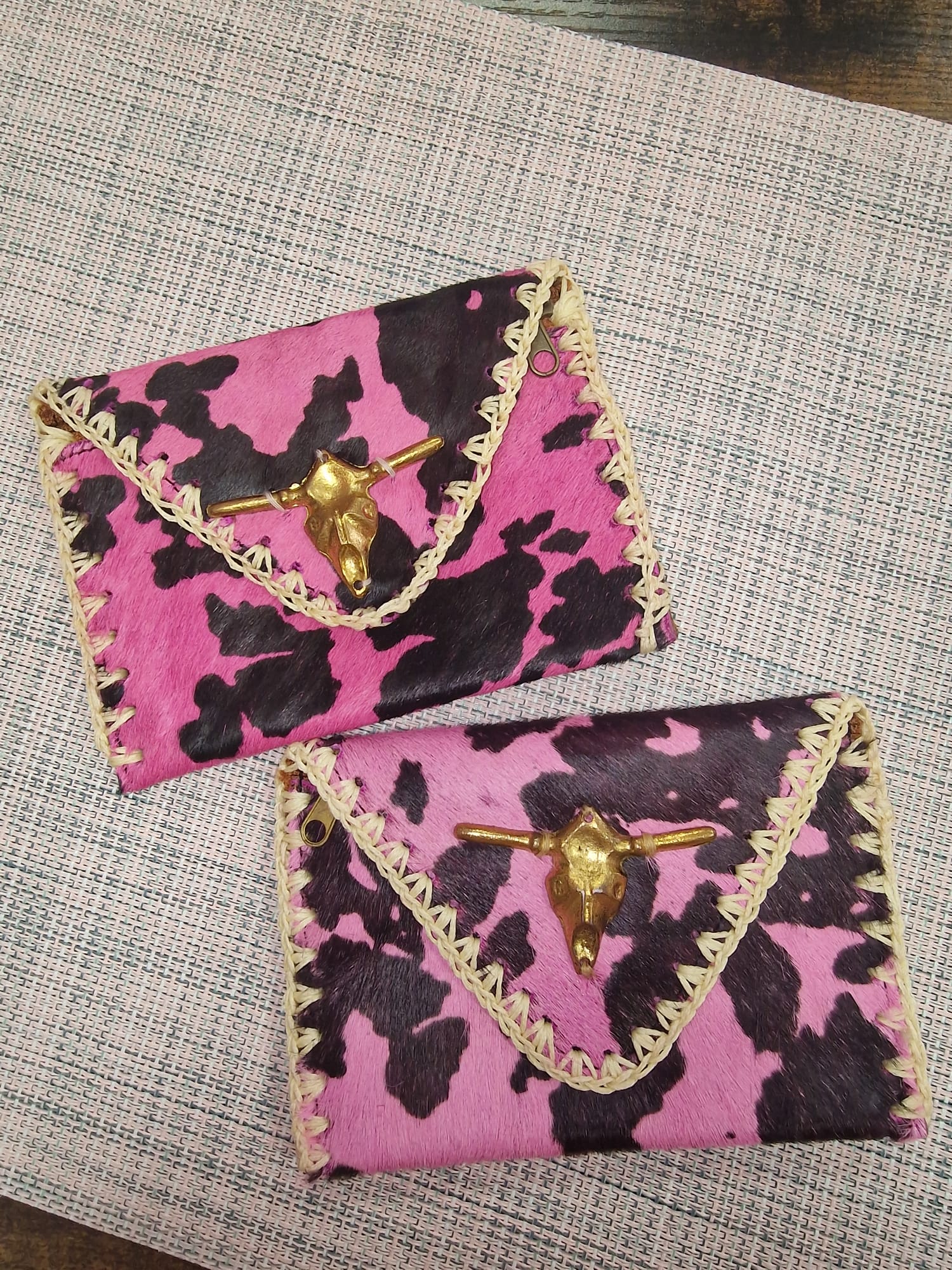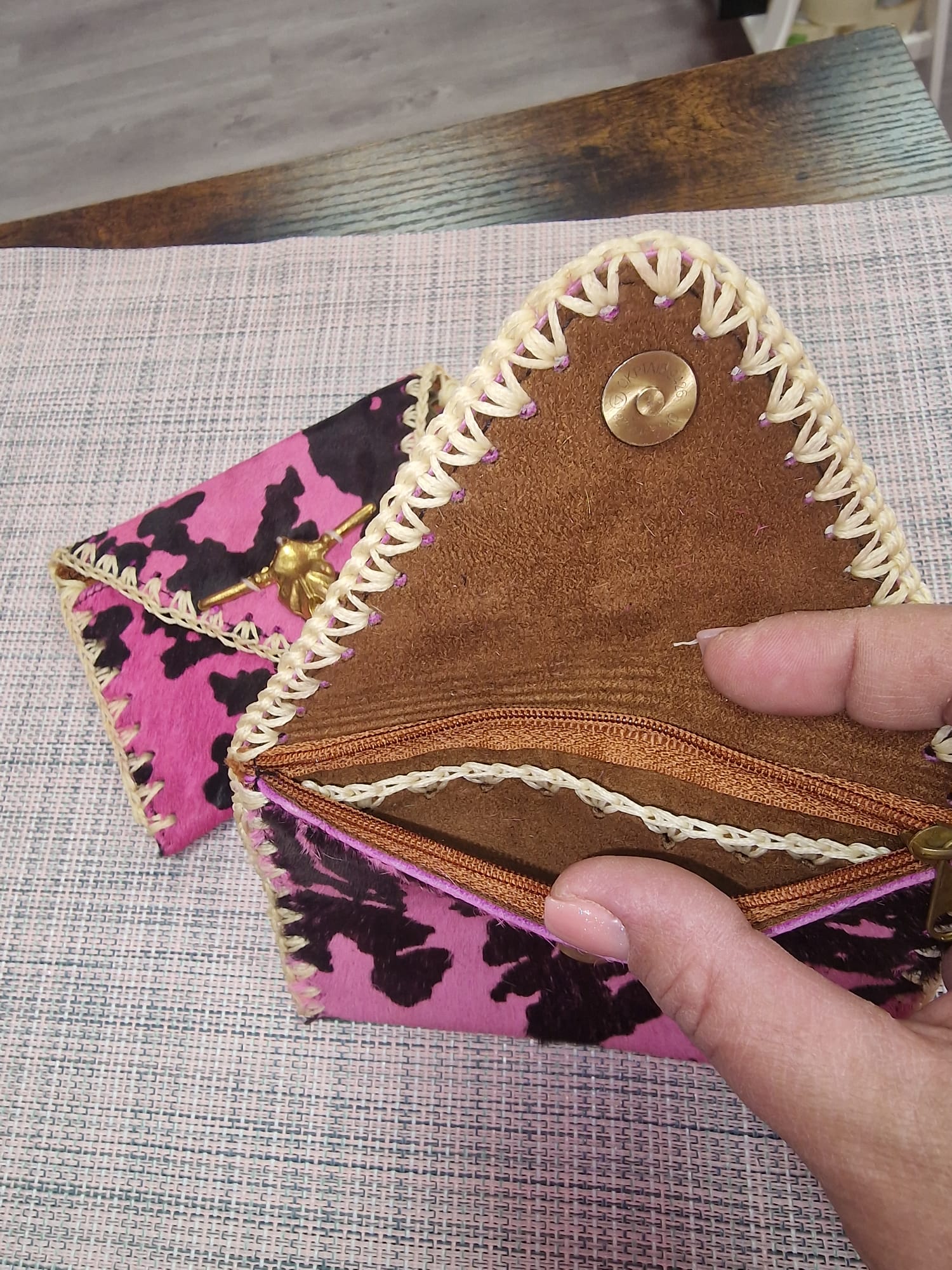 Monedero de piel con estampado de animal print en color rosa y terminaciones en cuerda.