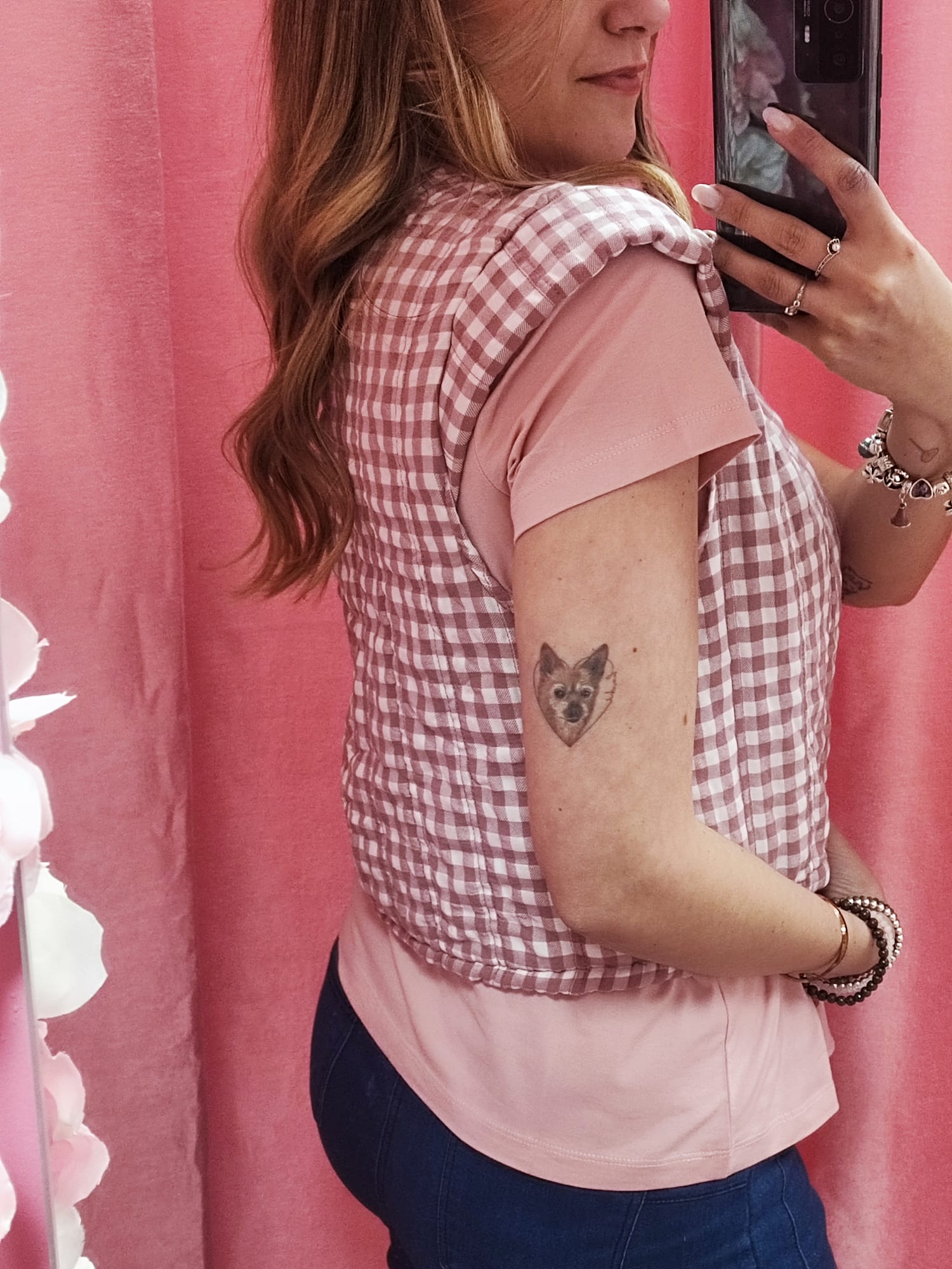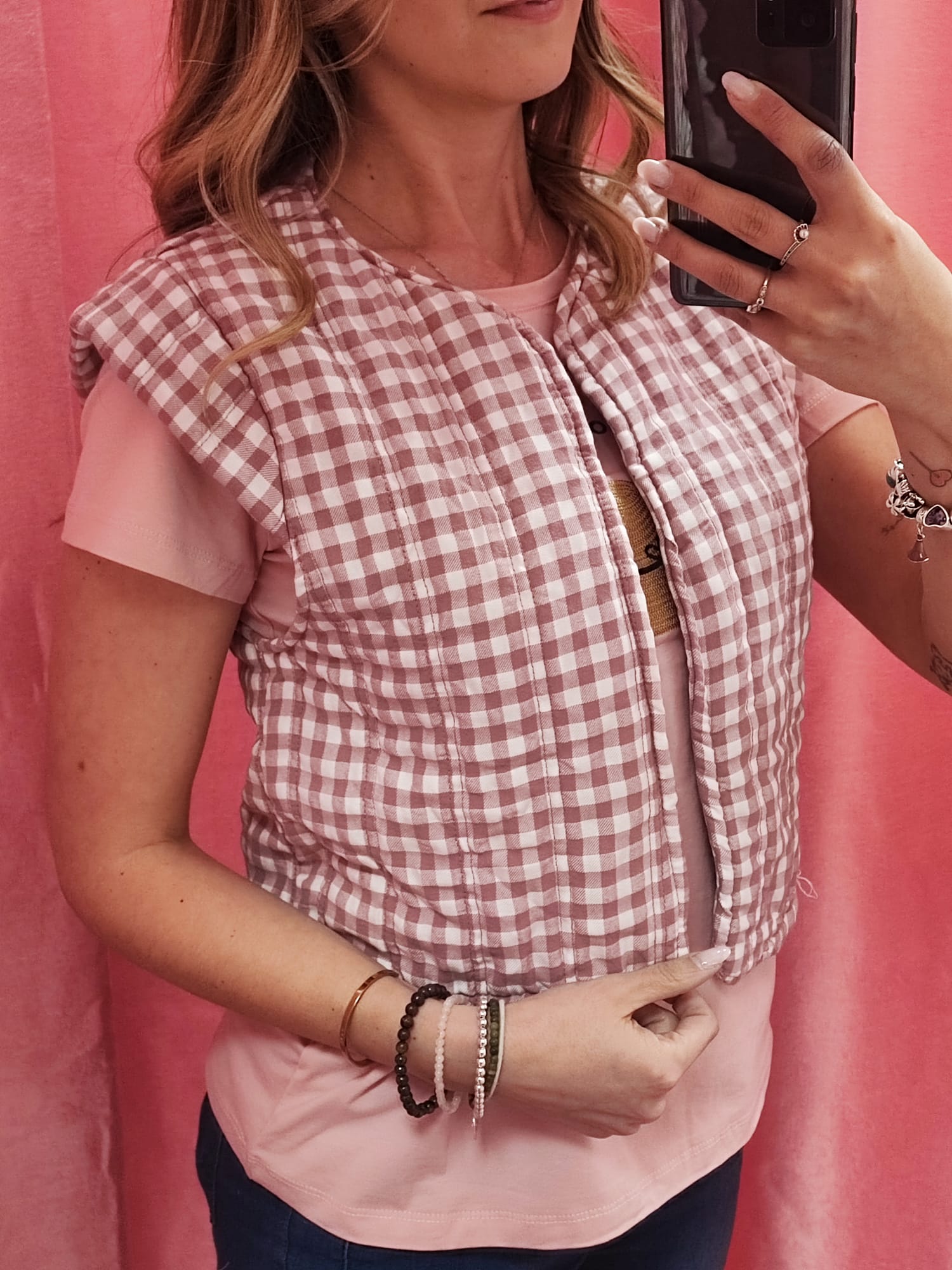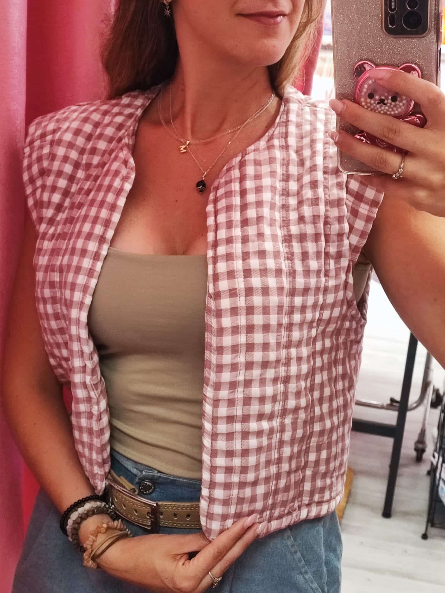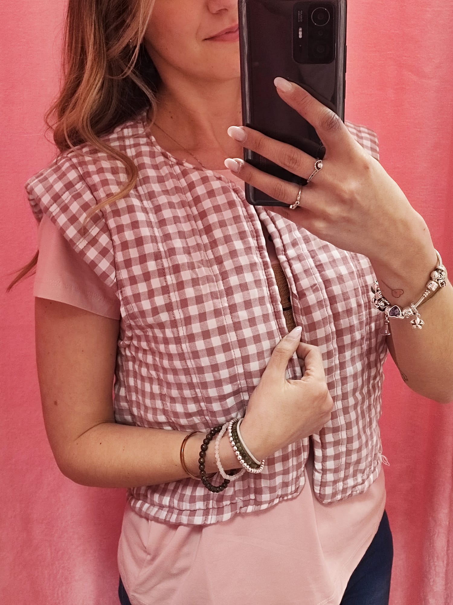 Dale un toque de estilo y calidez a tu outfit con este hermoso chaleco acolchonado. Con un diseño clásico de cuadros en tonos rosa y blanco, es la prenda ideal para complementar cualquier look casual.