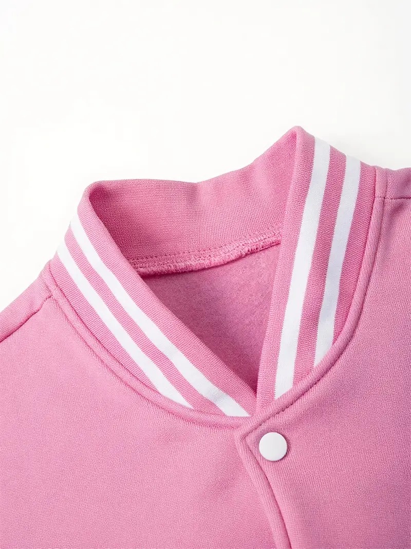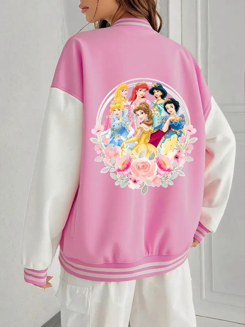 Luce estilo y comodidad con esta preciosa chaqueta universitaria en color rosa y blanco, perfecta para fans de las Princesas Disney. Su diseño moderno tipo varsity combina con cualquier look casual, mientras que su interior forrado de pelito suave te mantiene abrigada en los días fríos.