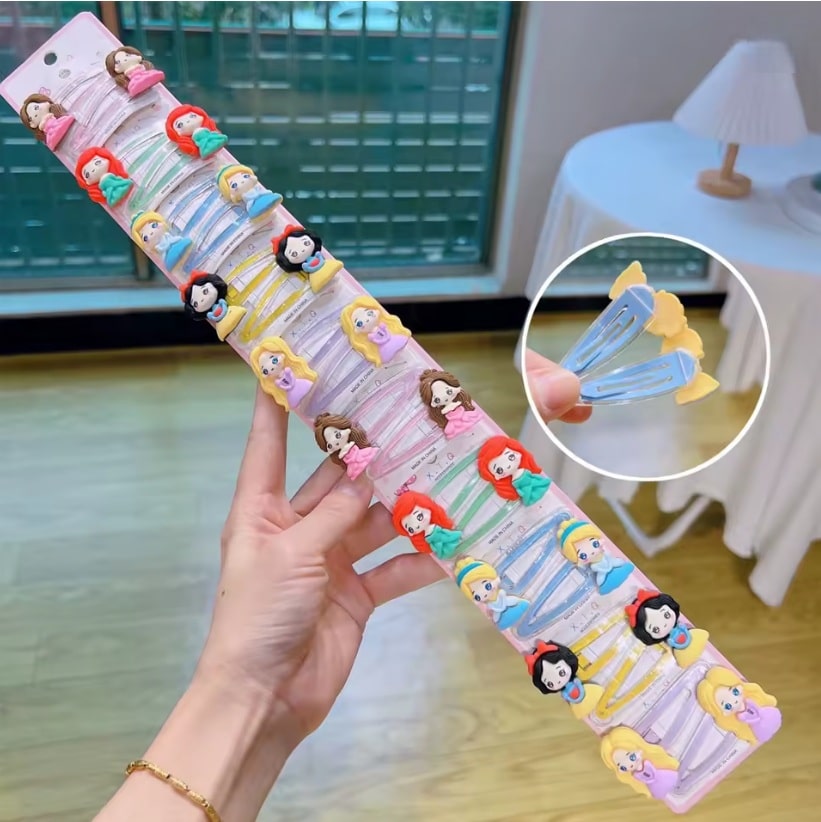 Cada pack incluye 2 clips con diseño de princesa (modelo a elegir), perfectos para sujetar el cabello con estilo y dulzura. Están decorados con figuras detalladas y coloridas de las princesas favoritas como Cenicienta, Ariel, Bella, Blancanieves y más, ideales para complementar cualquier look infantil.