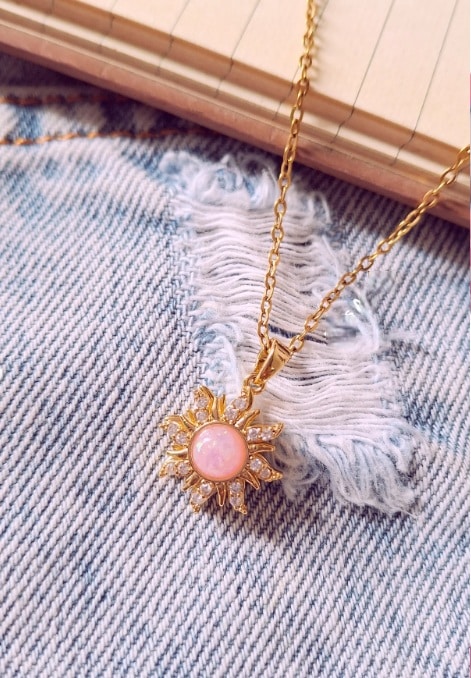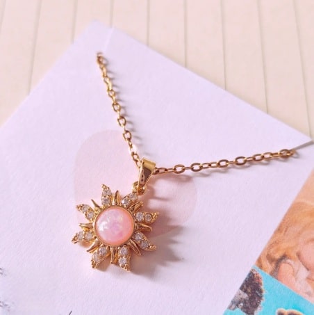 Este hermoso collar dorado es mucho más que un accesorio: es una joya mágica que captura la esencia del sol de Enredados, la película de Rapunzel. Su colgante, con forma del icónico sol del reino de Corona, combina una piedra central rosa nacarada con brillantes cristales que rodean cada rayo, evocando el símbolo de esperanza, magia y libertad que marcó la historia de la princesa de la larga melena dorada.