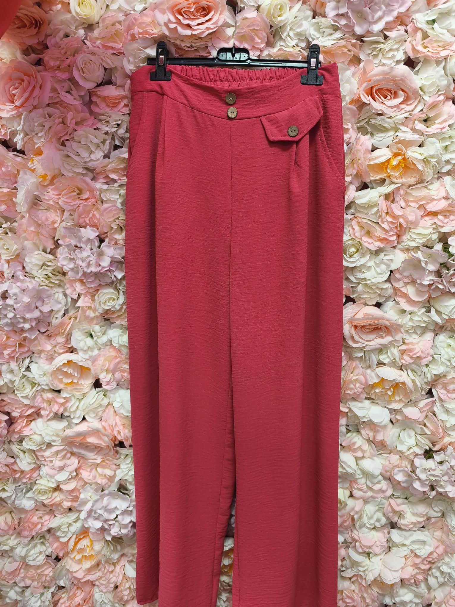 ? Pantalón palazzo de cintura alta con detalle de botón y pinzas que estilizan la silueta.