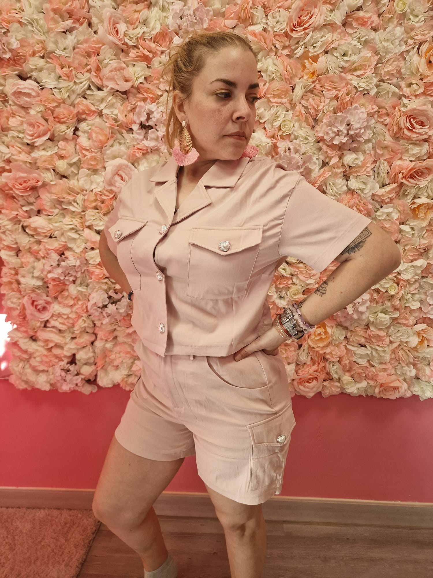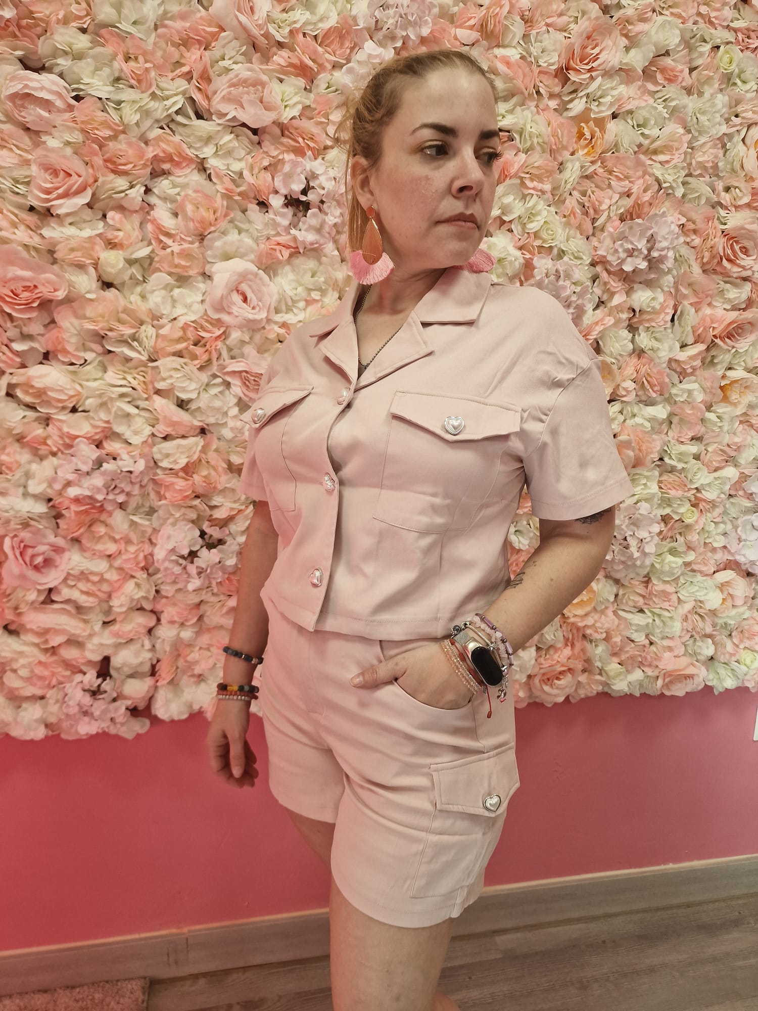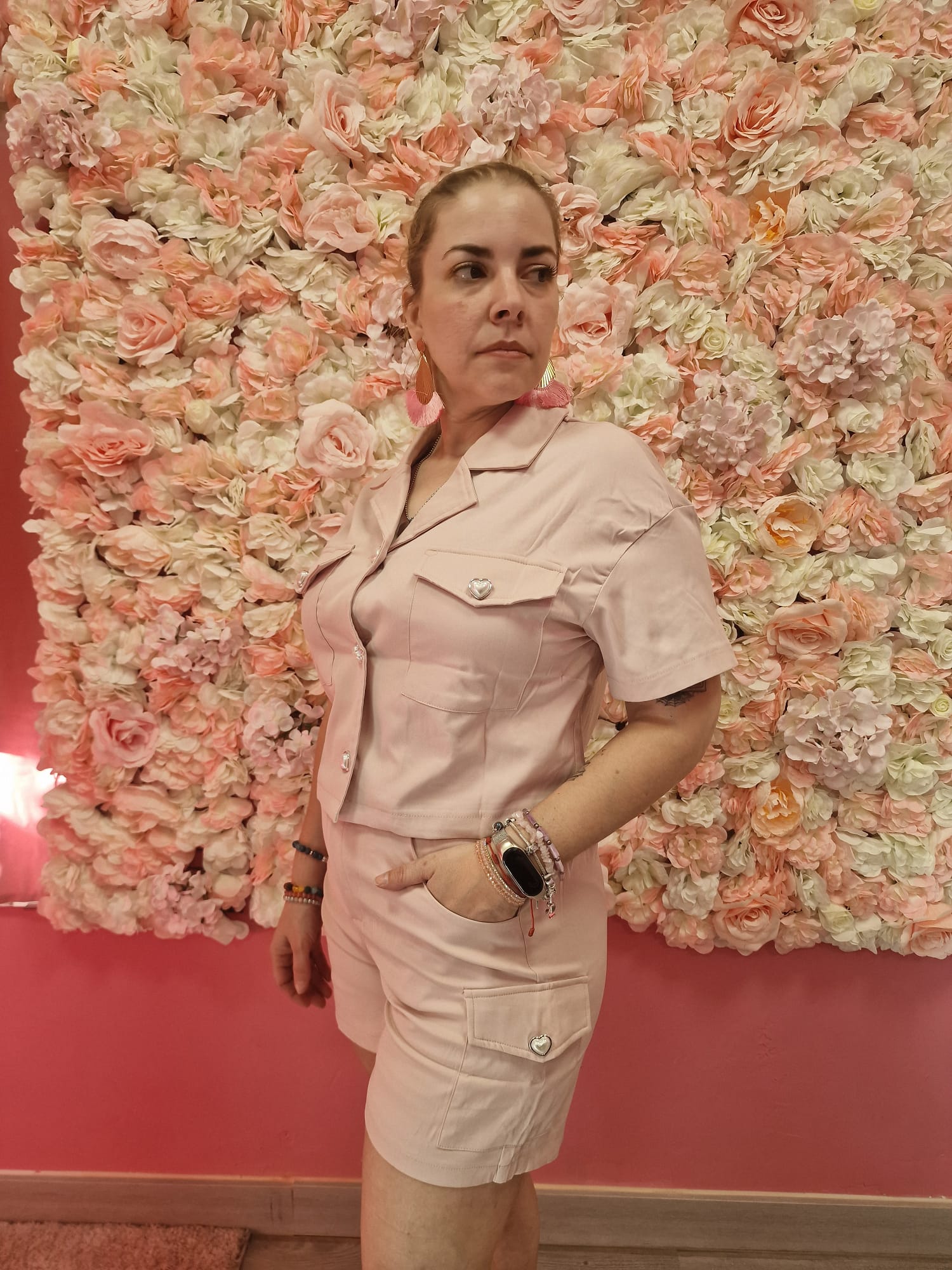 Dale un toque chic y moderno a tus días con este conjunto de dos piezas en color rosa palo. Compuesto por una blusa tipo camisa con botones en forma de corazón y un short estilo cargo con bolsillos funcionales, este outfit combina lo mejor de la moda y la practicidad.