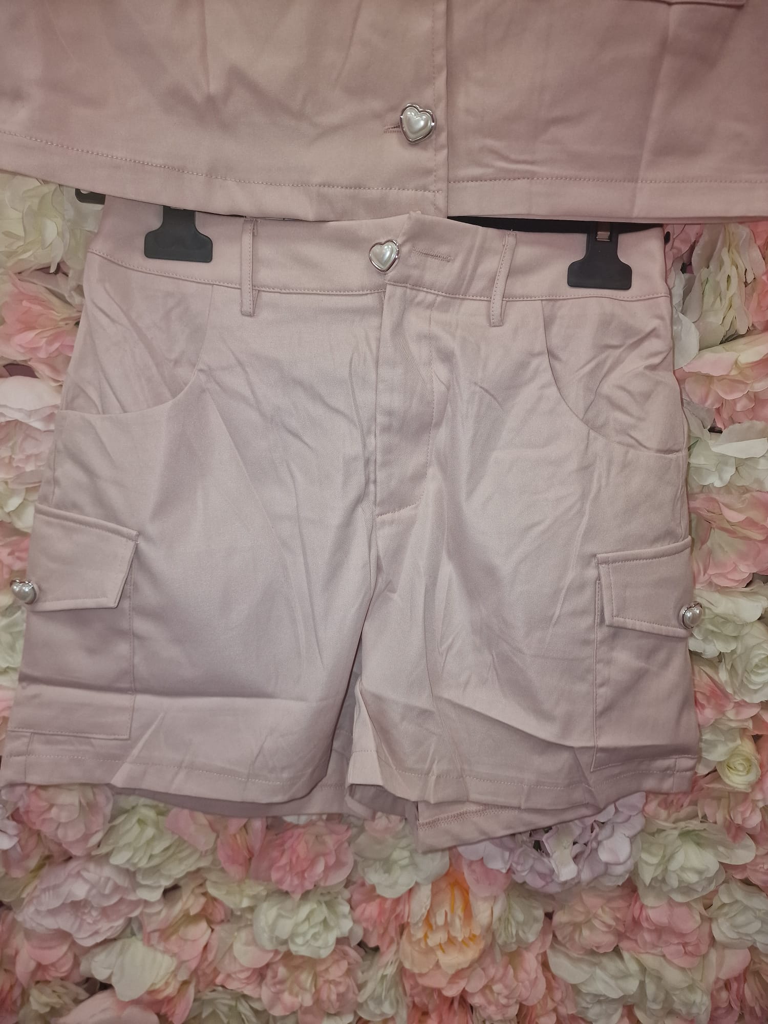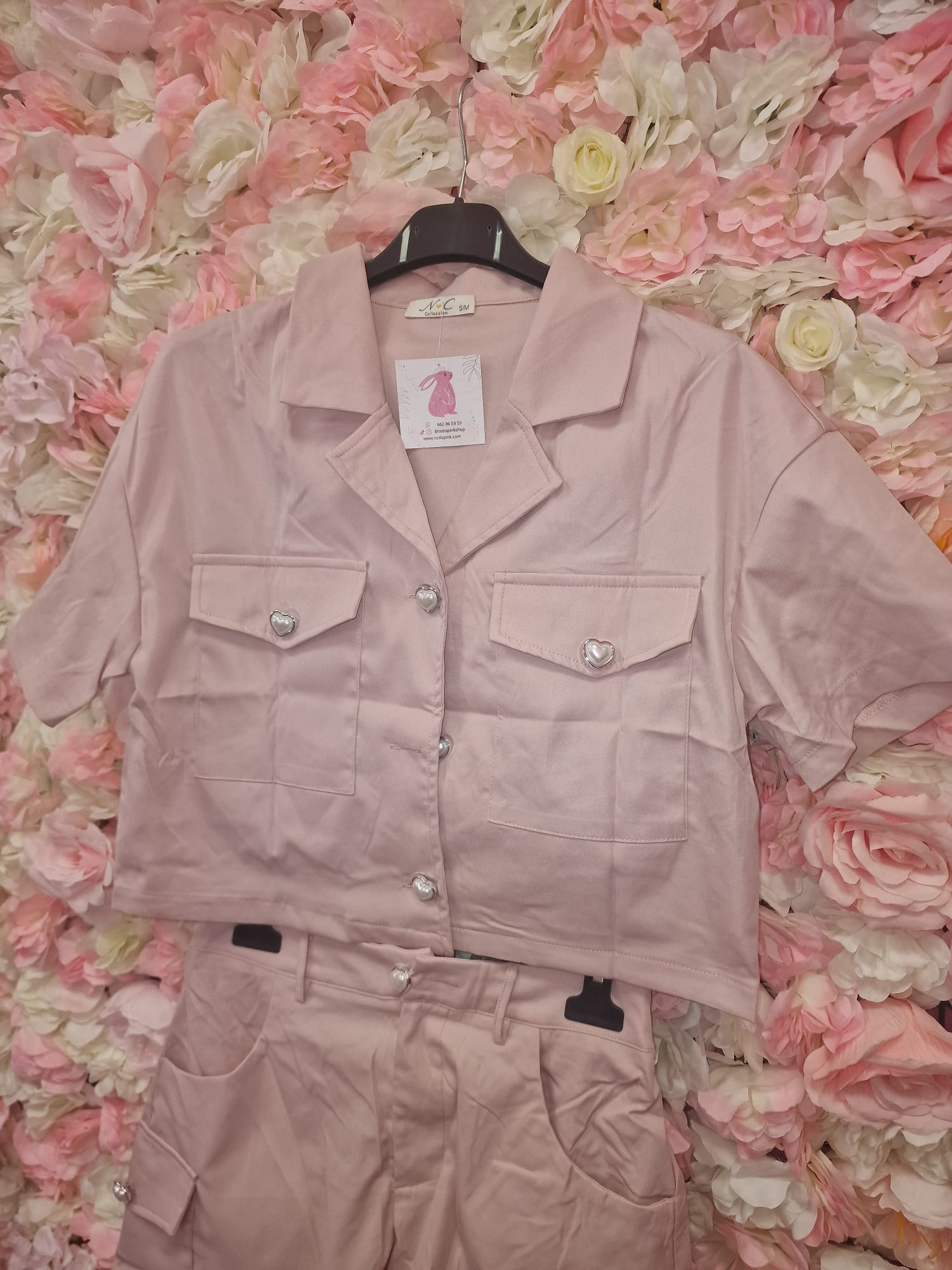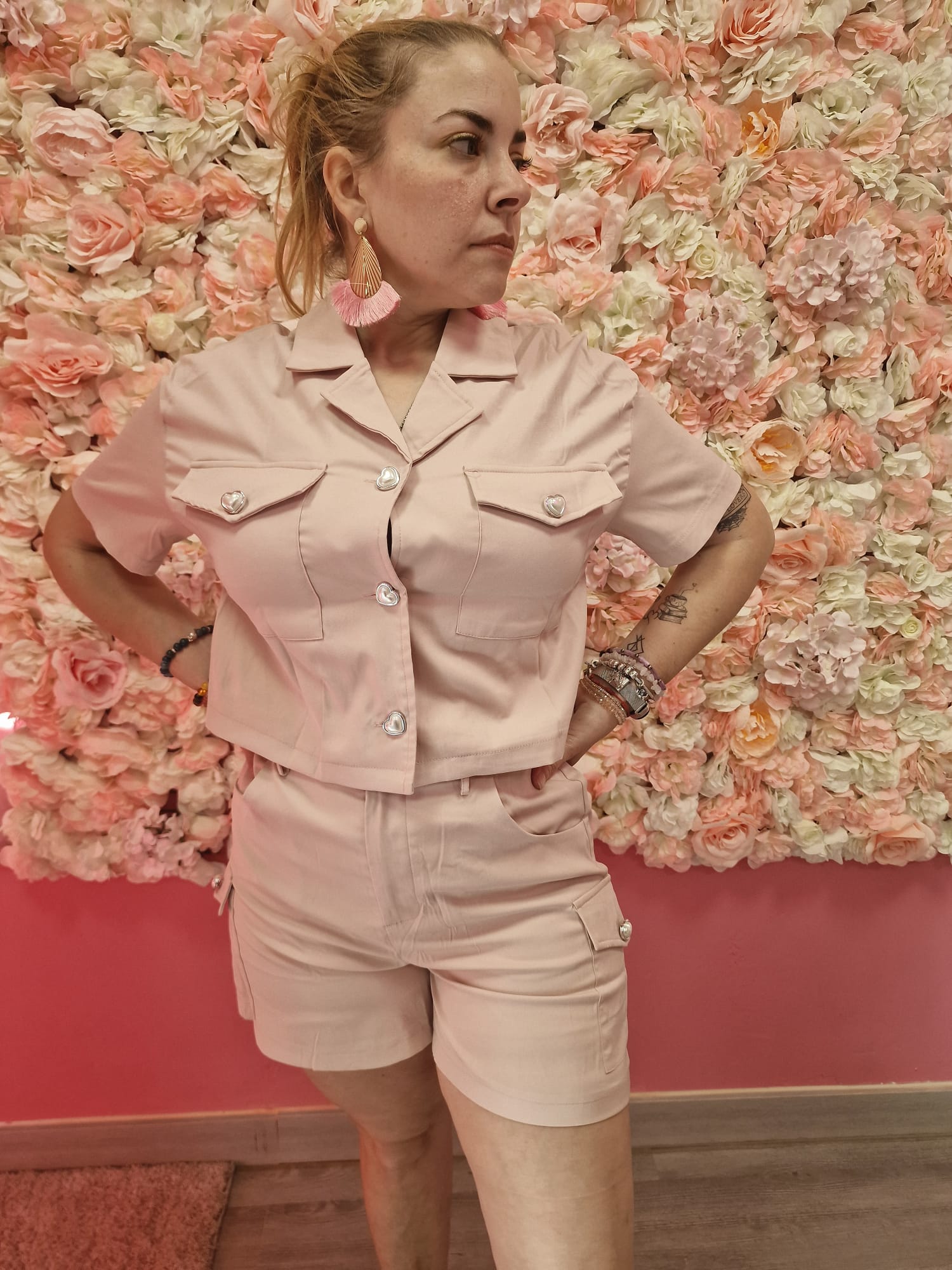 Dale un toque chic y moderno a tus días con este conjunto de dos piezas en color rosa palo. Compuesto por una blusa tipo camisa con botones en forma de corazón y un short estilo cargo con bolsillos funcionales, este outfit combina lo mejor de la moda y la practicidad.