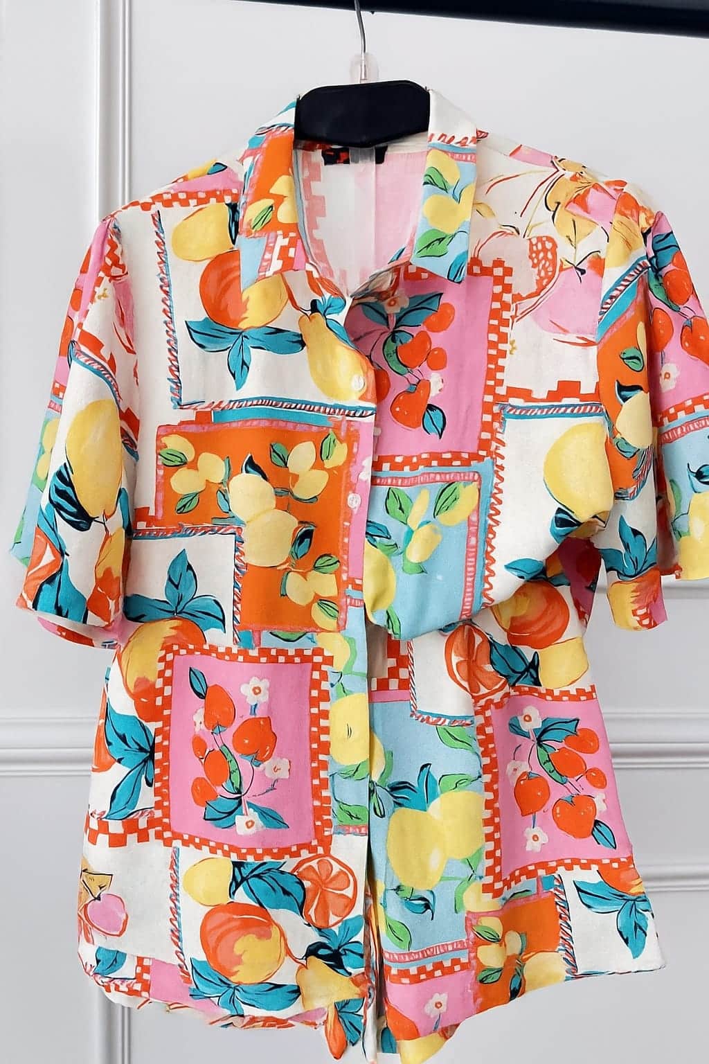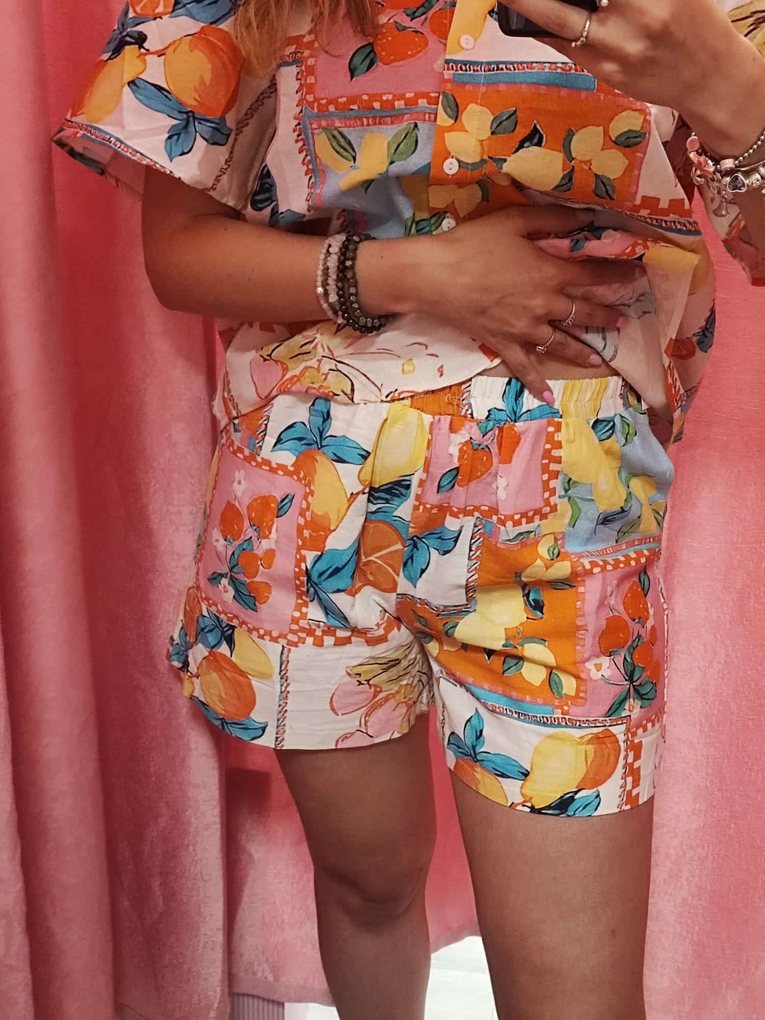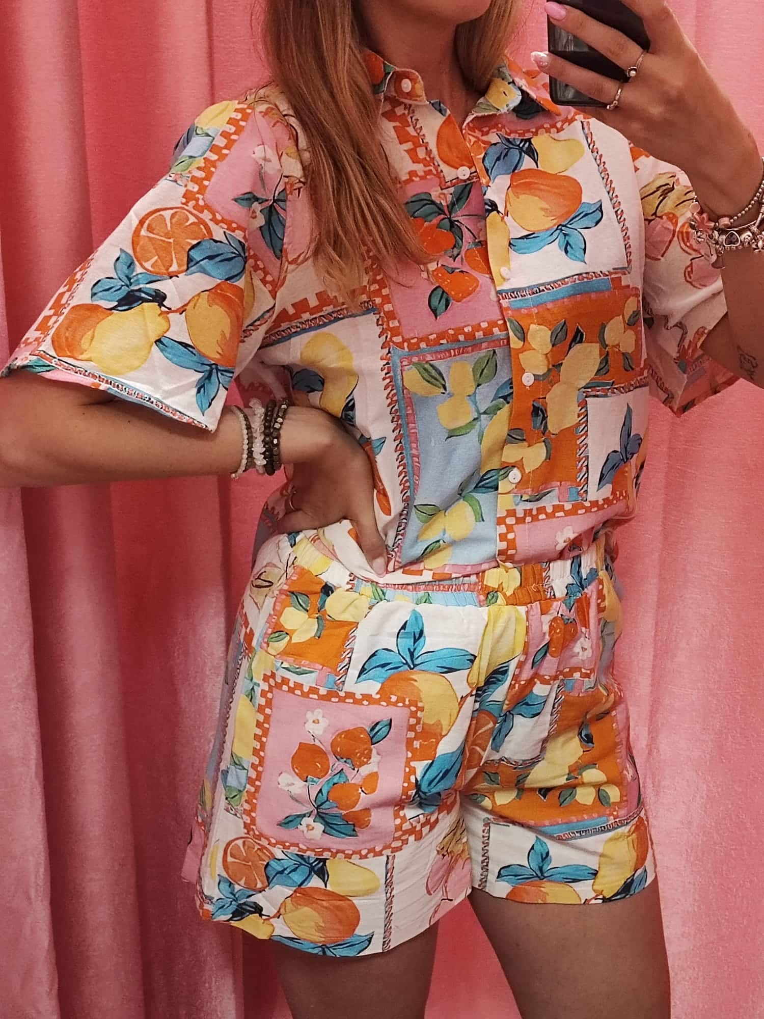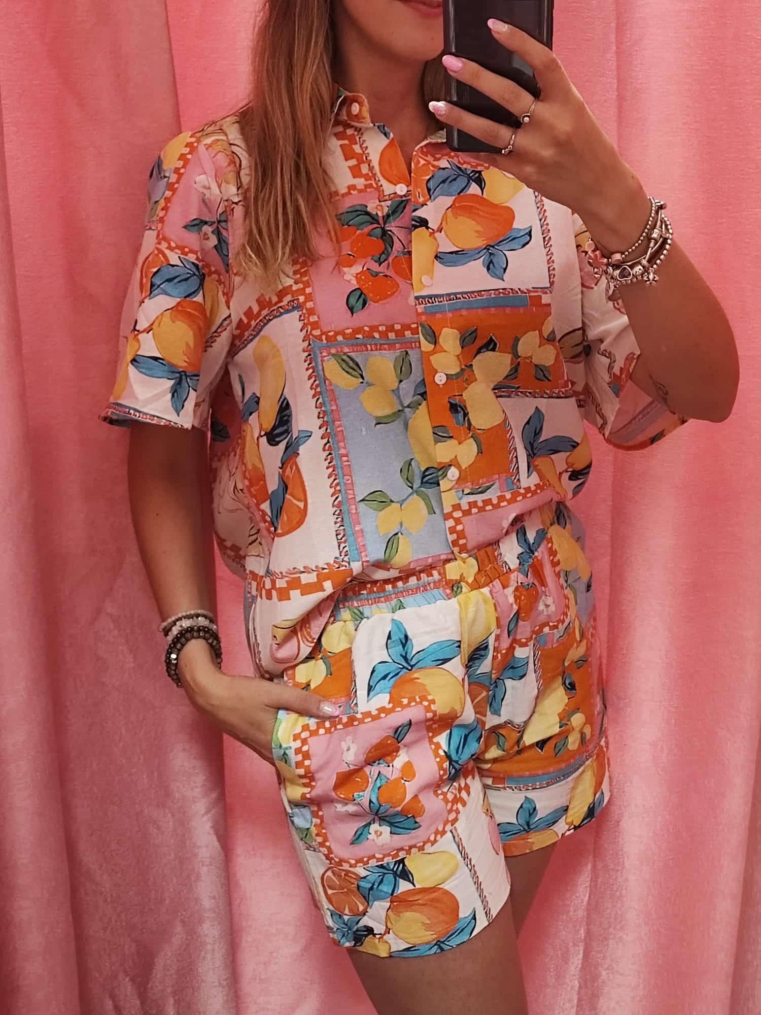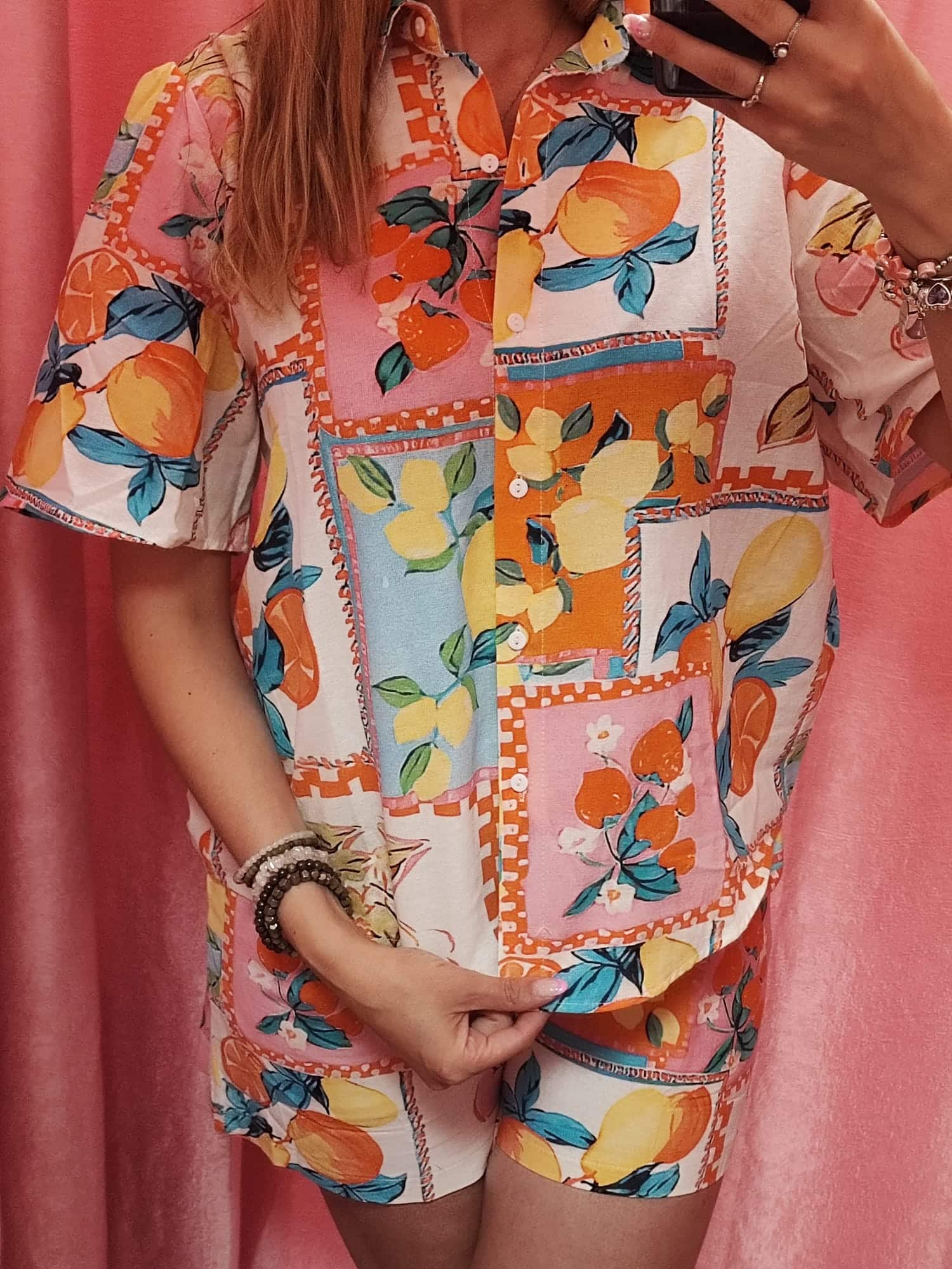 Este conjunto de dos piezas es todo lo que necesitas para lucir fresca, cómoda y con un toque divertido. Compuesto por una camisa de manga corta con botones y un short con cintura elástica, combina a la perfección practicidad y tendencia. Su estampado colorido de frutas y flores en tonos naranjas, amarillos, rosas y azules le da un aire tropical y lleno de vida que no pasará desapercibido.