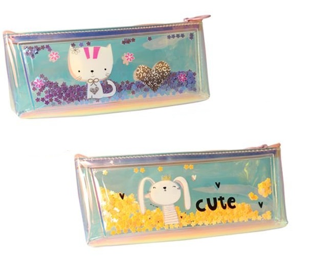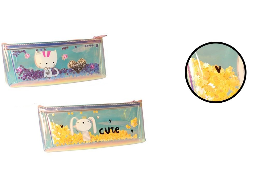 Divertido estuche transparente holográfico e iridiscente. Con estampado de gatito o conejito cute, y decorados en su interior con pequeñas chispitas y purpurina que se mueven.