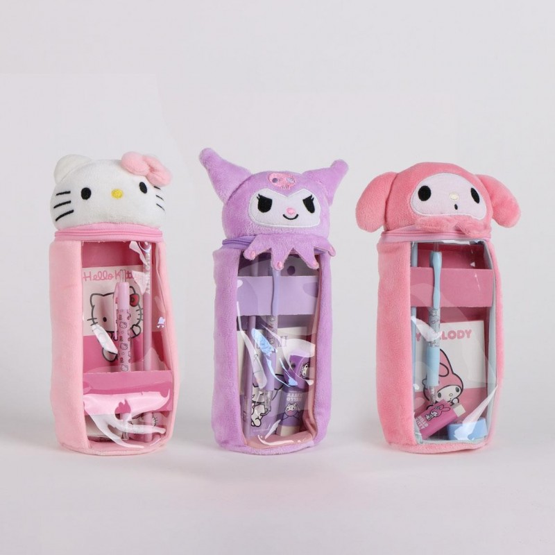Este encantador estuche portatodo de la colección Hello Kitty y amigos es perfecto para añadir un toque de dulzura a tus útiles escolares. Hecho de material de peluche suave, el estuche presenta diseños de Hello Kitty, Kuromi y My Melody, cada uno con sus distintivos colores: rosa para Hello Kitty, lila para Kuromi y rosa oscuro para My Melody. Perfecto como regalo para los amantes de Sanrio, este set incluye un lápiz, un bolígrafo, una goma de borrar y un bloc de notas a juego. Ideal para mantener tu escritorio organizado y con un estilo adorable.