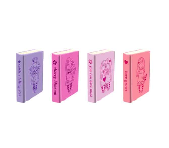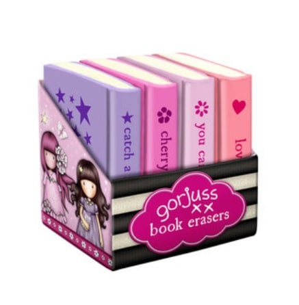 ¡Borra con estilo y ternura! Este adorable pack de gomas de borrar de la reconocida marca Santoro Gorjuss está diseñado para enamorar a los amantes de la papelería. Cada goma tiene forma de un pequeño libro con ilustraciones únicas de las entrañables muñecas Gorjuss y frases inspiradoras como «catch a falling star» o «love grows».