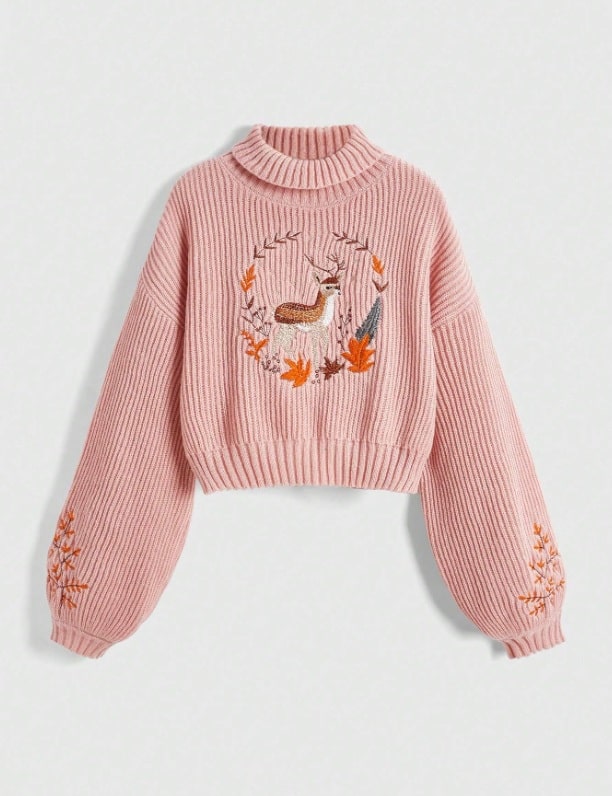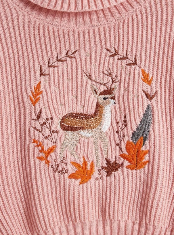 Este precioso jersey de punto grueso en tono rosa empolvado combina comodidad, estilo y un toque artesanal que lo hace único. Su diseño presenta un adorable ciervo bordado rodeado de hojas otoñales, aportando un aire cálido y natural perfecto para la temporada.
