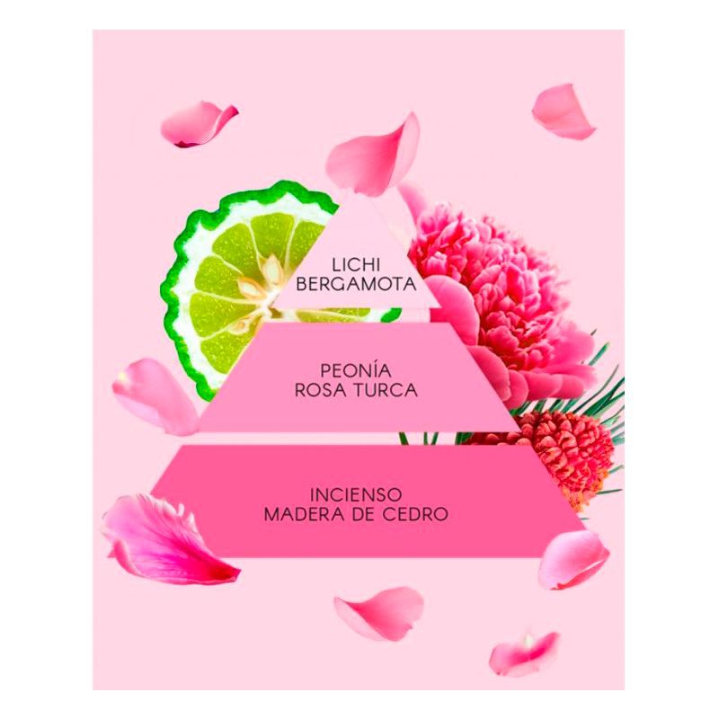 Esta maravillosa Eau de Toilette abre con la chispeante frescura del lichi y la bergamota, dos notas que te envuelven en una energía vibrante y refrescante. En su corazón, un bouquet floral exquisito de peonía y rosa turca desata todo el romanticismo y la ternura que te hará sentir especial, como si caminaras en un jardín lleno de flores. Finalmente, su fondo cálido y envolvente con toques de incienso y madera de cedro aporta sensualidad y profundidad, dejando una estela que es imposible de olvidar.