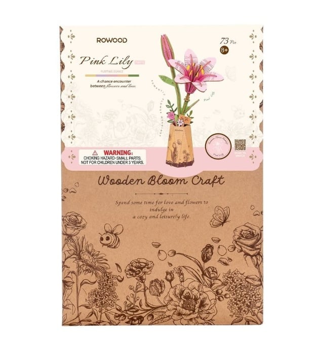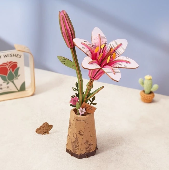 El set incluye 73 piezas de madera para montar paso a paso una delicada flor de lirio rosa en un elegante jarrón decorativo.
