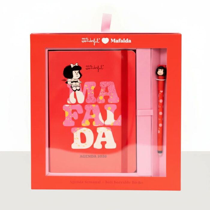 Set compuesto por una agenda y un bolígrafo borrable Bo-Bo. La agenda es de tamaño A5 y de organización semanal, sencilla y básica, sin los extras habituales que encontramos en las agendas Mr. Wonderful, con portada de diseño exclusivo en colaboración con Mafalda. Va de enero a diciembre de 2026 y su interior lo encontraremos en español. Con 160 páginas y certificación FSC.