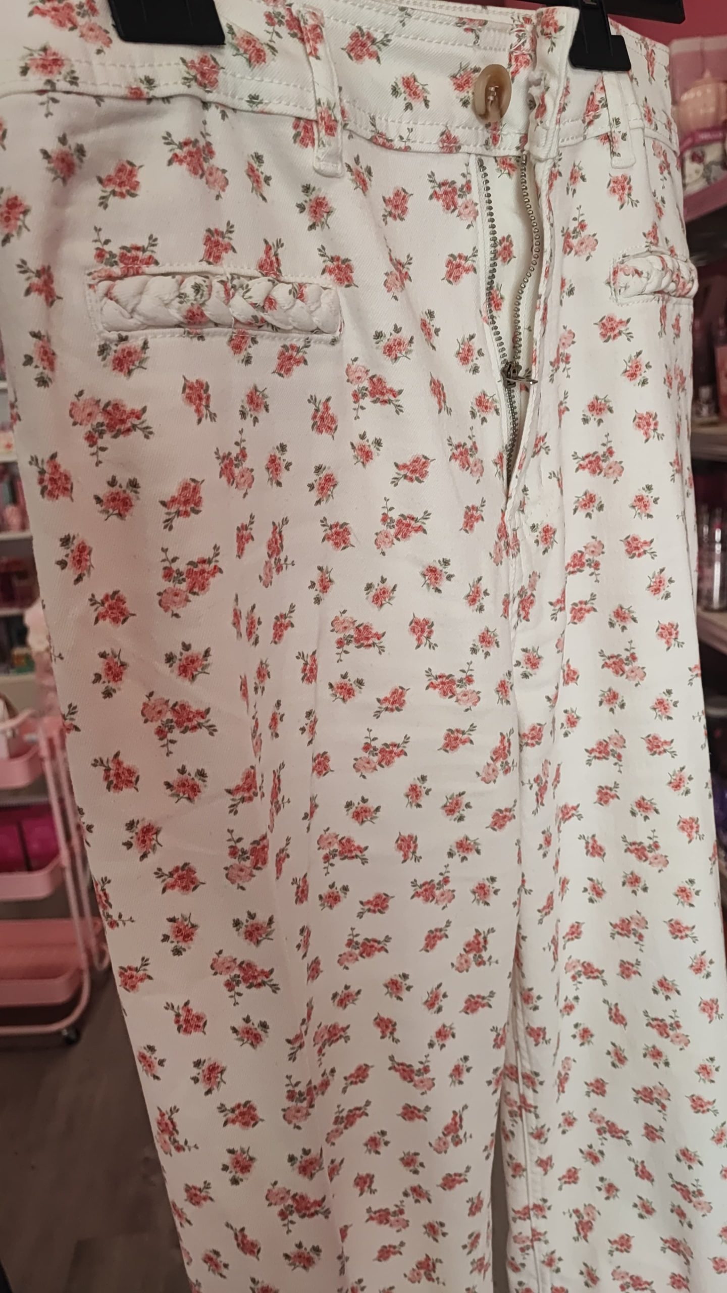 Dale un toque romántico y femenino a tu look con este precioso pantalón de tiro alto, estampado con delicadas flores rosadas sobre fondo crema. Su corte recto y su tela ligera lo hacen ideal para primavera y verano. Combínalo con un top ajustado o una blusa fluida para un outfit fresco y coqueto.