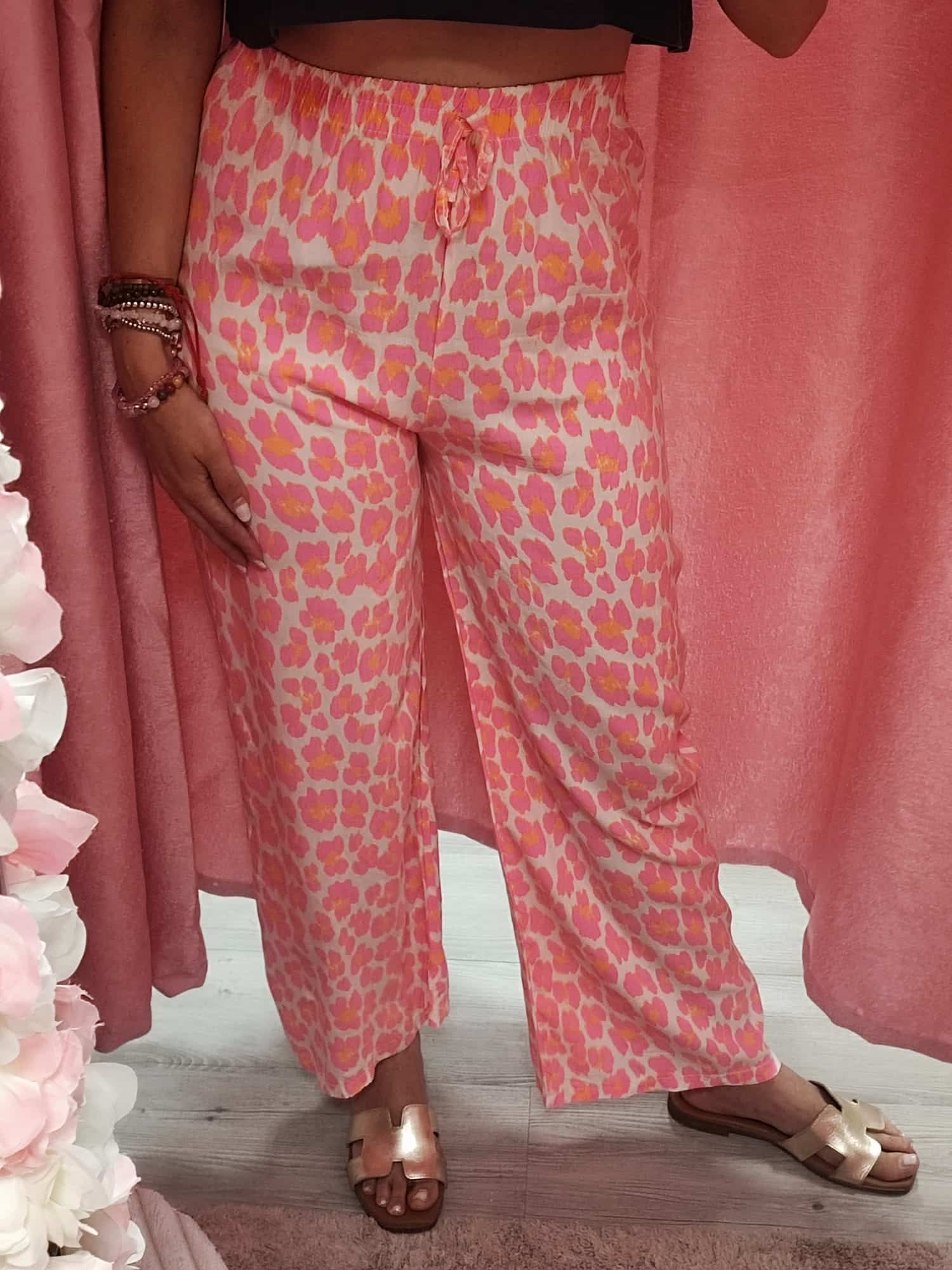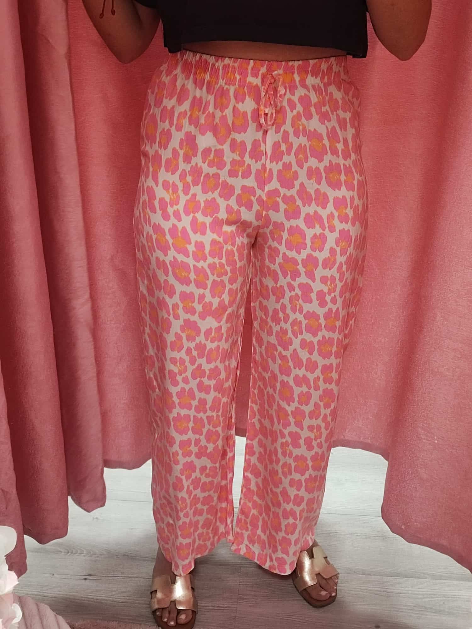 ¡Atrévete a destacar con este pantalón de estampado animal print en tonos rosa, fucsia, lila y toques de naranja! Su diseño suelto y cómodo lo convierte en una opción ideal para los días cálidos, sin dejar de lado el estilo y la originalidad.