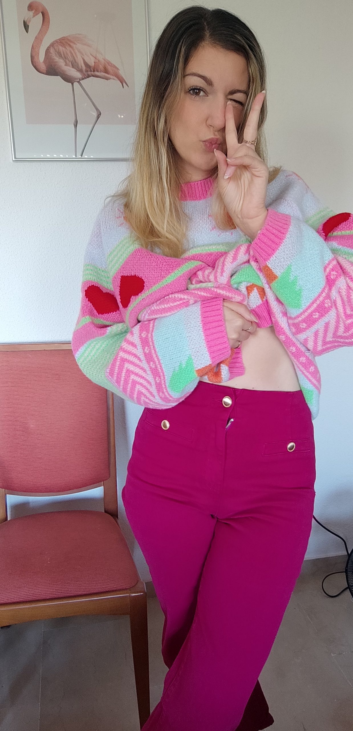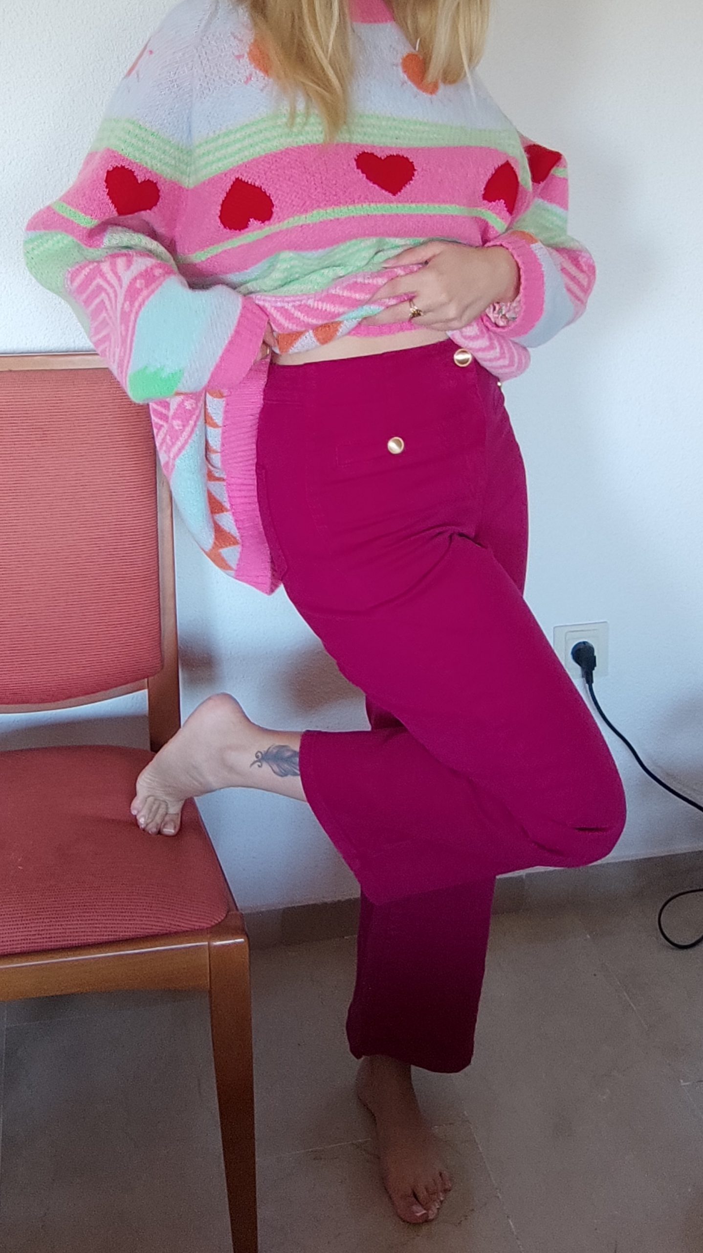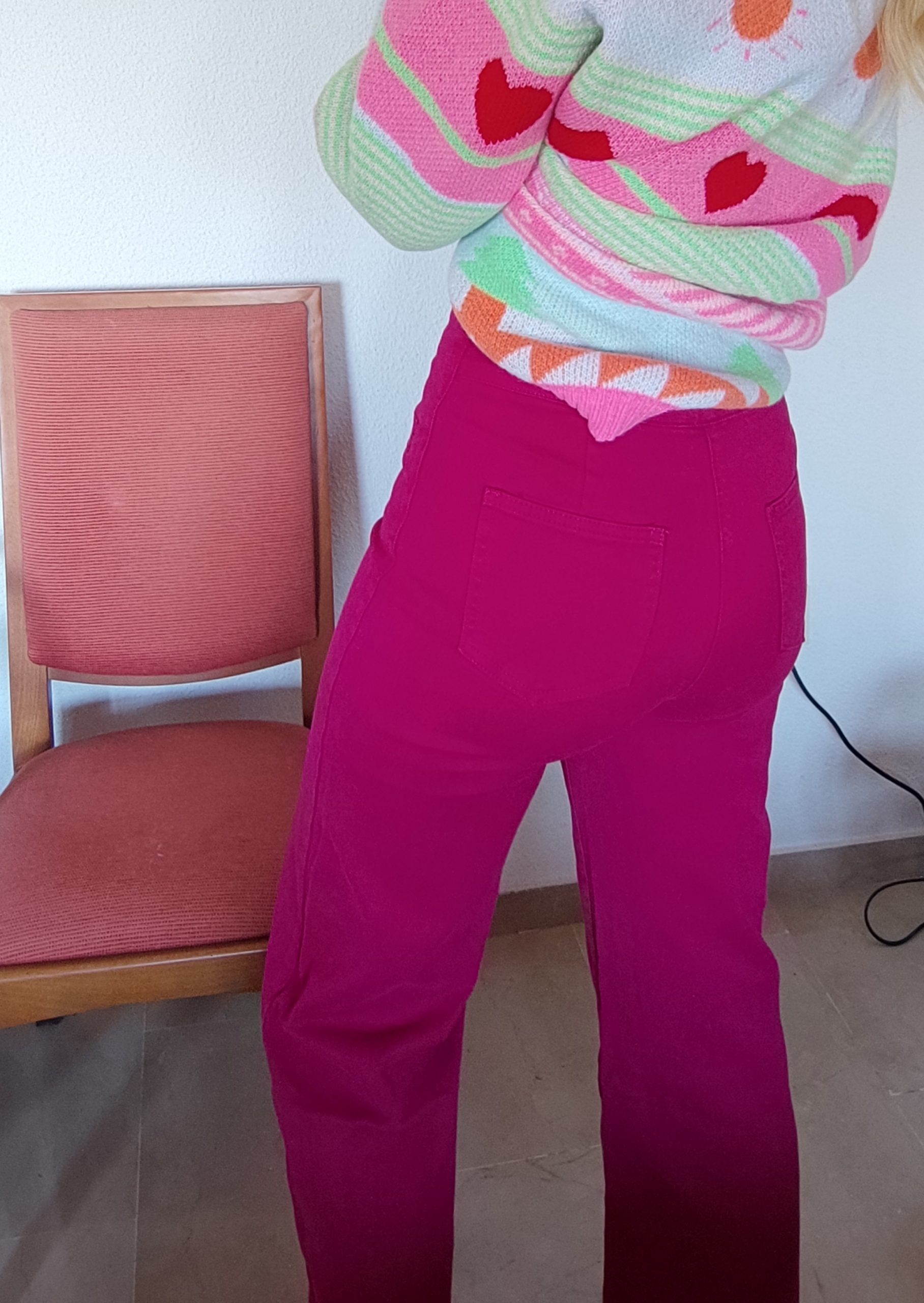 No podía faltarnos el clásico de los clásicos, un vaquero en fucsia. Este tiene un estilo súper chulo, nosotras ya nos hemos quedado con uno… Tiro alto y pata recta, estiliza muchísimo el cuerpo, te sorprenderá lo cómodo que es, viene perfecto de talla.