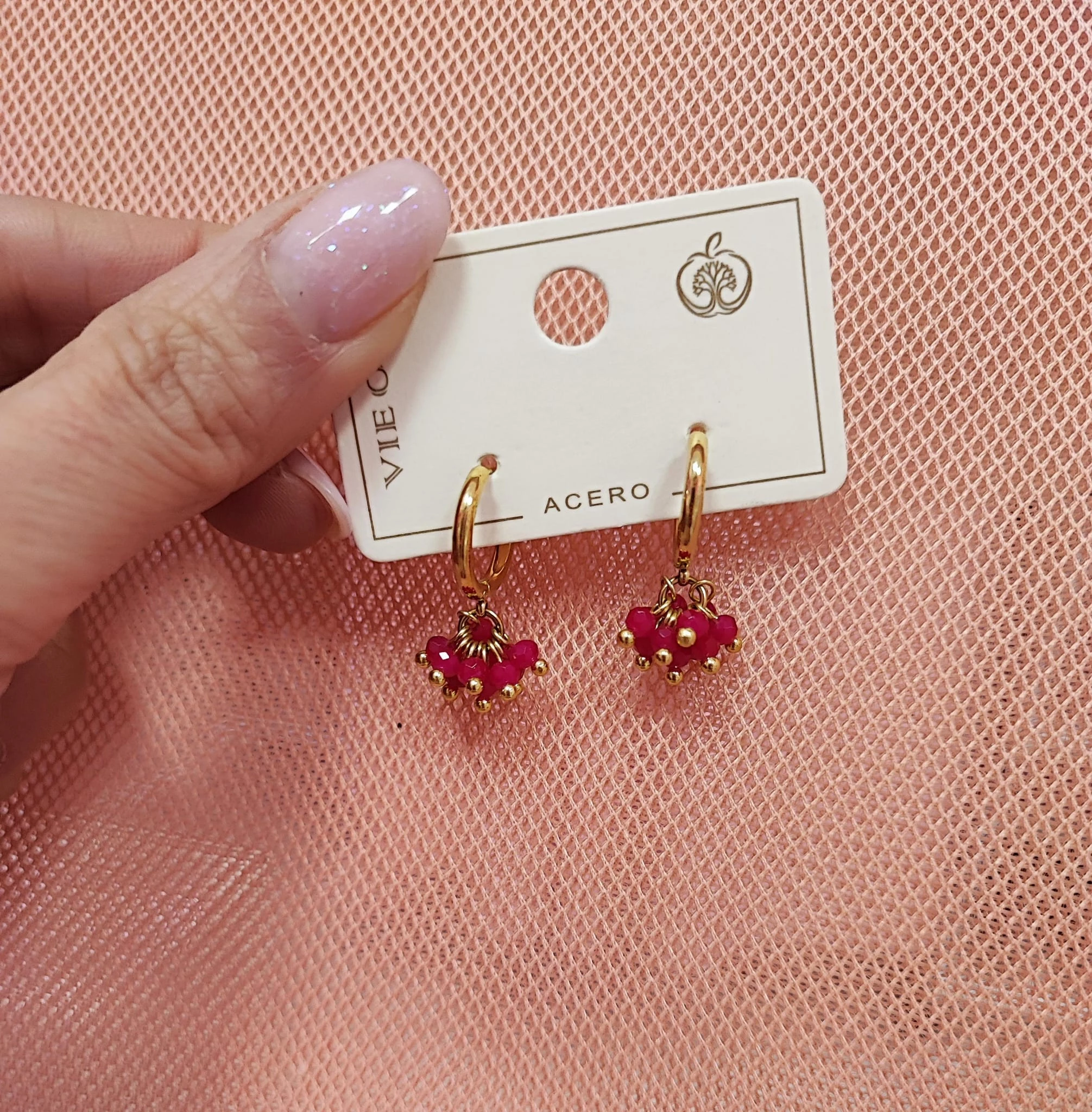 ✔ Diseño: Aros pequeños con dijes de cuentas rojas y mini detalles dorados.