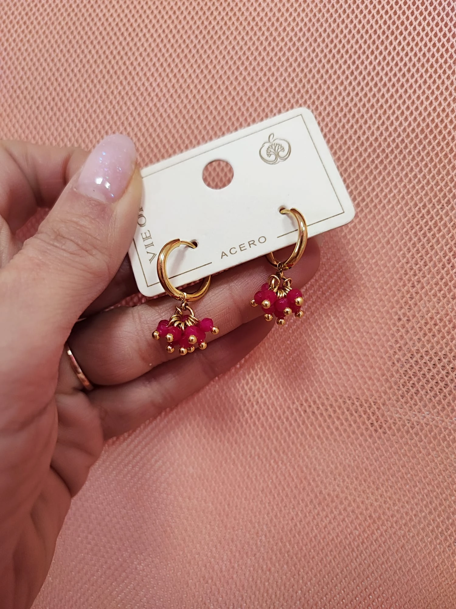 Añade un toque de delicadeza y sofisticación a tu look con estos hermosos pendientes de aro en acero inoxidable dorado. Cada aro está adornado con un encantador dije de cuentas rfucsias con detalles dorados, evocando un estilo romántico y femenino.