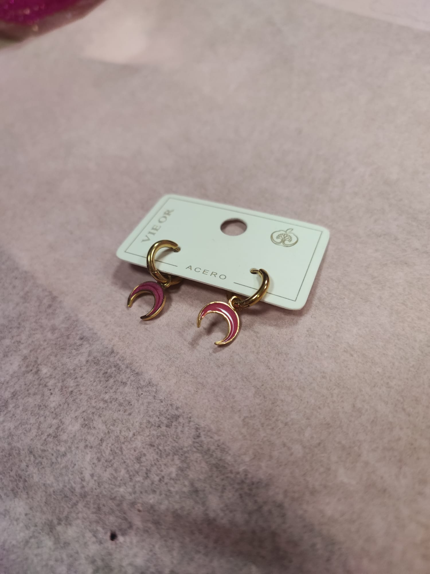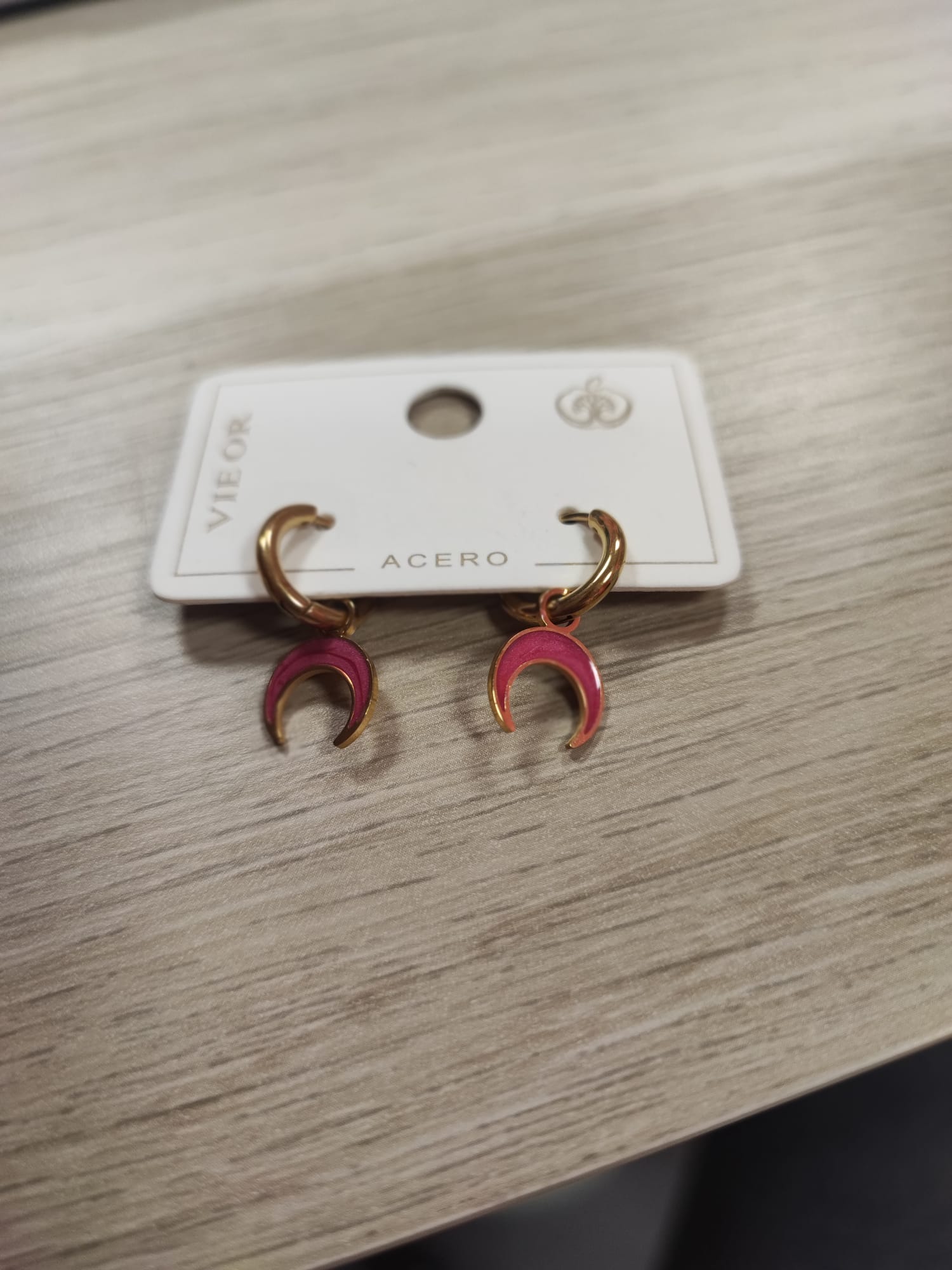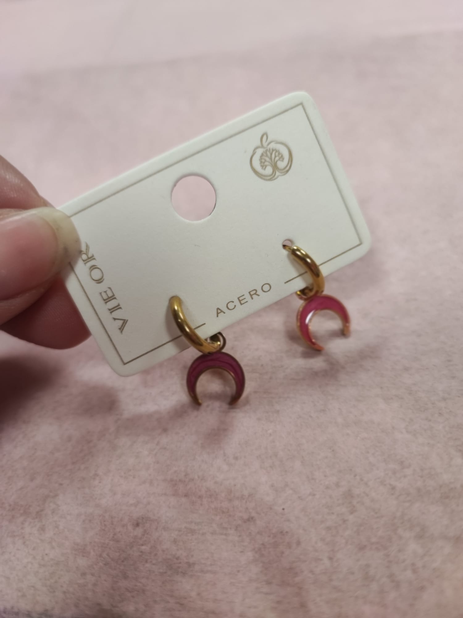 Pendientes en tono dorado, decorados con una hermosa media luna en tono rosa.