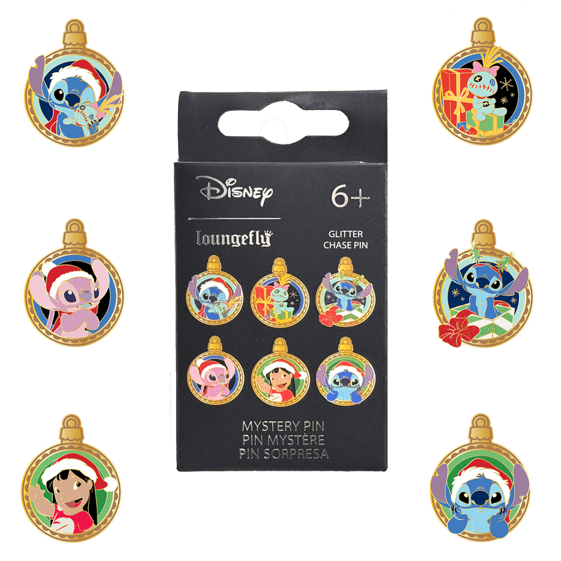 Estos pines misteriosos están inspirados en Lilo y Stitch de Disney. Cada uno viene en un empaque misterioso, ¡así que no sabes cuál obtendrás! Hay seis en total para coleccionar: Stitch y Scrump, Angel, Scrump sentado en regalos, Stitch con un gorro de Papá Noel, Lilo con un gorro de Papá Noel, y la persecución de purpurina es Stitch saliendo de un regalo con una diadema navideña.