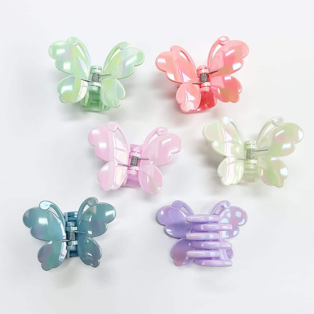 Añade un toque de color y encanto a tu peinado con nuestras adorables pinzas de mariposa. Su diseño curvo y brillante en acabado tornasolado las hace irresistibles y perfectas para destacar en cualquier ocasión.