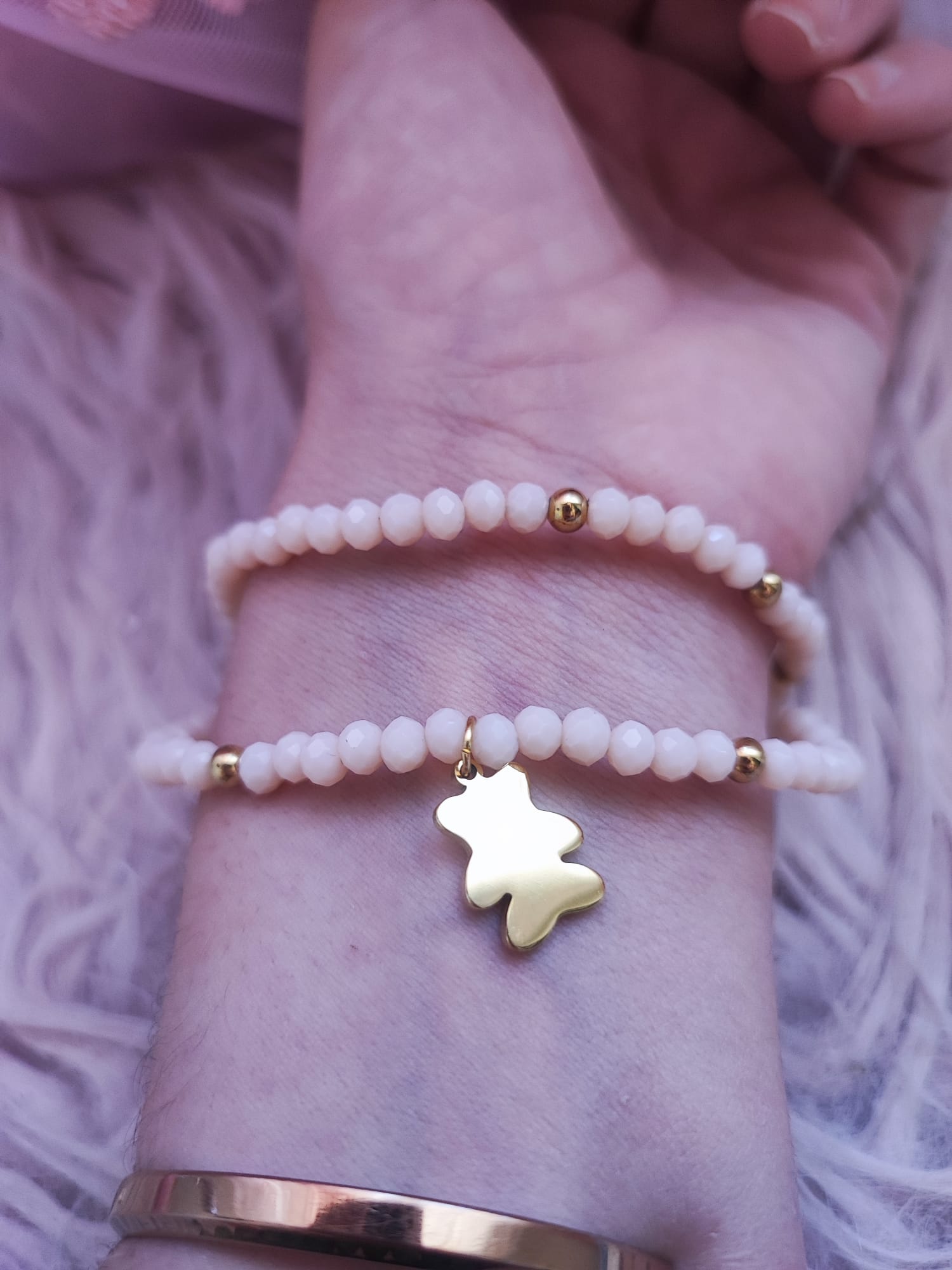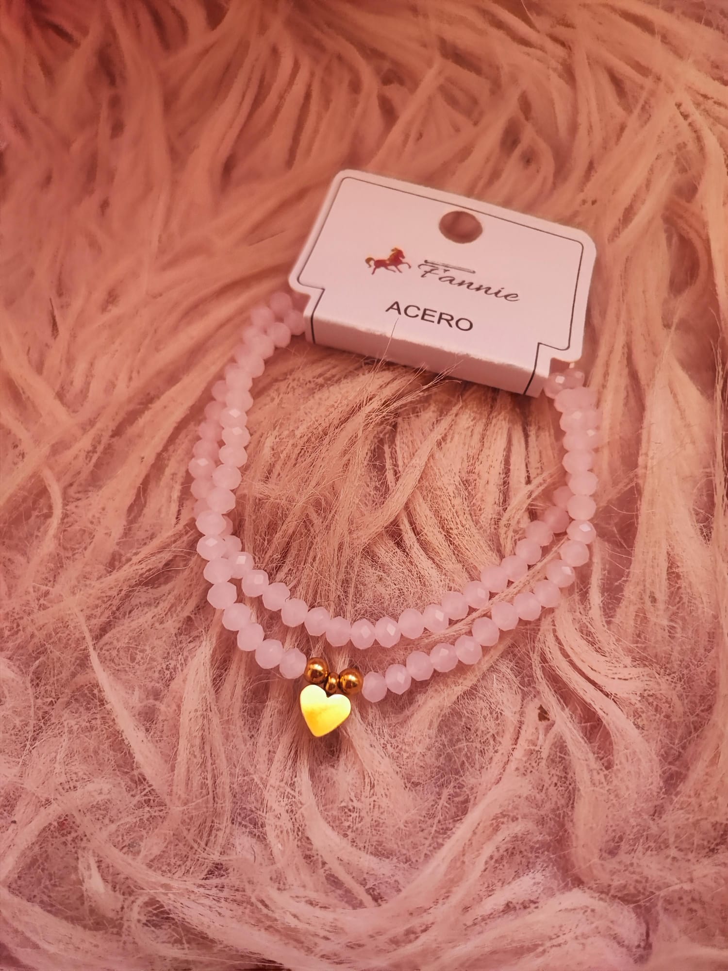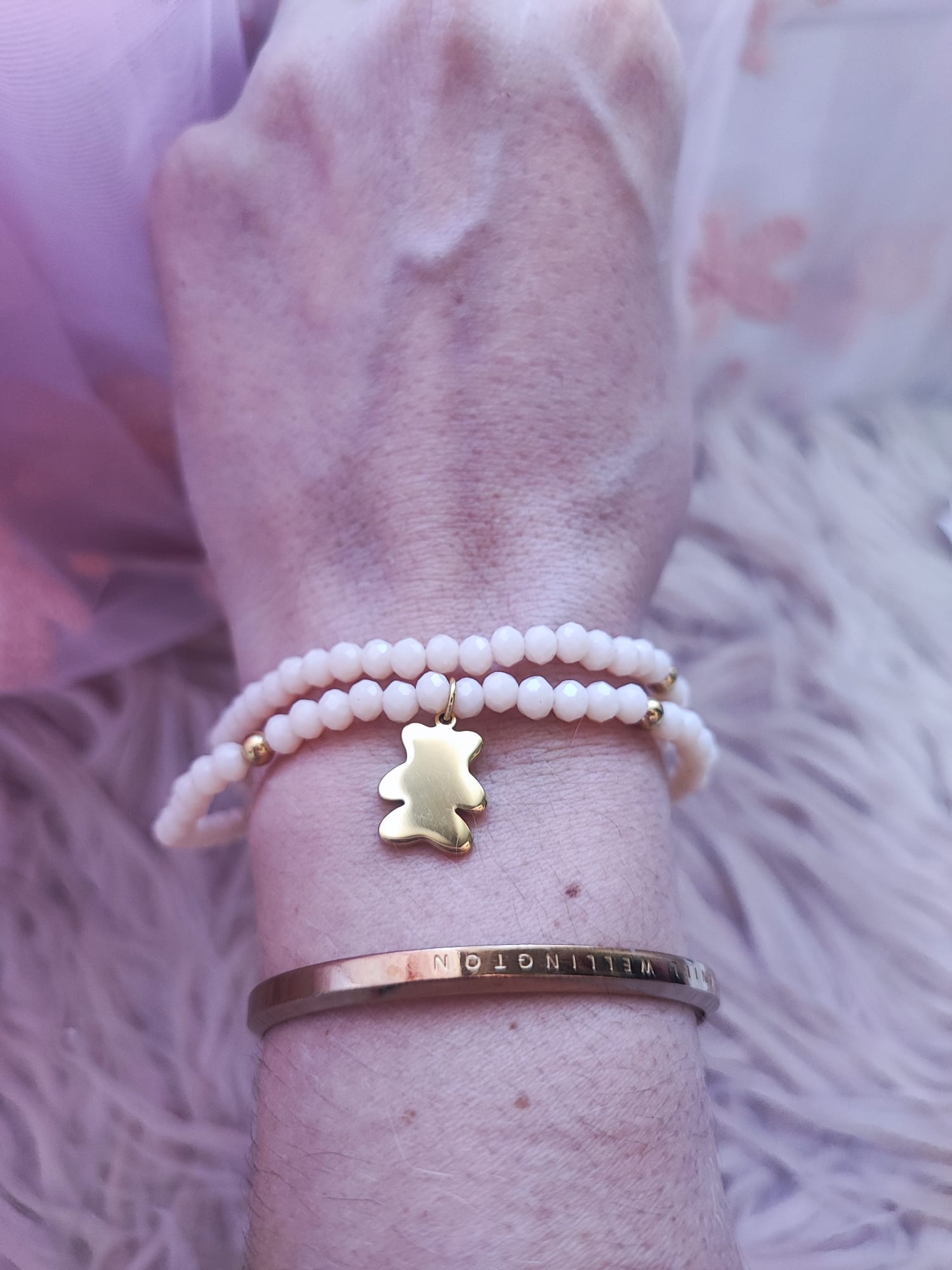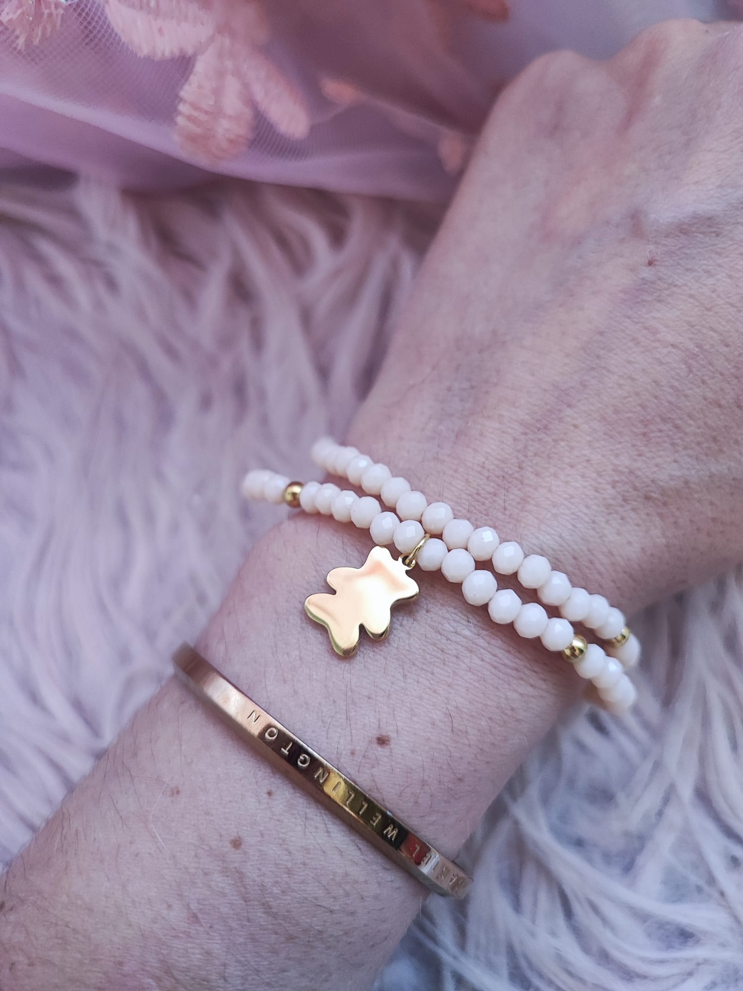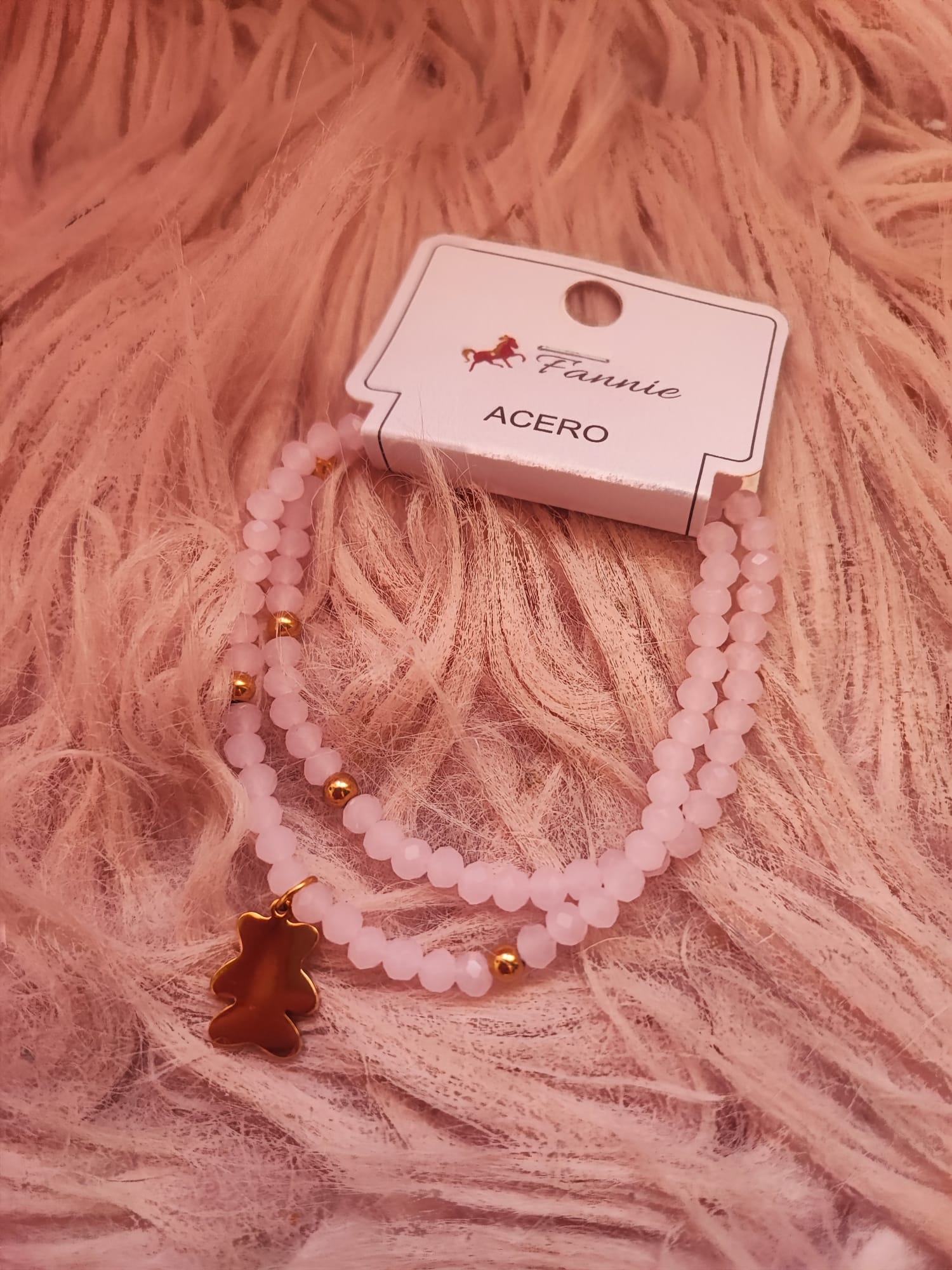 Bonitas pulseras dobles con bolitas de colores rosa o melocotón, decoradas con un osito o un corazón dorado. Ideales para darle un toque alegre y a la vez elegante a tu look. Material acero.