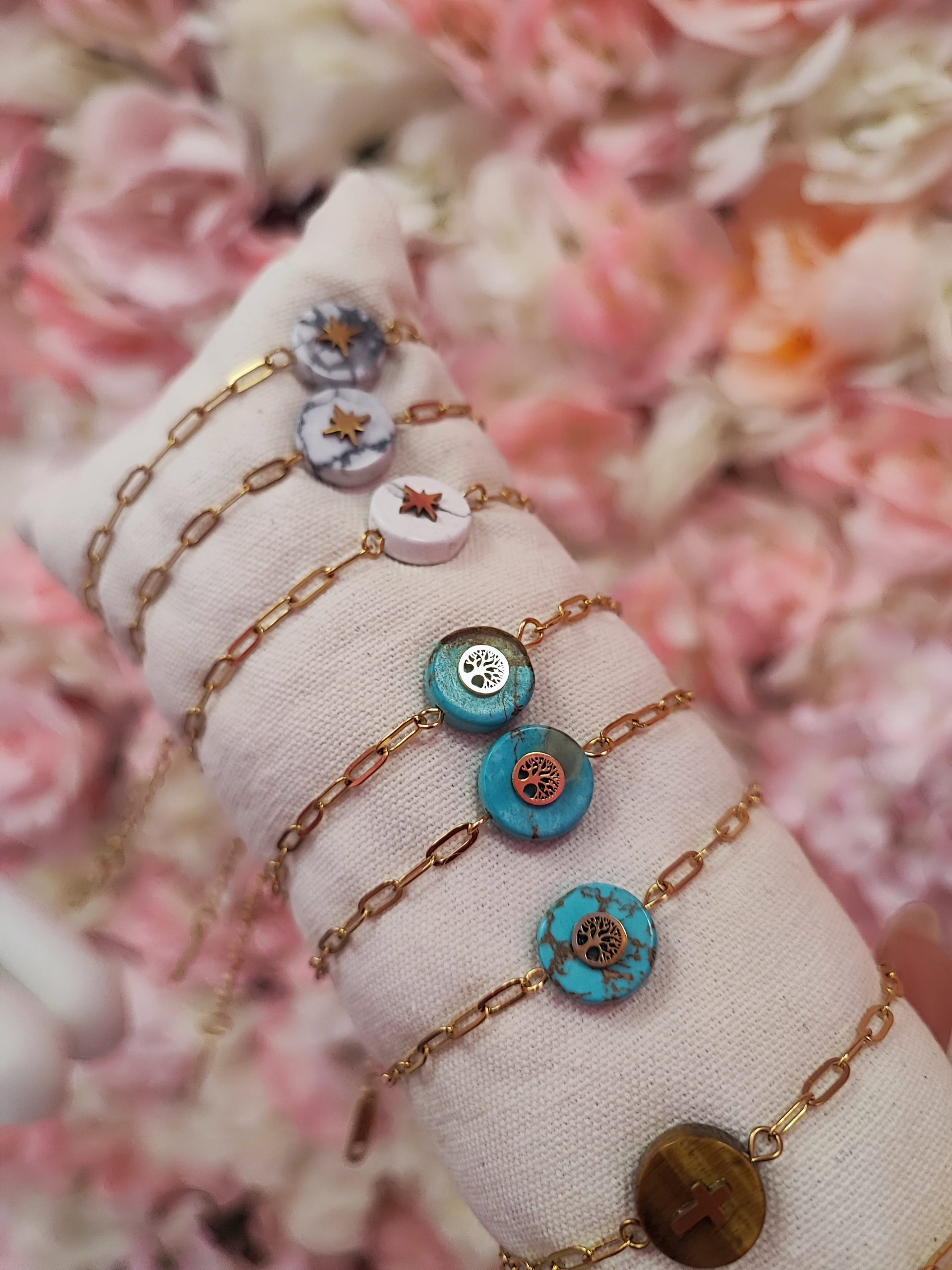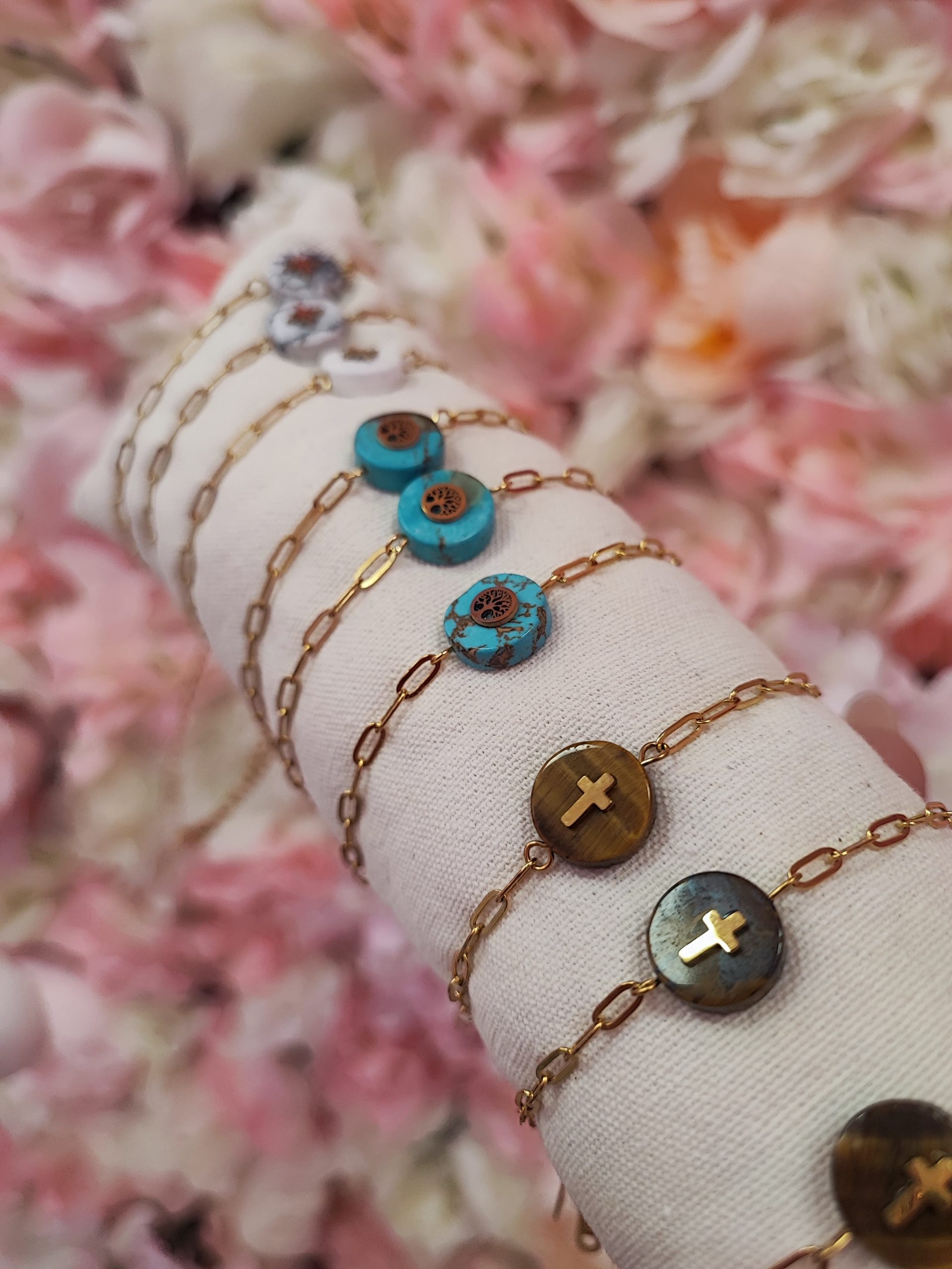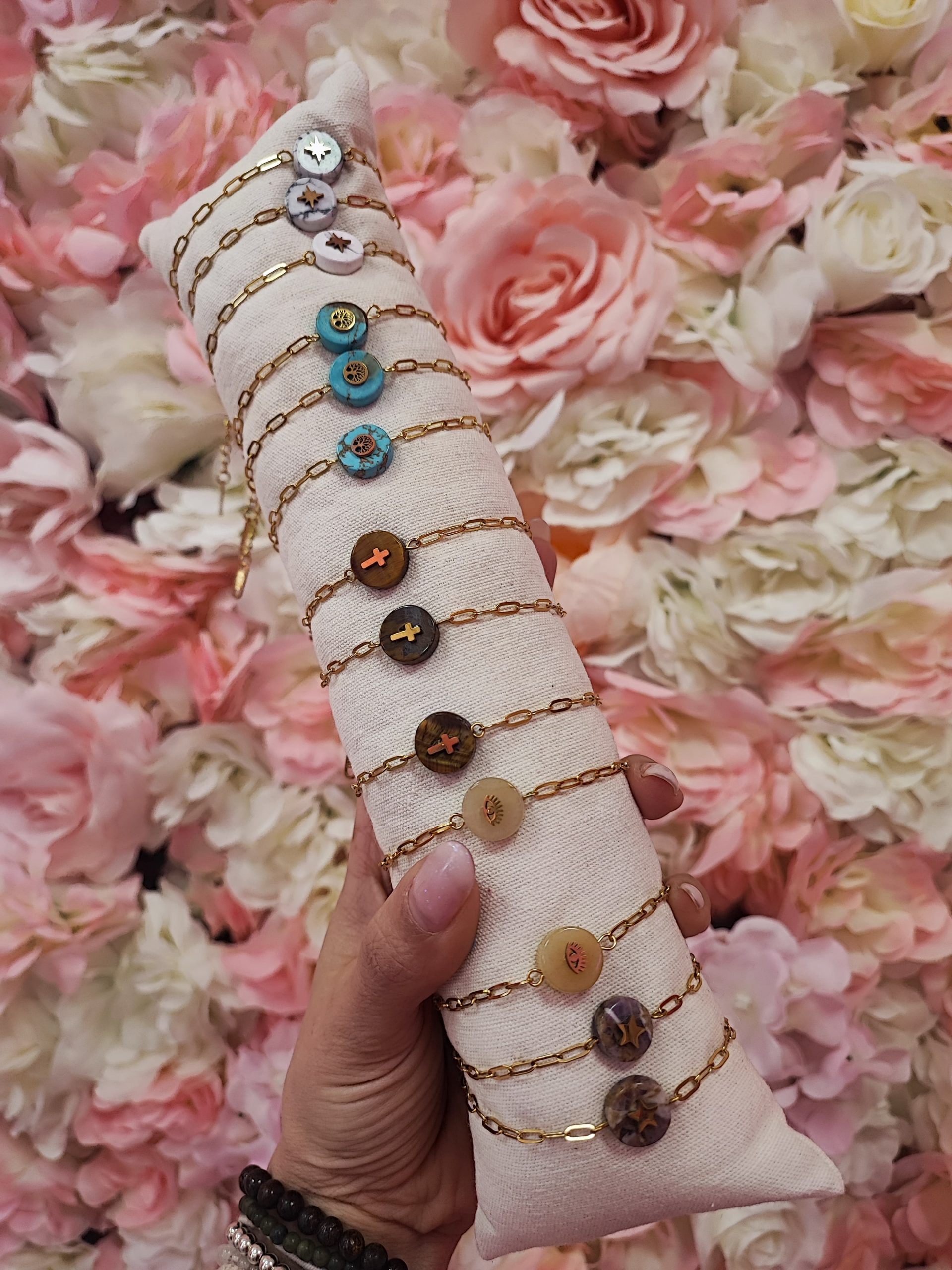 Dale un toque único y lleno de estilo a tu look con estas pulseras de acero inoxidable. Cada pieza cuenta con un eslabón fino dorado y un dije central tipo botón con detalles artesanales y coloridos que las hacen súper especiales. Son ligeras, resistentes al agua y perfectas para usar solas o combinadas entre sí.