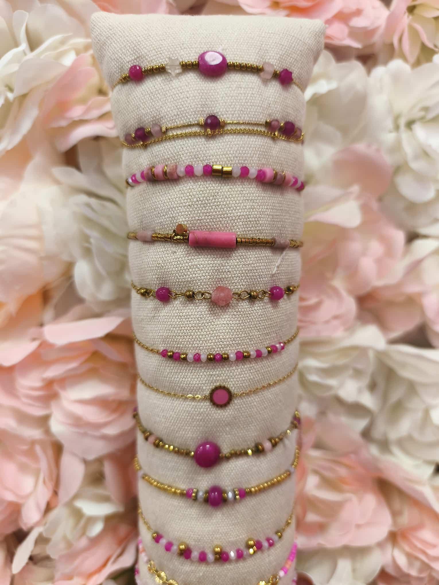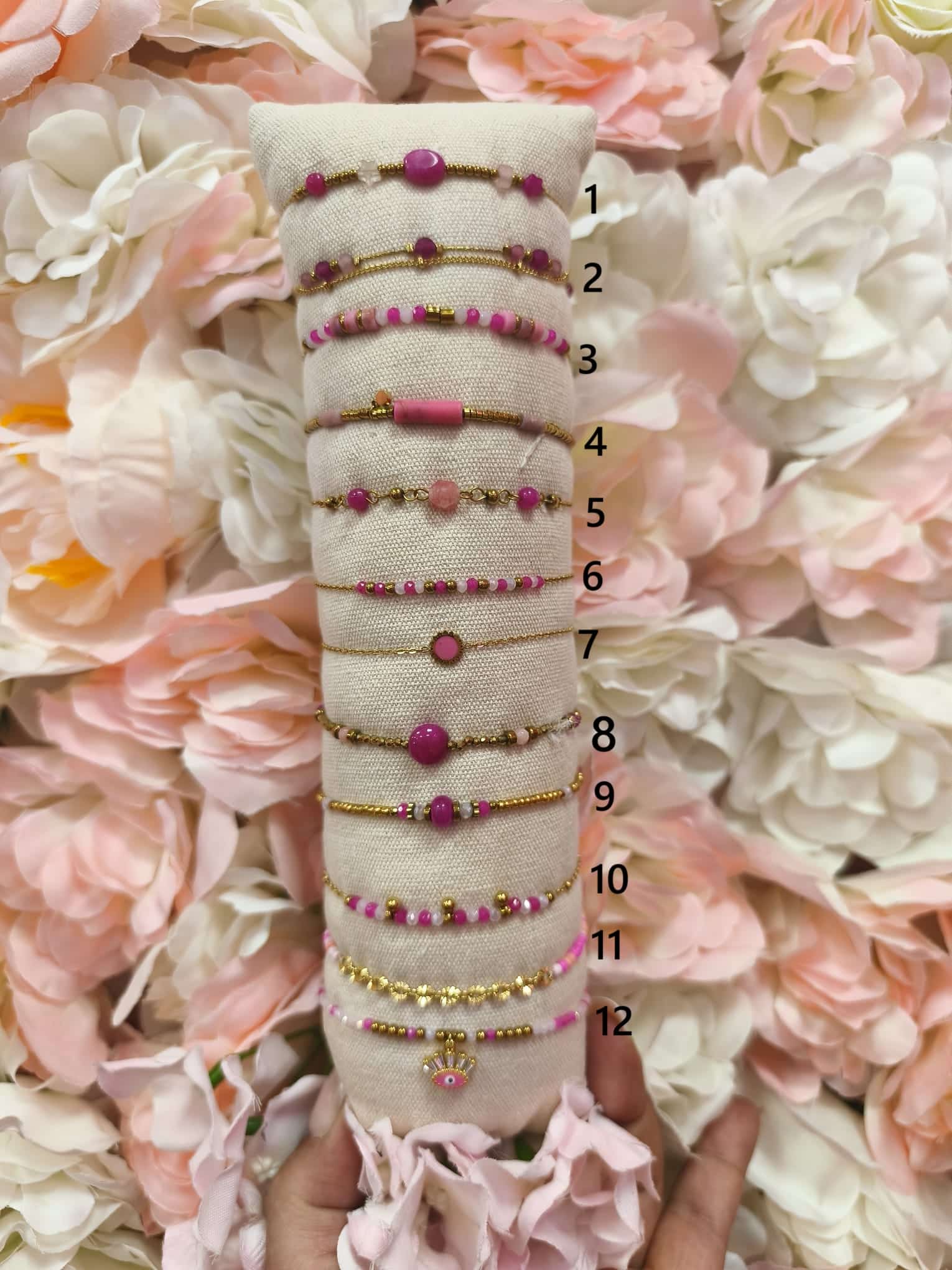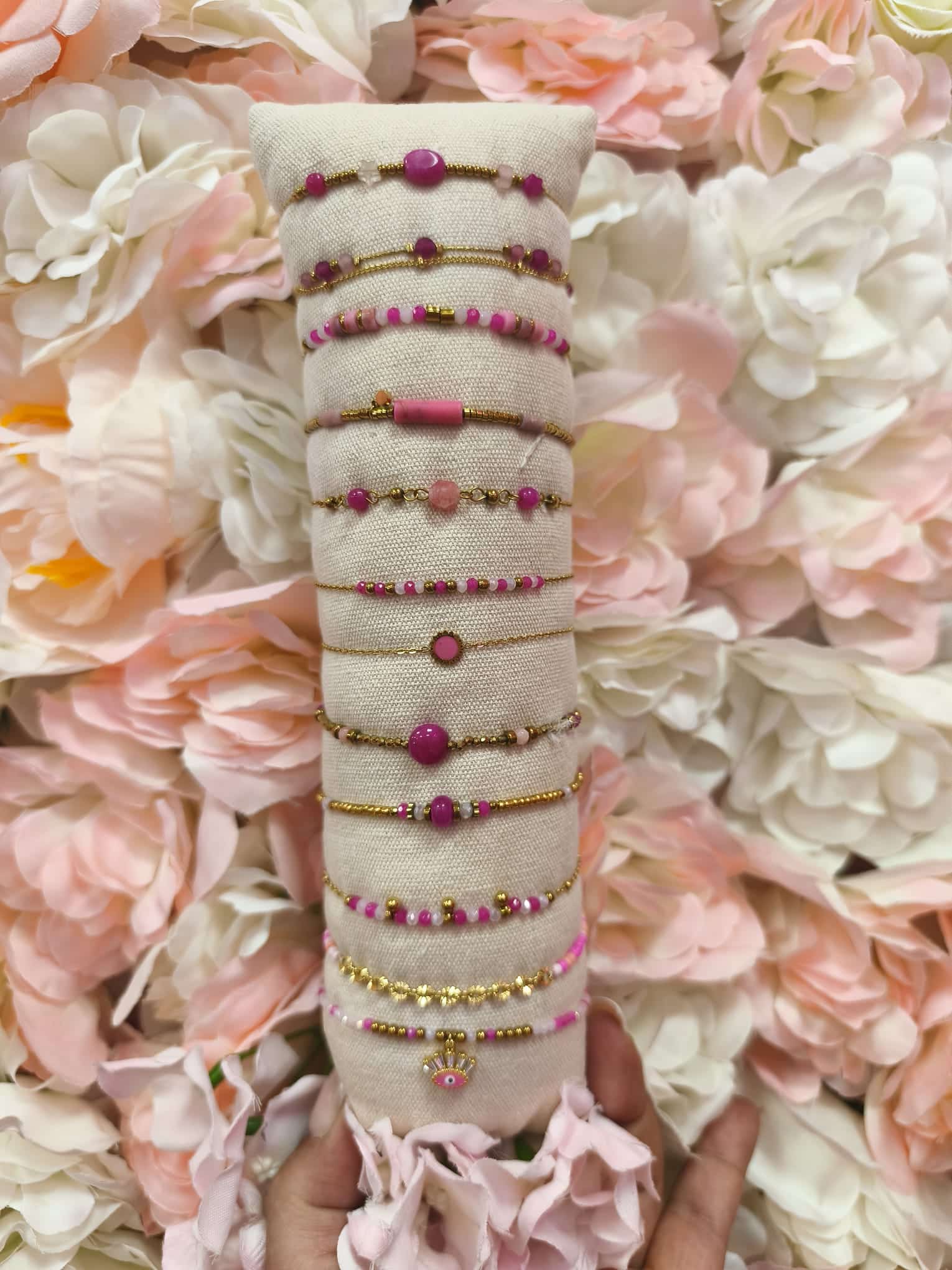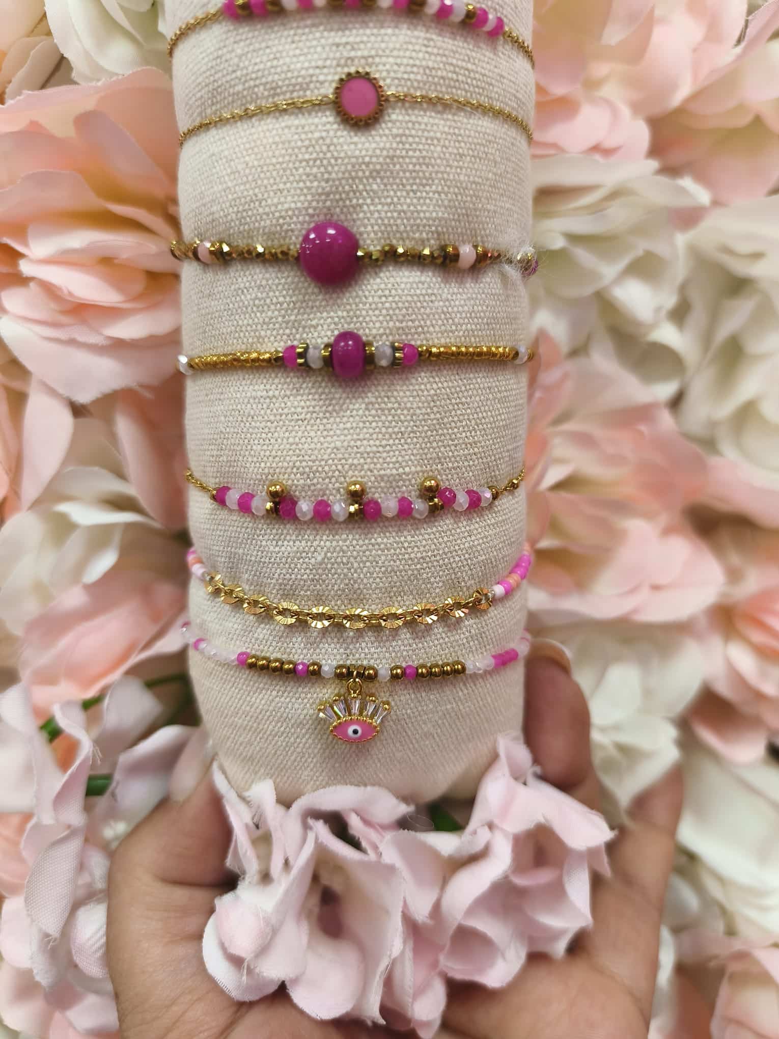 Dale un toque chic y femenino a tu look con estas preciosas pulseras de acero en tono dorado. Disponibles en 12 modelos diferentes, cada una tiene su encanto propio, decoradas con piedrecitas en tonos rosa y fucsia que brillan con la luz y resaltan sobre la piel.