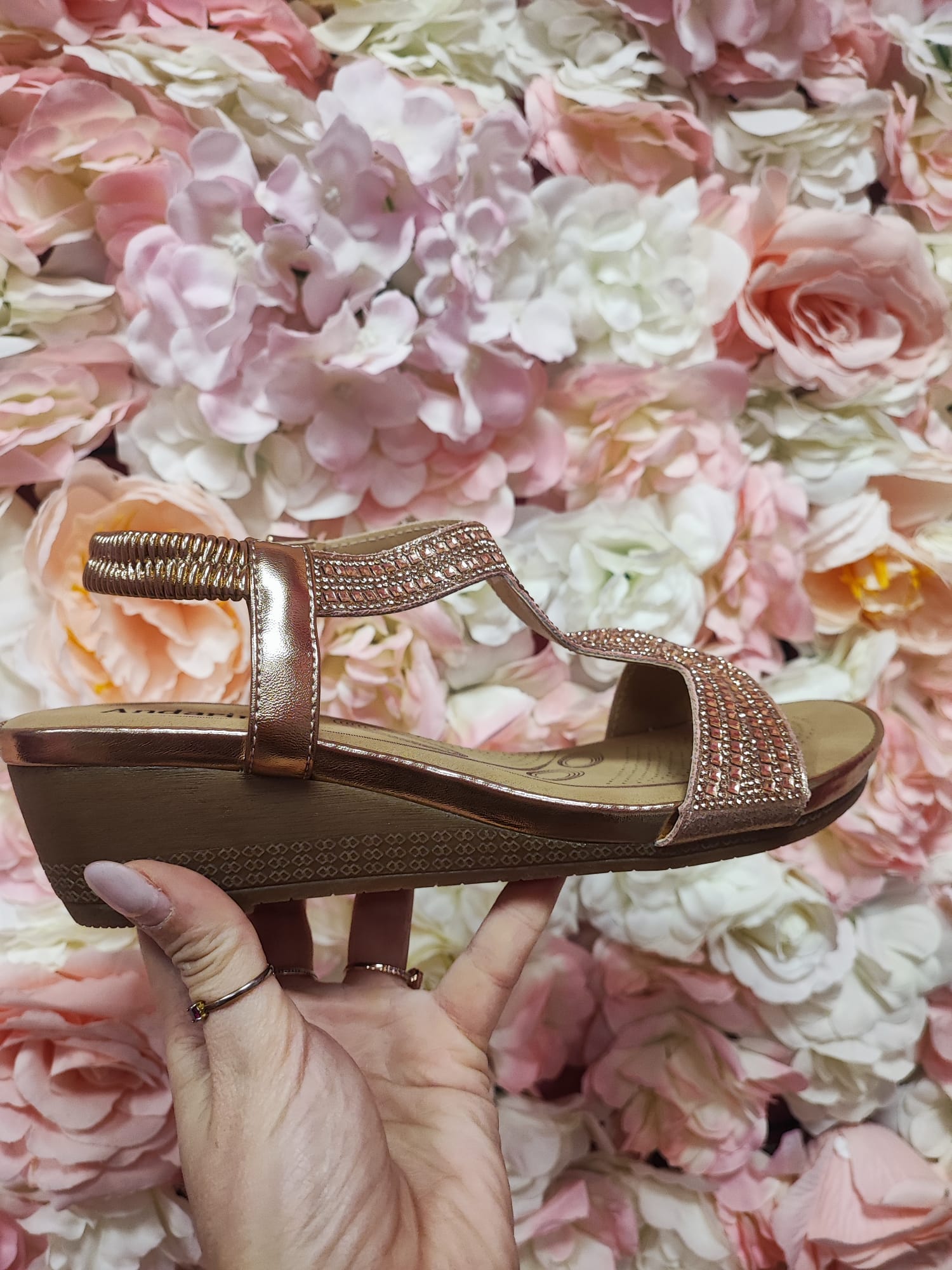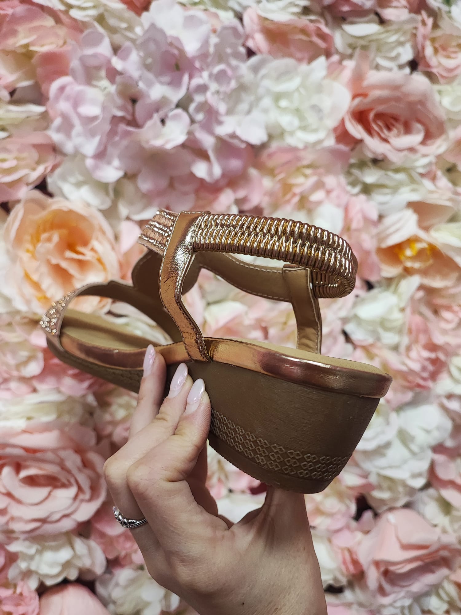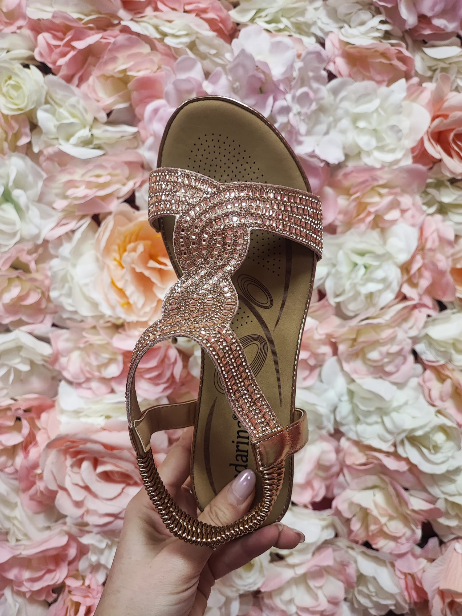 Dale un toque de brillo y sofisticación a tu outfit con esta hermosa sandalia en tono dorado/rosa metálico. Diseñada con un elegante patrón de pedrería que resalta su estilo glamuroso, perfecta para cualquier ocasión.