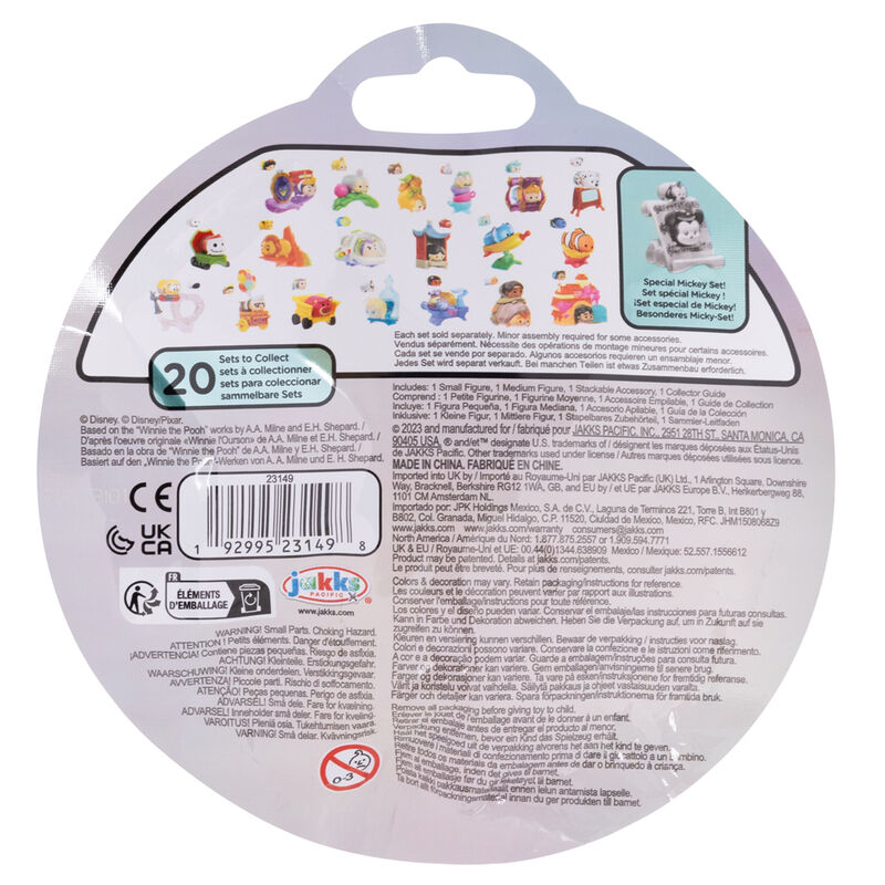 Cada Mystery incluye una figura Tsum Tsum de tamaño mediano, una figura Tsum Tsum de tamaño pequeño y un accesorio inspirado en su historia. El accesorio es apilable y se puede utilizar para apilar la figura Tsum Tsum mediana y pequeña sola o para formar una pila aún más alta. Cada set incluye una Guía del Coleccionista con los 100 sets coleccionables de las Series 1 a 4, ¡ideal para planificar tu colección!