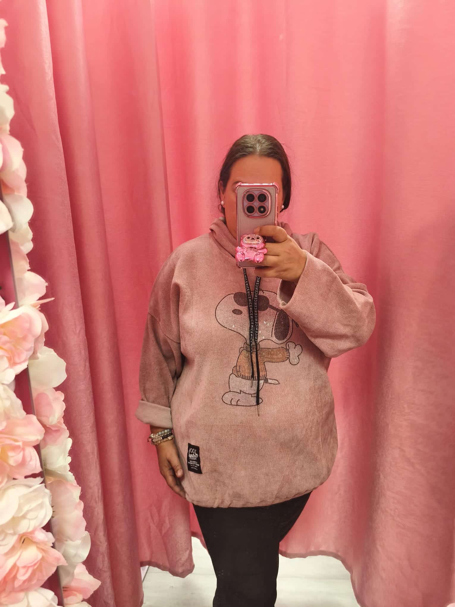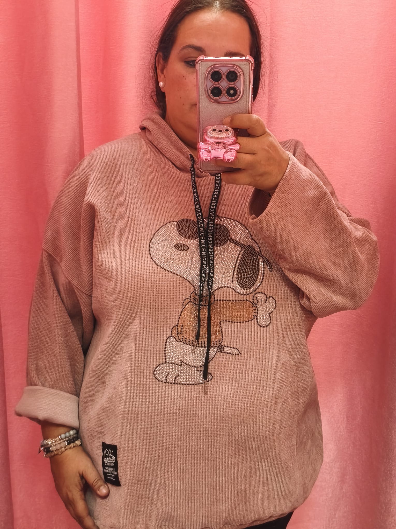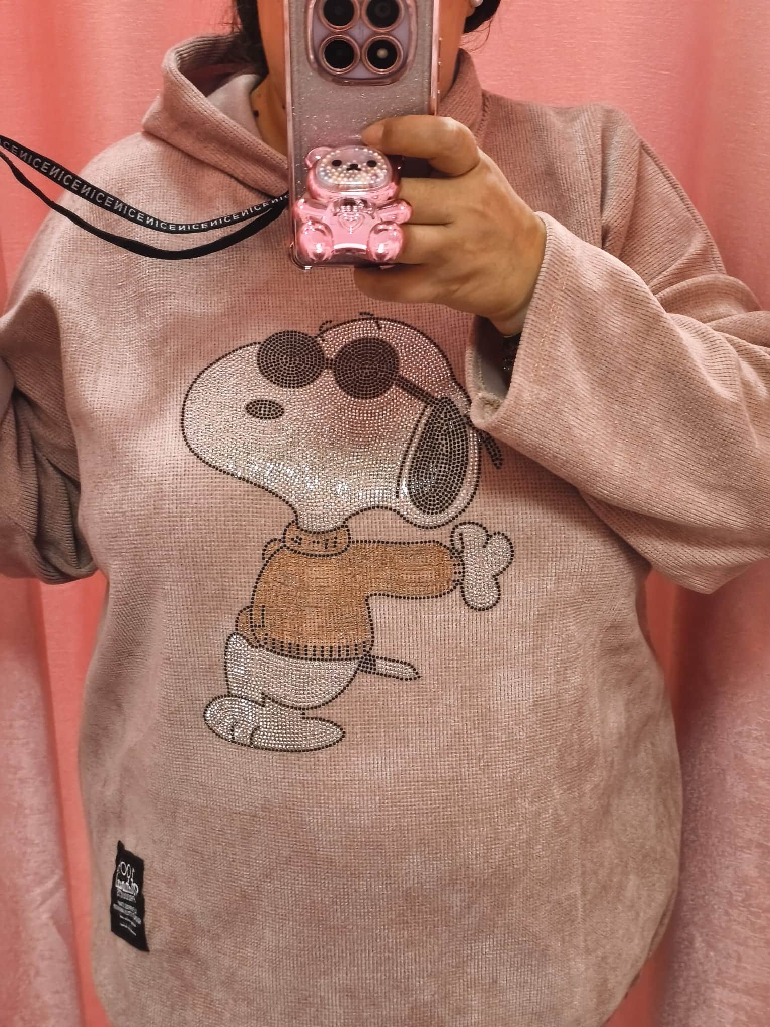 Comodidad y estilo en una sola prenda. Esta sudadera en tono marrón claro destaca por su diseño relajado y la ilustración de Snoopy decorada con piedrecitas brillantes, que le dan un toque divertido y único.