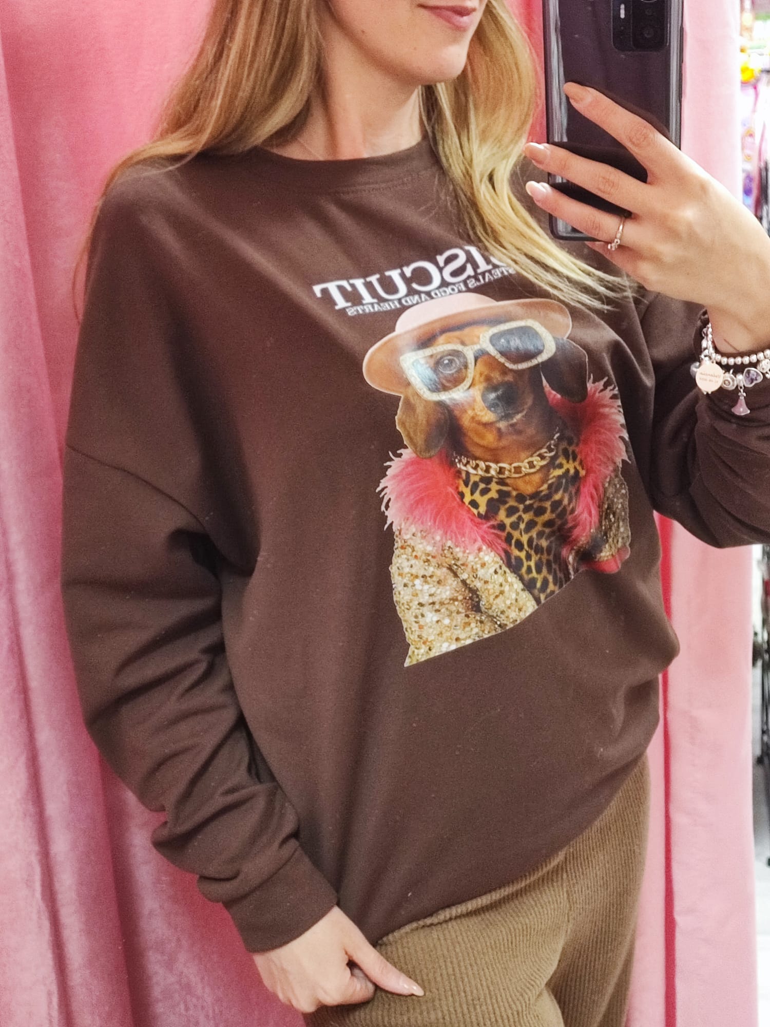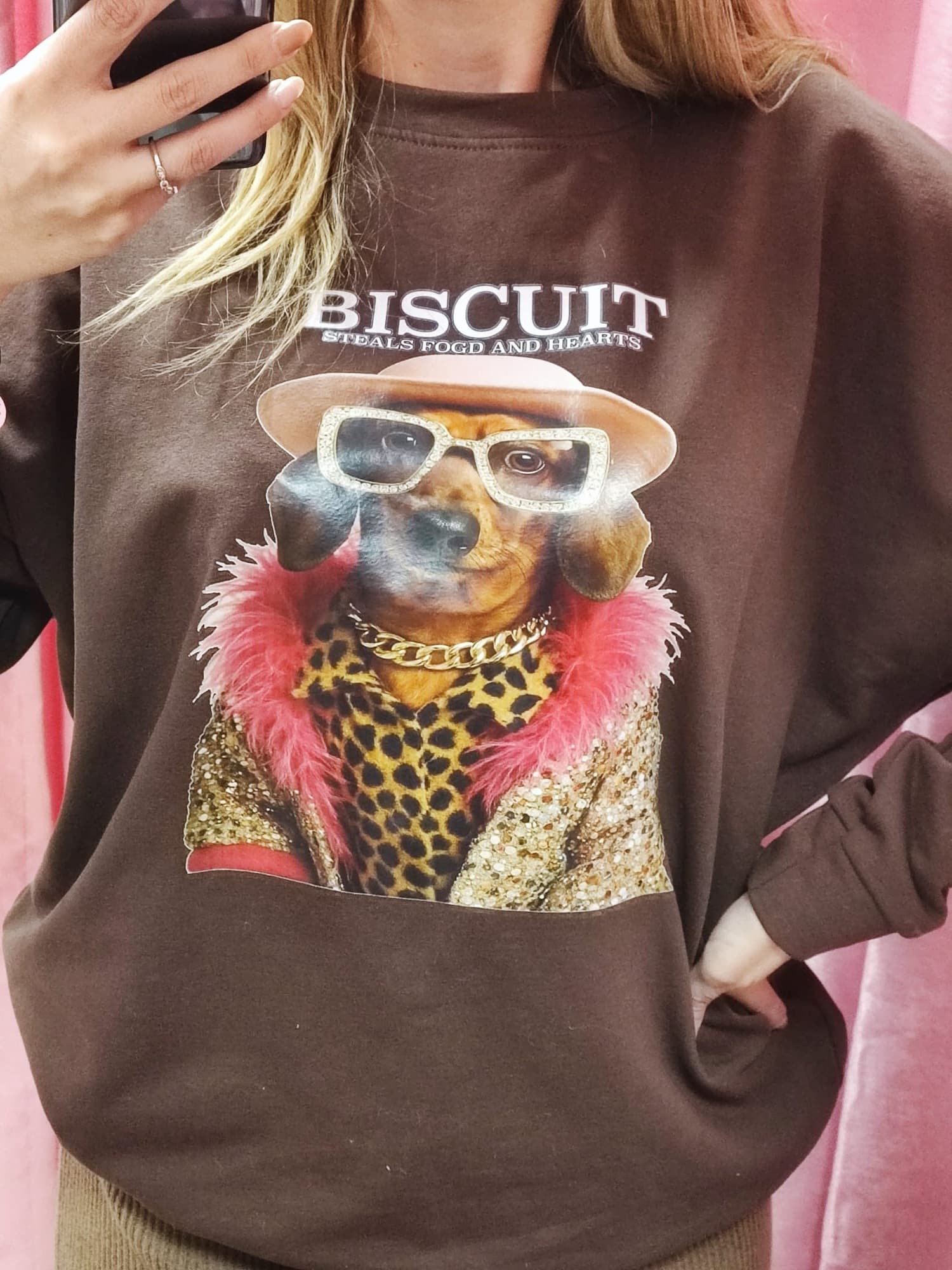 Su diseño combina humor y moda: el texto “BISCUIT – Steals food and hearts” refleja su toque divertido.