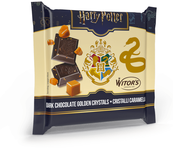Esta deliciosa tableta combina el intenso sabor del chocolate negro con el toque crujiente y dulce de los cristales de caramelo dorado, creando una experiencia única digna de cualquier casa de magia ??