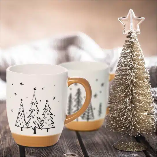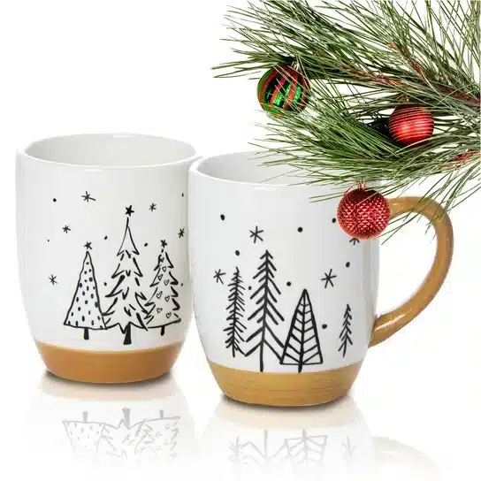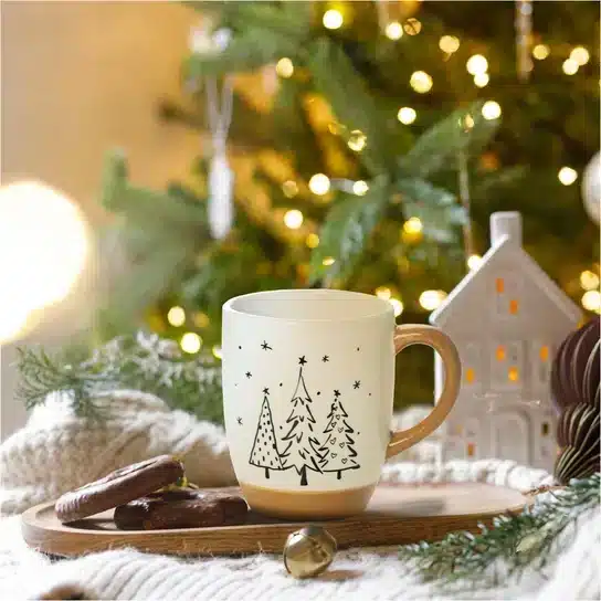 Empieza tus mañanas con espíritu navideño con esta preciosa taza de cerámica decorada con elegantes árboles de Navidad en blanco y negro. Su diseño nórdico y su toque rústico en color caramelo la hacen perfecta para tus cafés, infusiones o chocolates calientes. ?