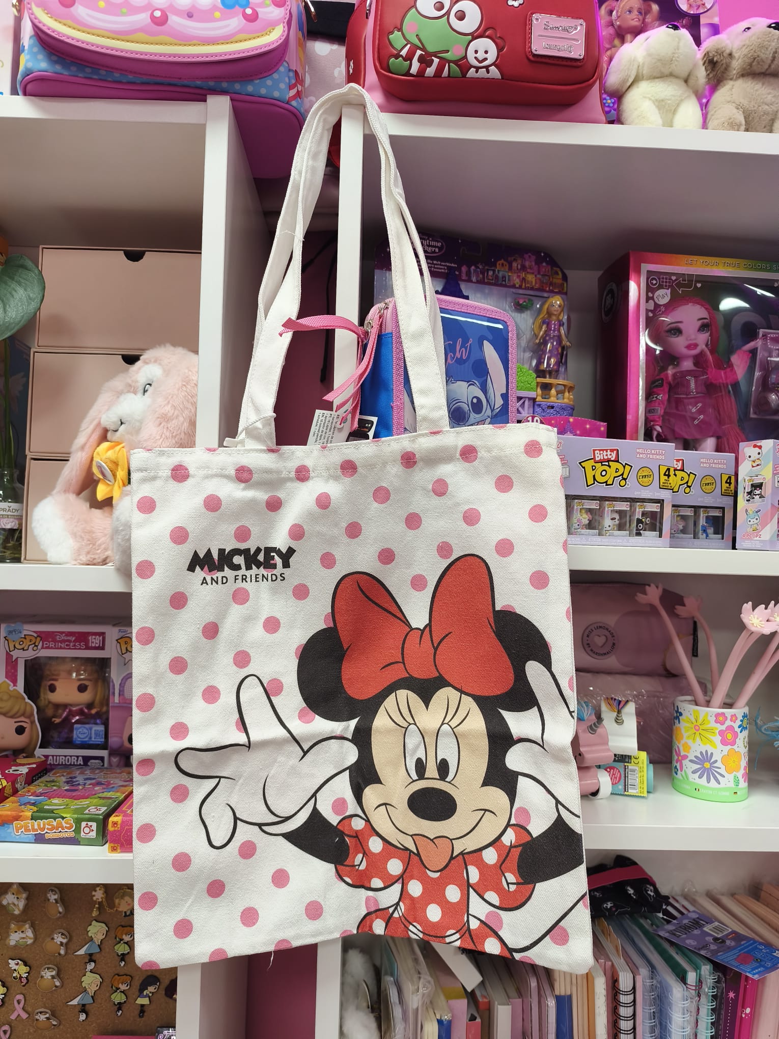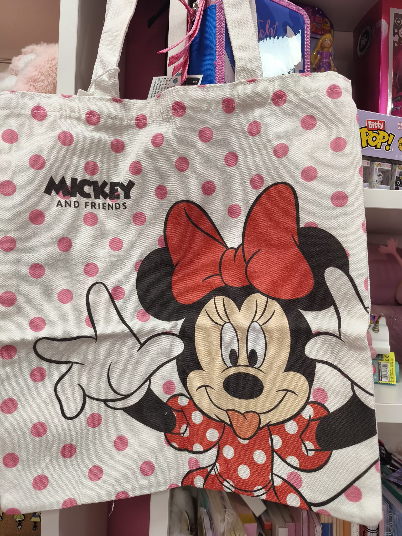 Esta preciosa bolsa tote de Minnie Mouse es perfecta para tus días de paseo, compras o para llevar al trabajo o la universidad. Su diseño alegre con fondo de lunares rosas y la icónica Minnie con su lazo rojo le da un toque tierno y divertido que nunca pasa de moda.