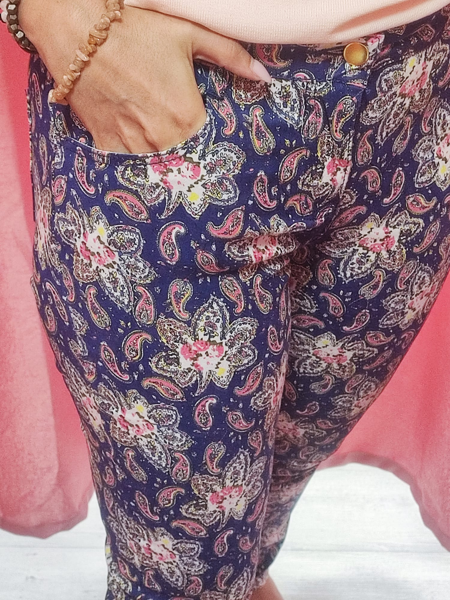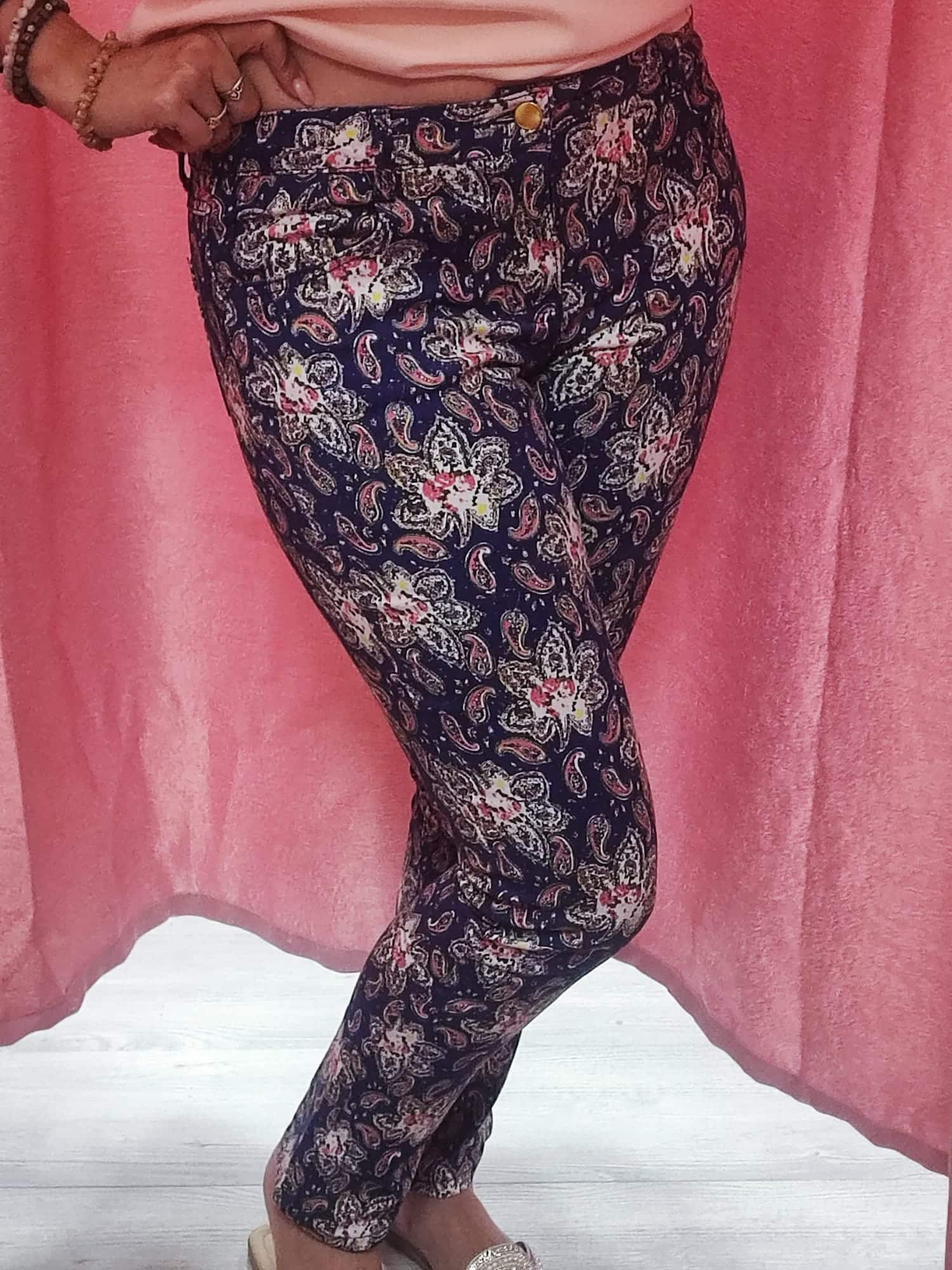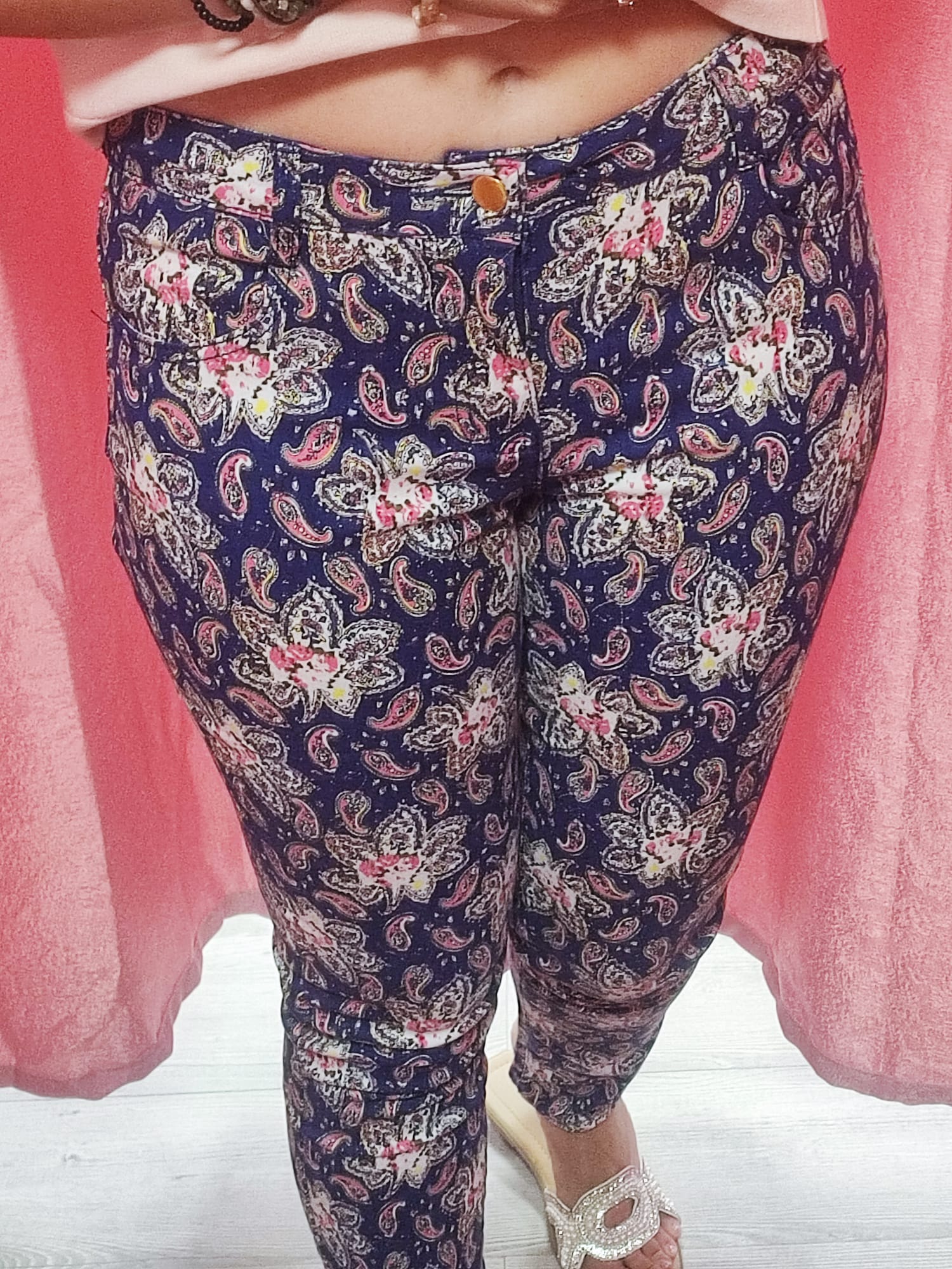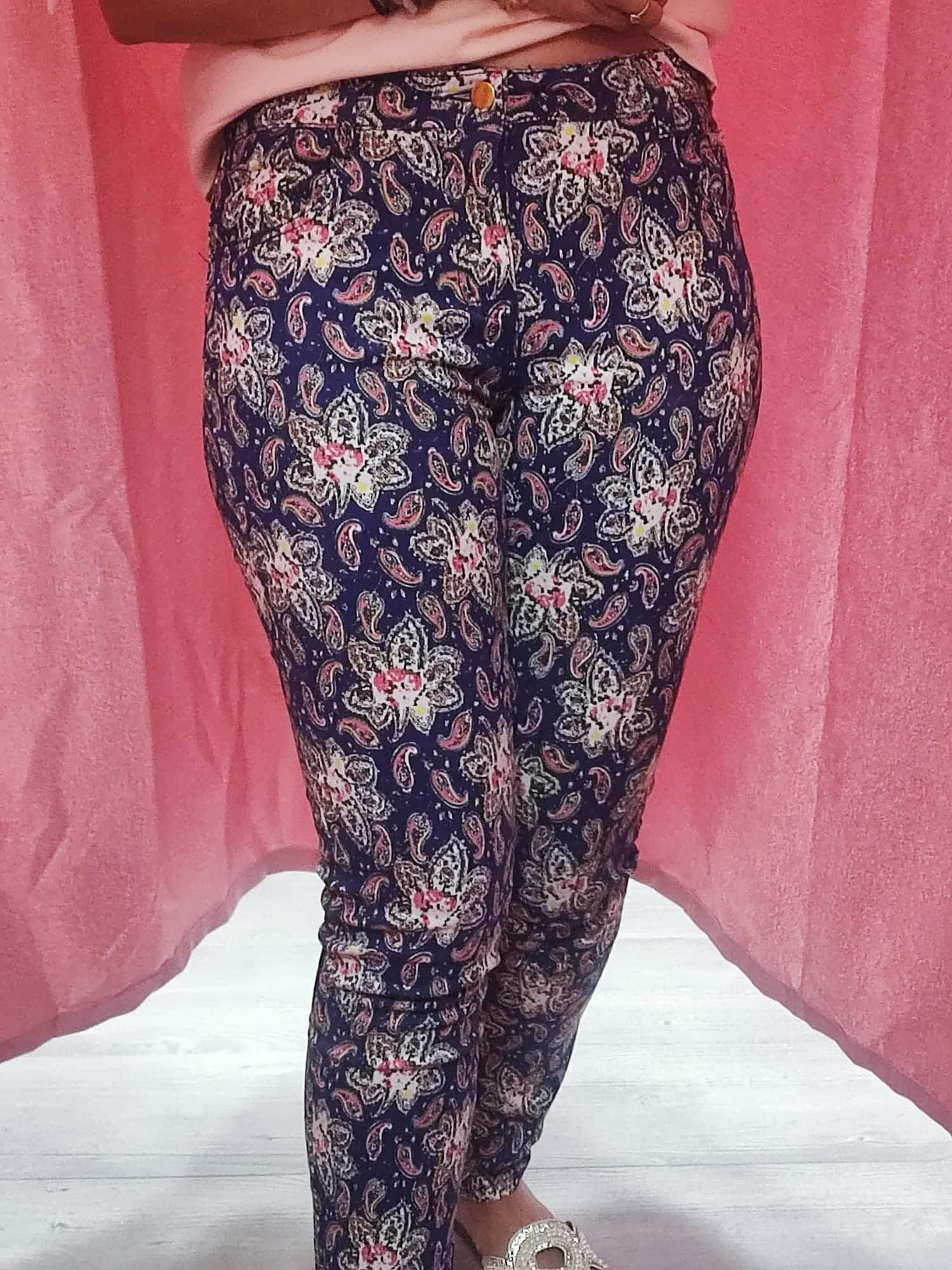 ¡Dale vida a tu outfit con estos vaqueros elásticos de tiro medio y estampado floral-paisley! Su tejido flexible se adapta a tus curvas, brindándote total comodidad sin renunciar al estilo. El fondo azul marino contrasta con detalles florales en tonos rosa, blanco y mostaza, logrando un look fresco, femenino y muy chic.