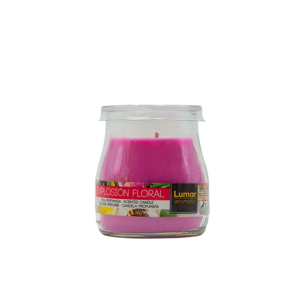 Vela de cera vegetal con fragancia Explosión Floral. Presentada en formato yogurt de cristal 100% reciclable y etiqueta decorativa LUMAR AROMATIC.
