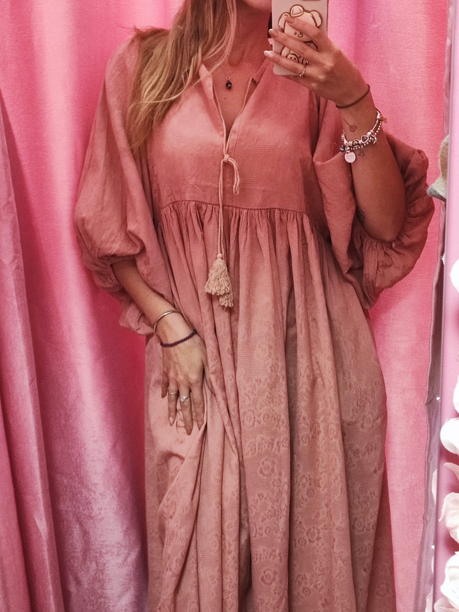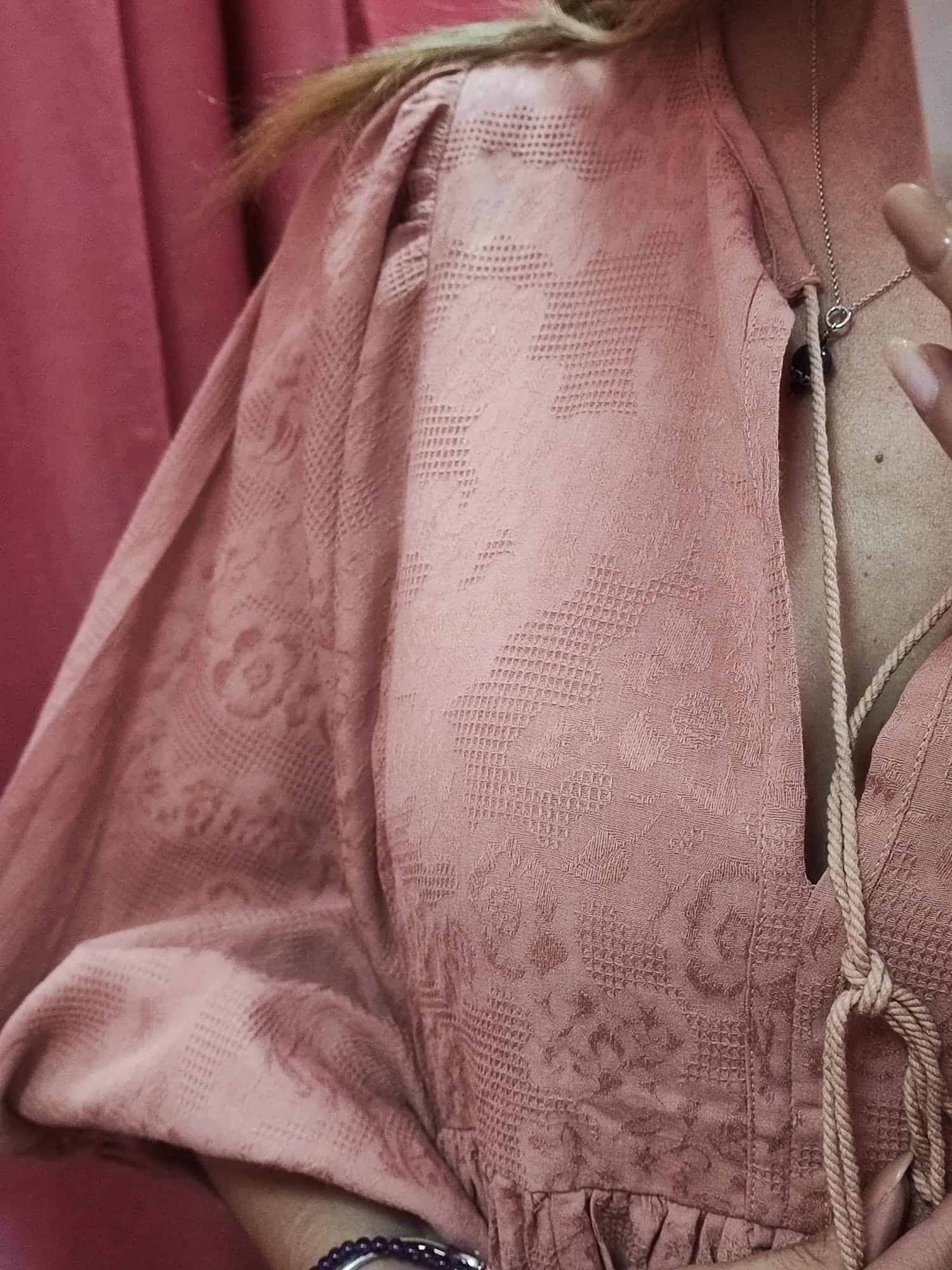 Este diseño tiene un aire romántico y relajado que lo hace ideal para cualquier ocasión. Su tejido con relieve floral y su corte fluido aportan movimiento y un toque bohemio irresistible.