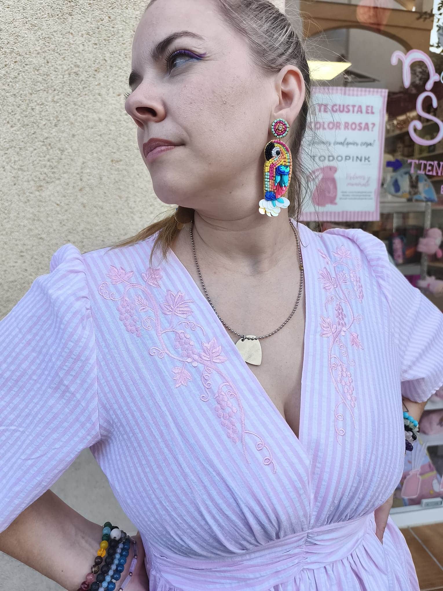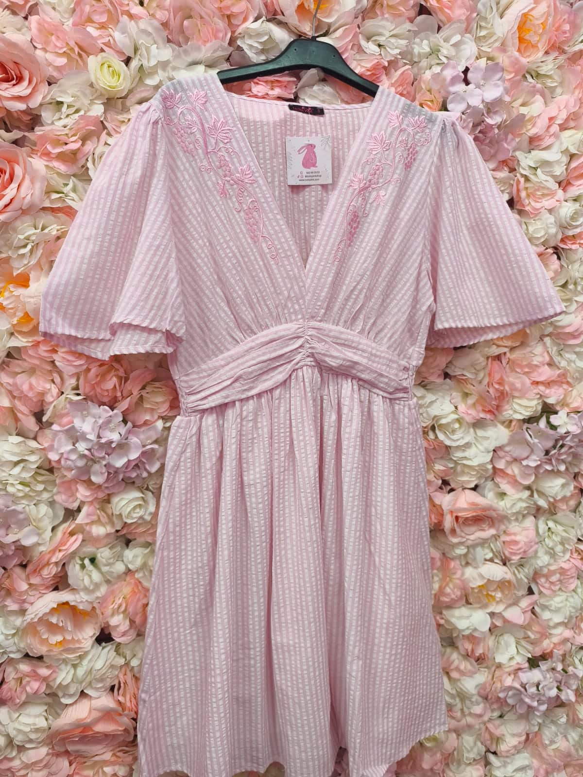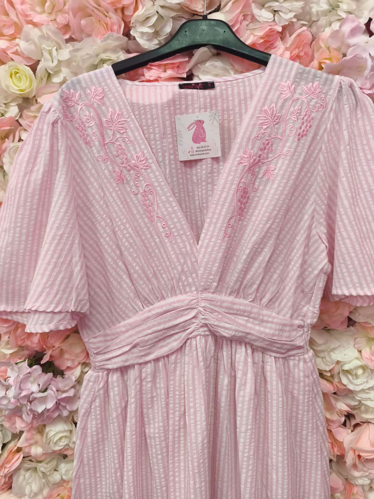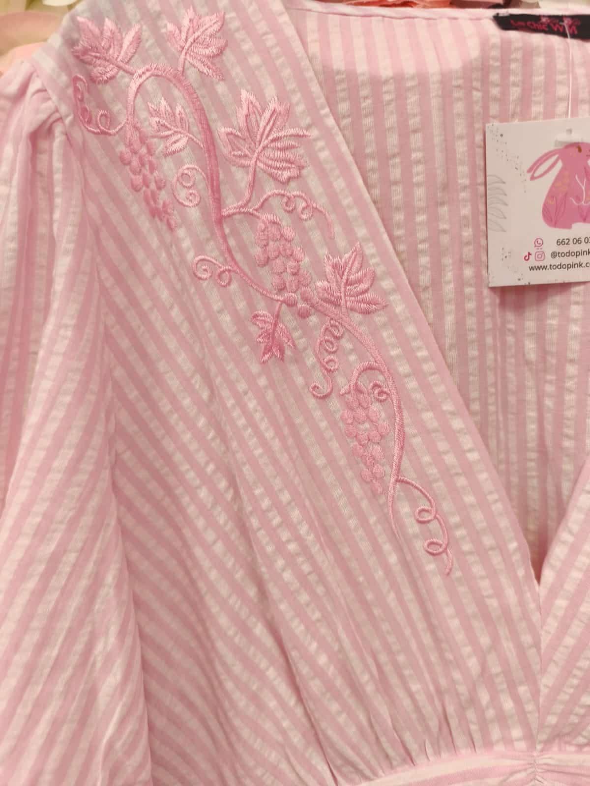 Luce femenina y fresca con este encantador vestido rosa de corte midi. Confeccionado en una tela ligera con delicadas rayas blancas y detalles bordados florales en el pecho, este vestido es ideal para días soleados, salidas casuales o eventos especiales.