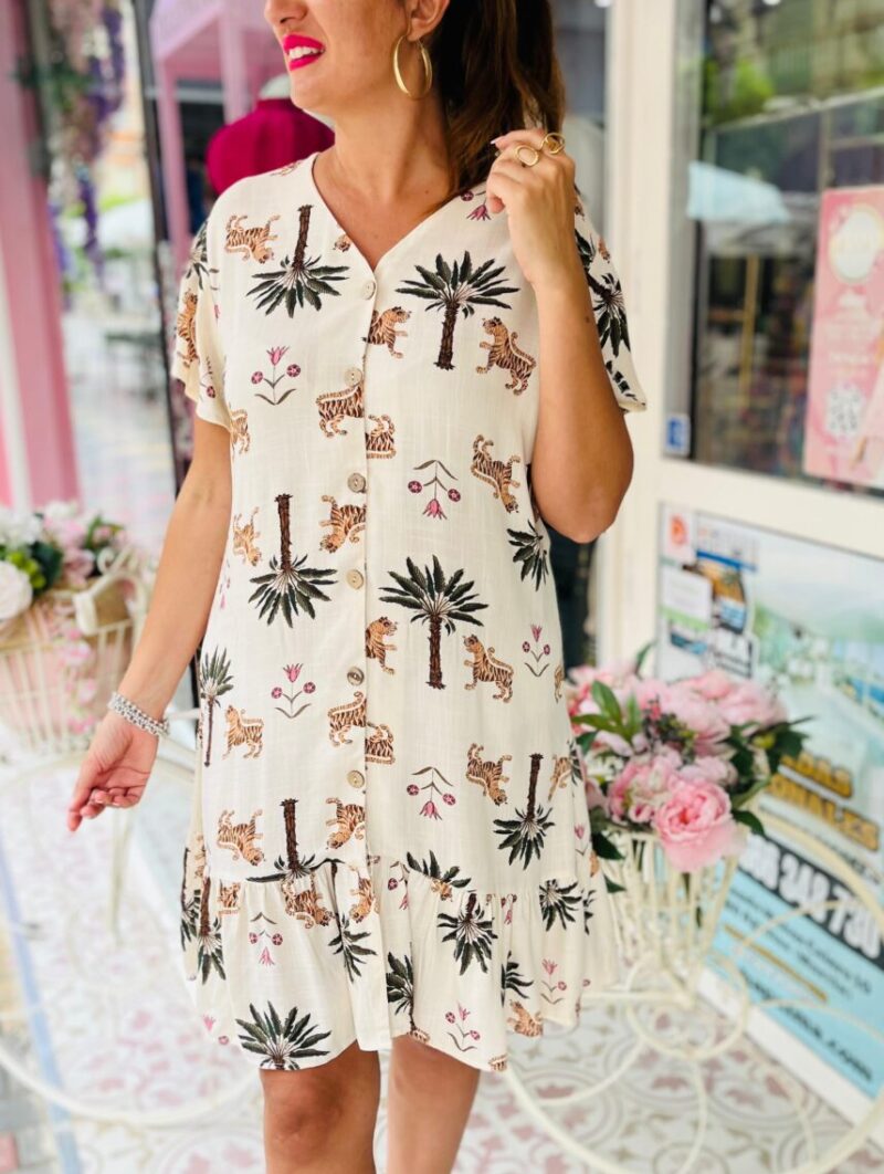 Diseño con estampado exclusivo de tigres y palmeras que le da un toque divertido y tropical.
