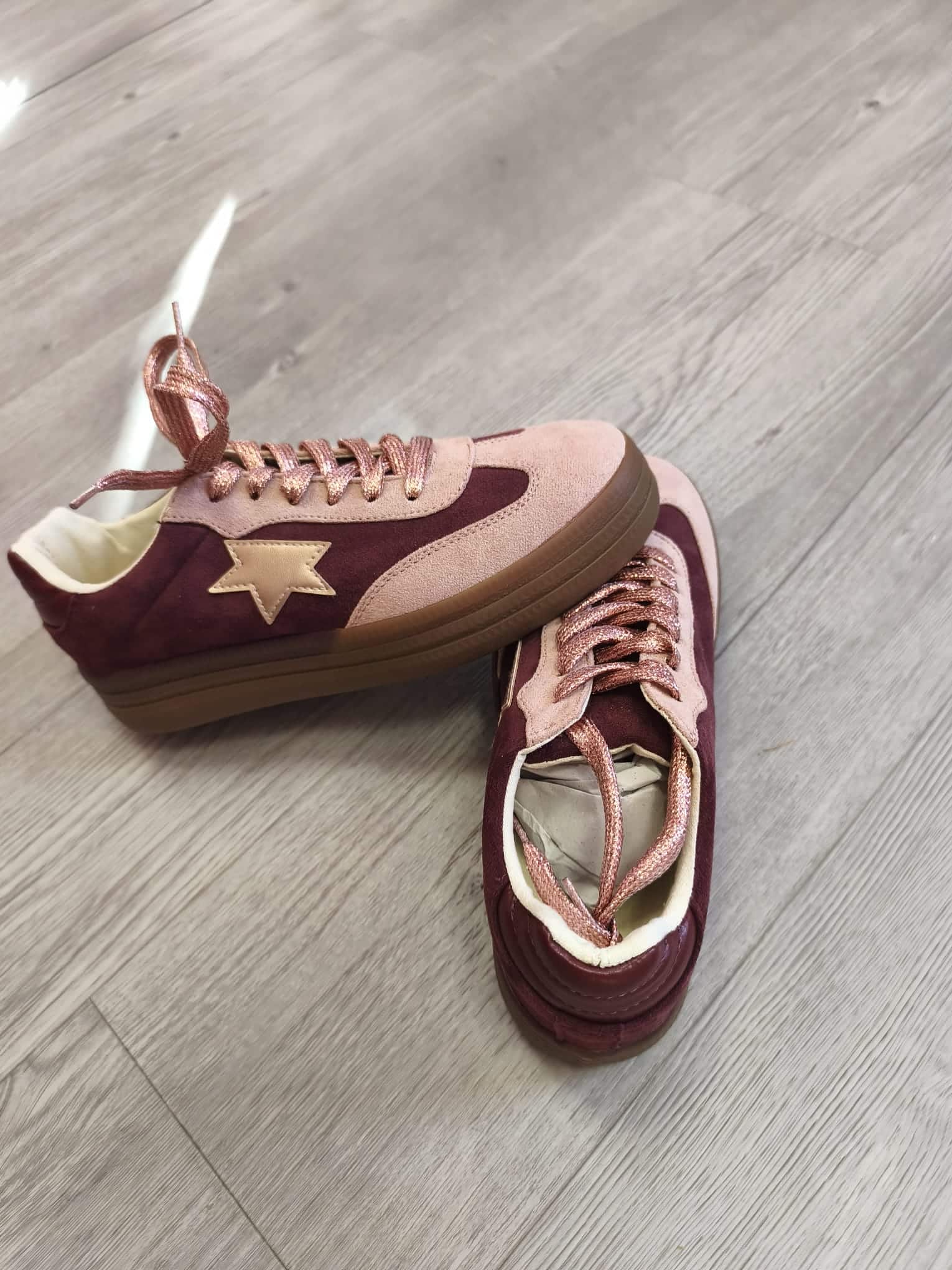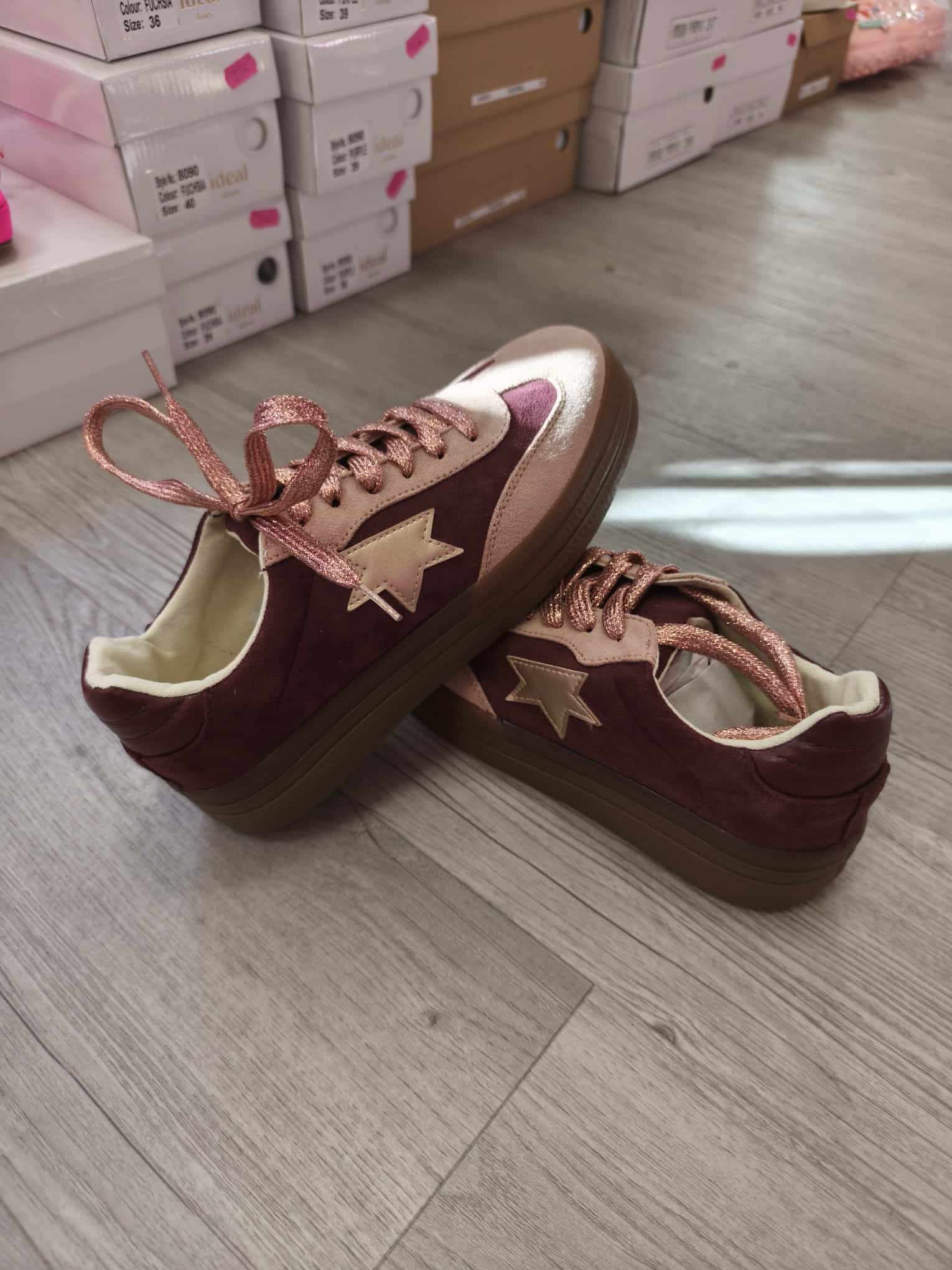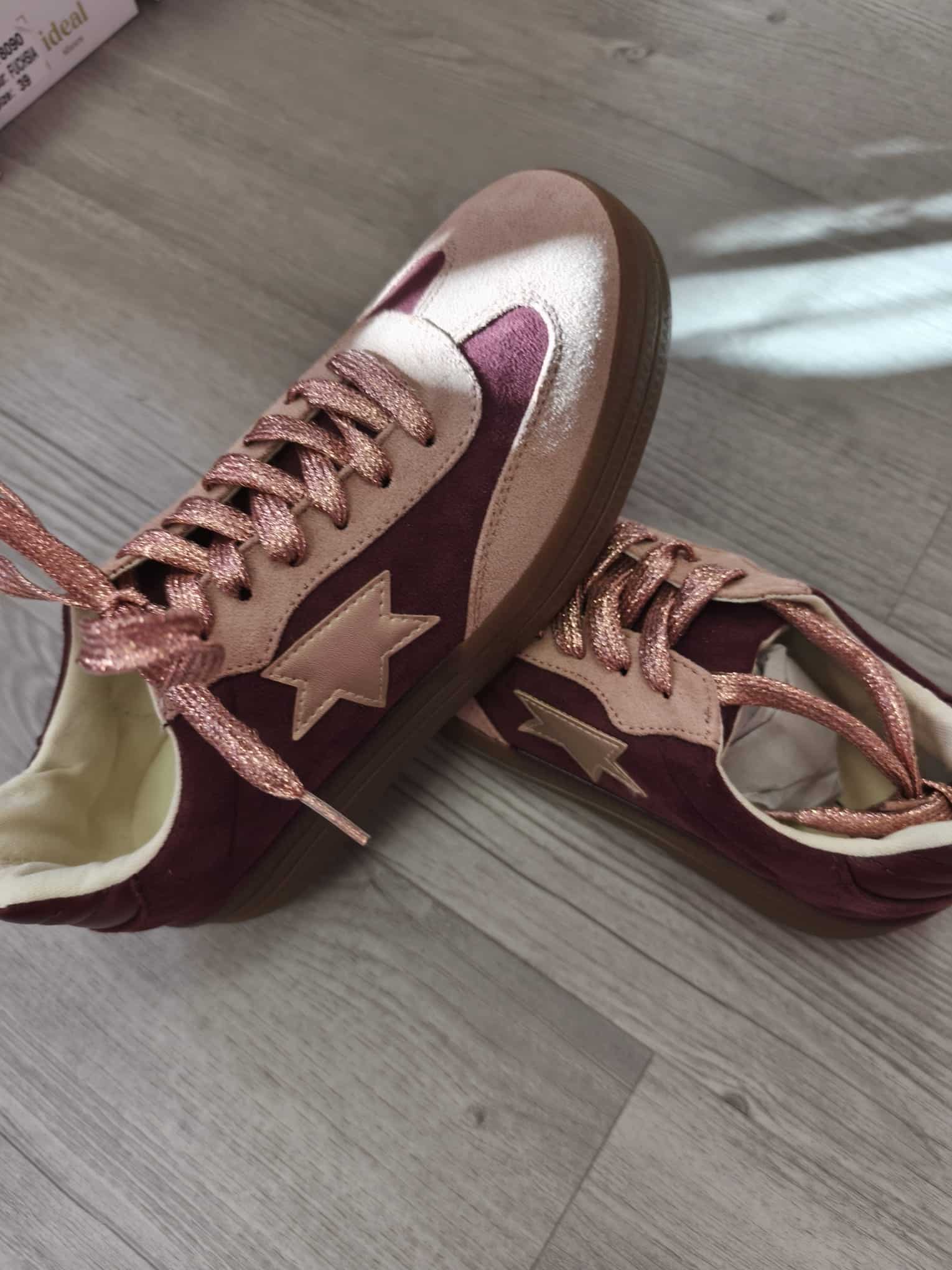 Dale un toque único a tus looks con estas zapatillas en tonos rosa metálico y burdeos, llenas de estilo y personalidad. El detalle de estrella y sus agujetas brillantes hacen que no pasen desapercibidas. ¡Perfectas para quienes aman destacar con estilo!